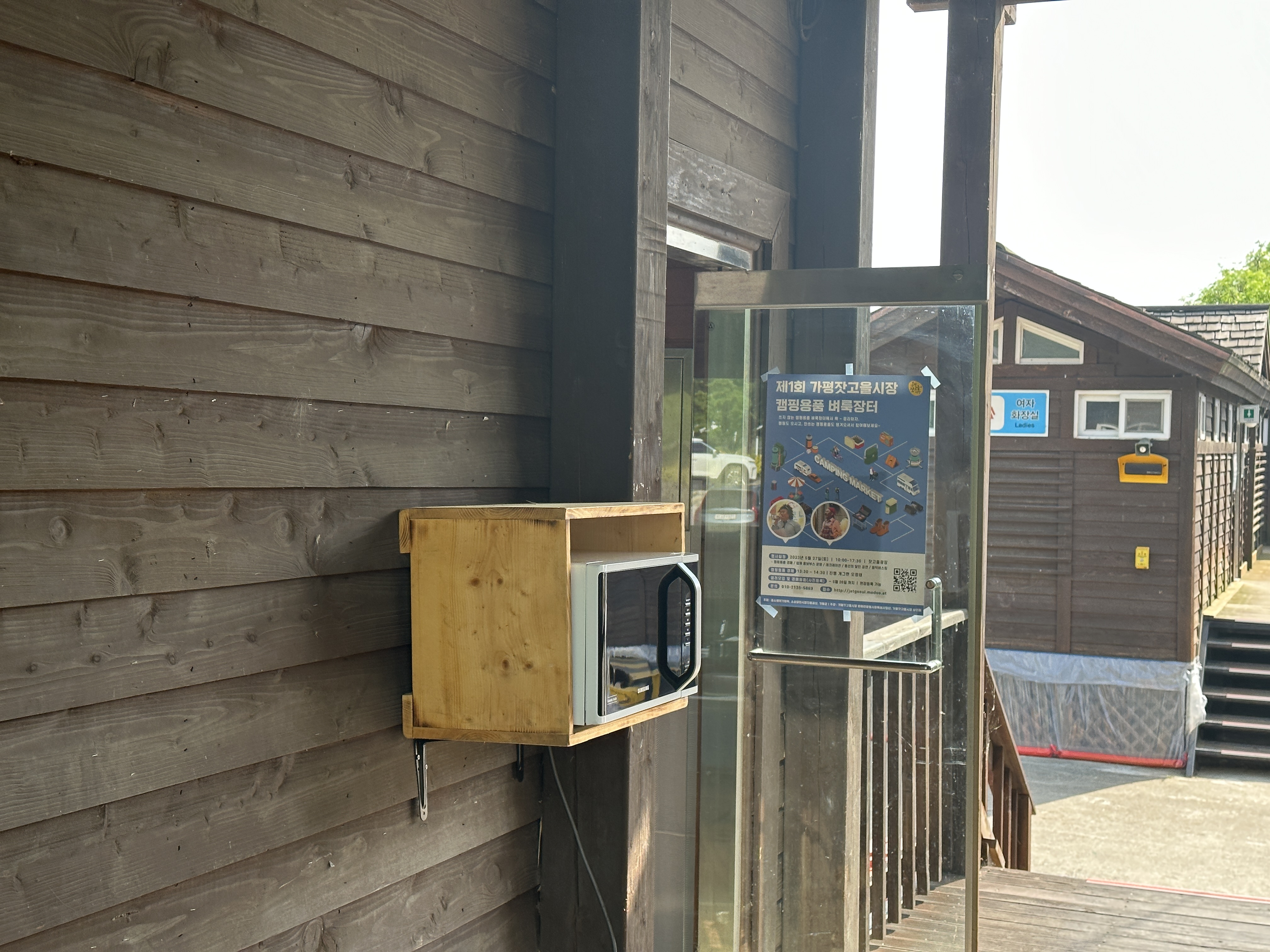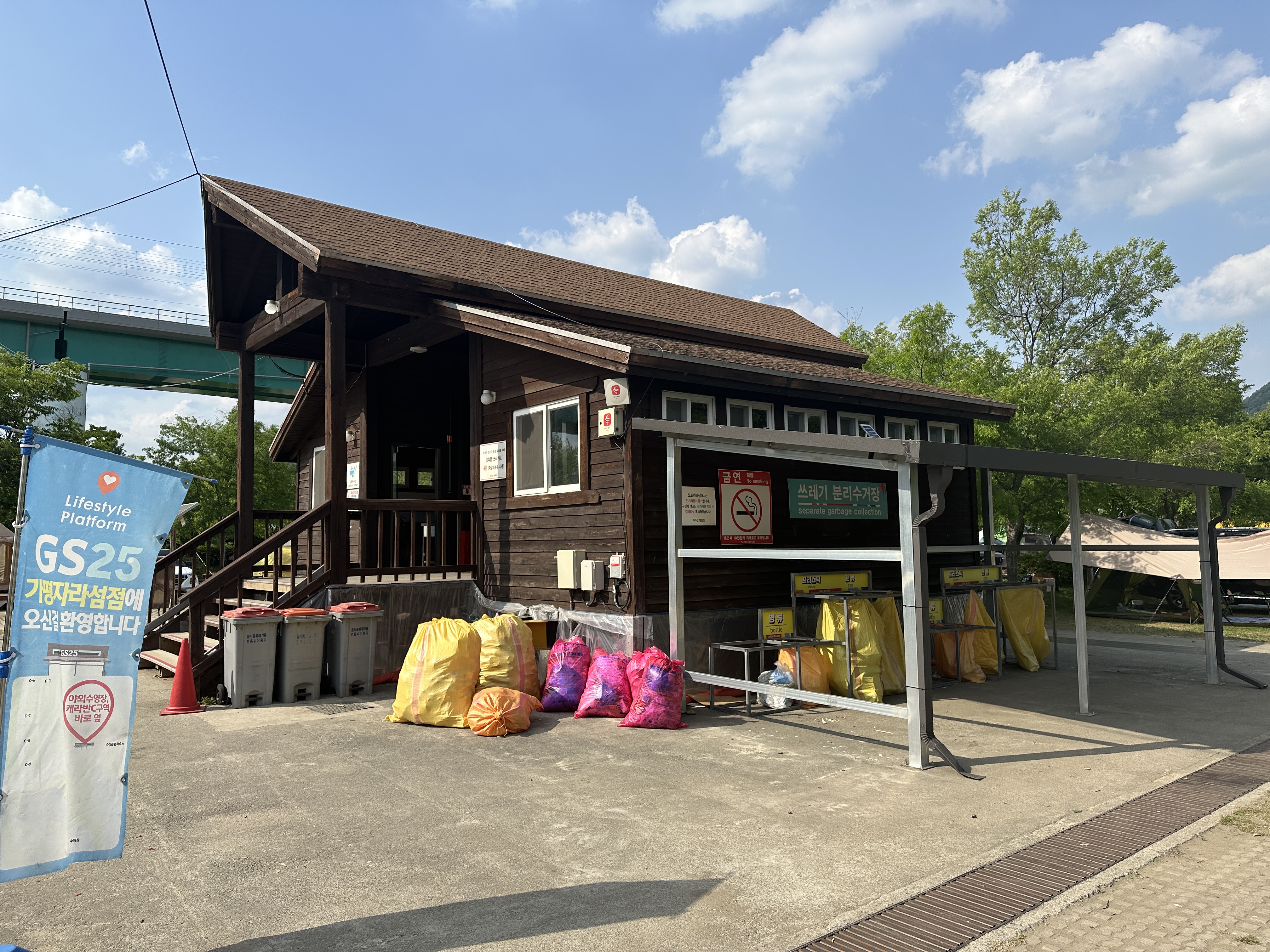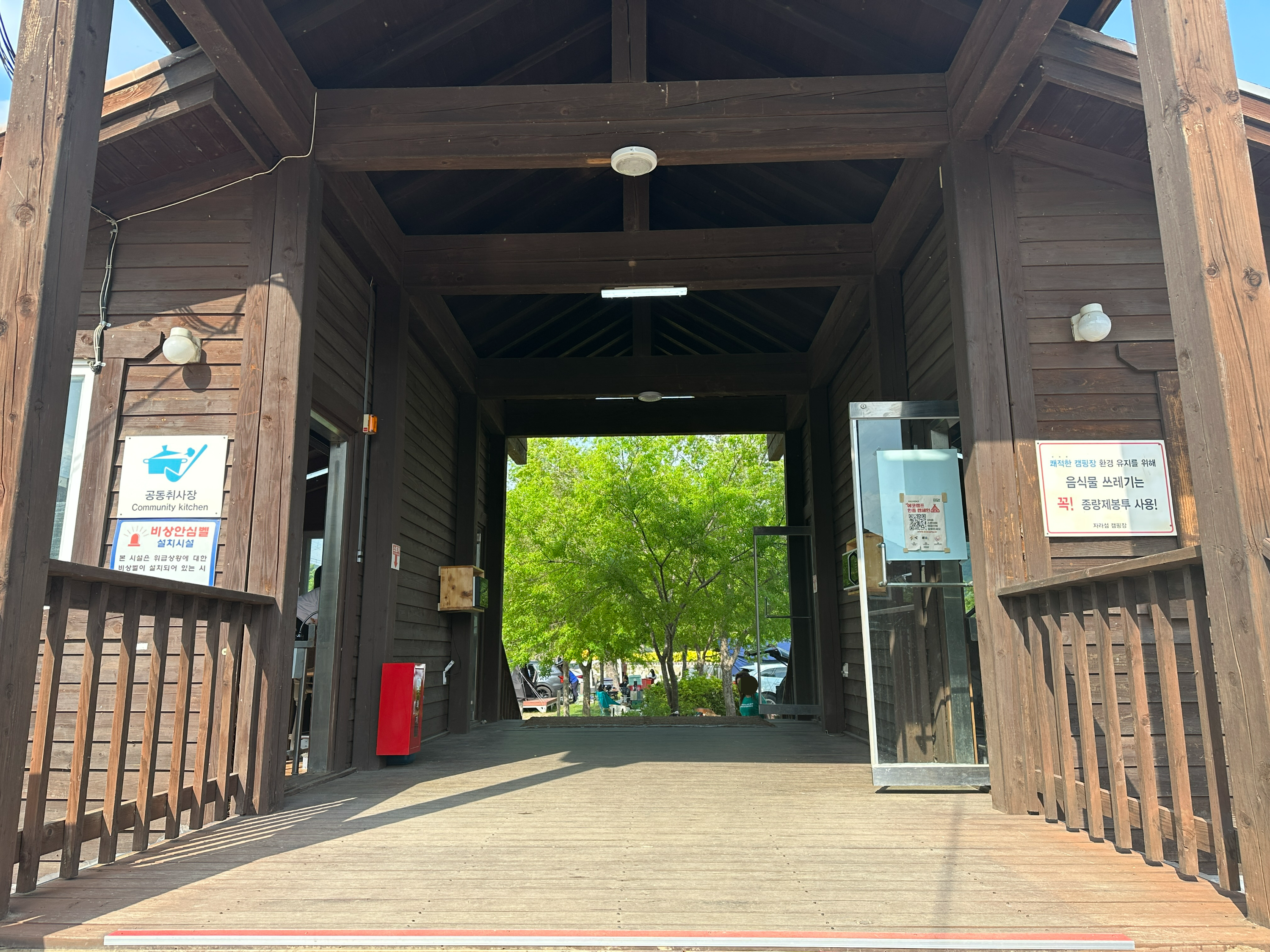 가평 자라섬 캠핑장은 화장실, 세척장, 샤워장과 분리수거장, 재 수거함이 모두 한 곳에 모여 있습니다.
