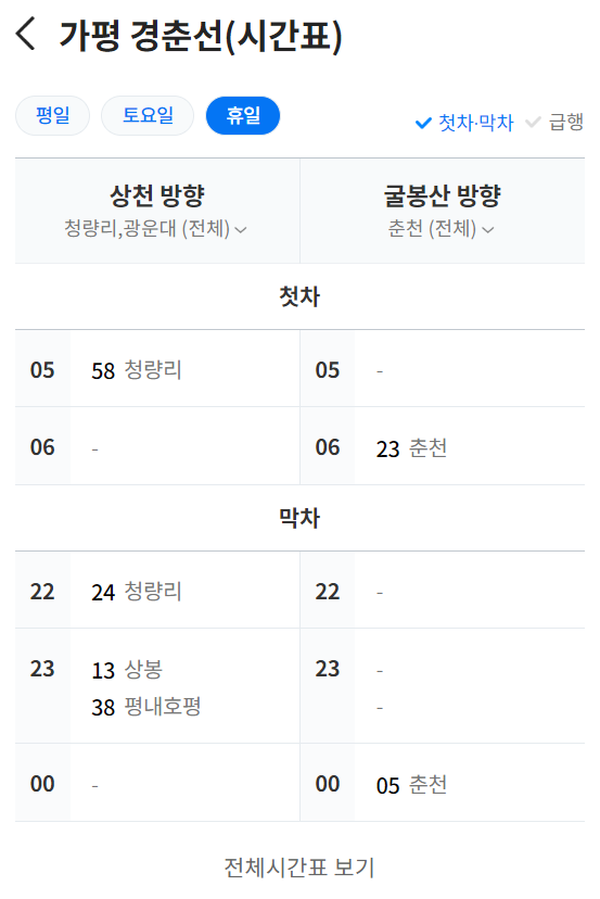- 생각 이상으로 경춘선의 소리가 큽니다. 아래의 시간표에서 보실 수 있듯이, 토일 기준 첫차 막차 시간까지 계속 기차가 다닙니다. 새벽 6시쯤부터 밤 12시 5분까지 말이죠.