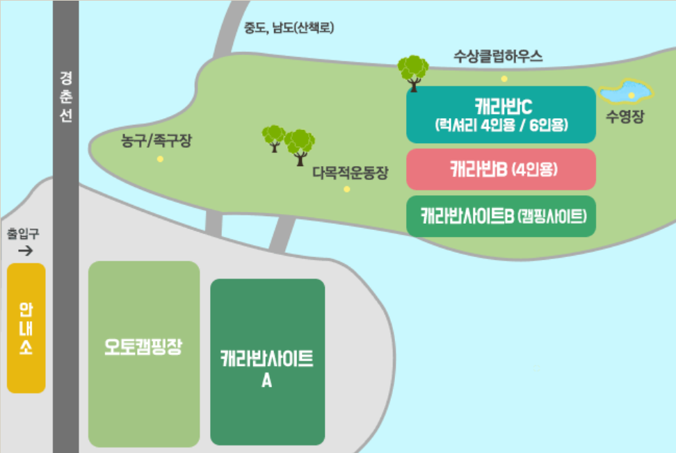 간략하게 배치도를 보았을 때 오토 캠핑장 쪽에 경춘선이 지나가고 있어서 전철 운행 시에는 약간의 소음이 예상되었습니다. 그리고 중간에 다목적 운동장에서 다양한 행사들도 진행됩니다. (예 : 2023 GOCF 가평자라섬)
