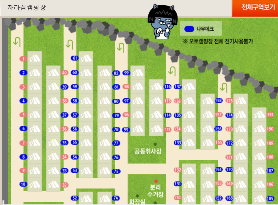 가평 자라섬 캠핑장의 사이트 배치는 아래와 같습니다. (출처 : 인터파크티켓)