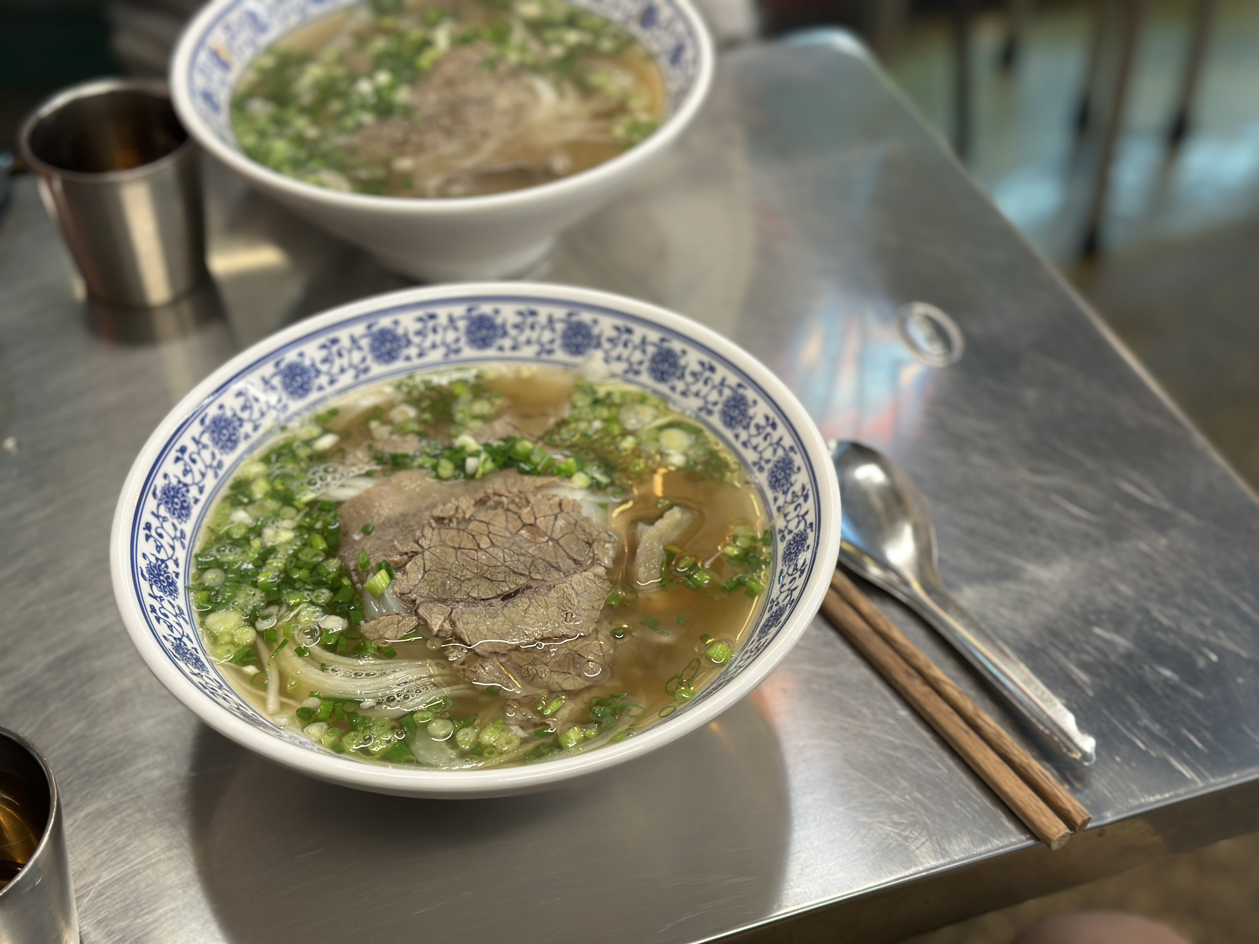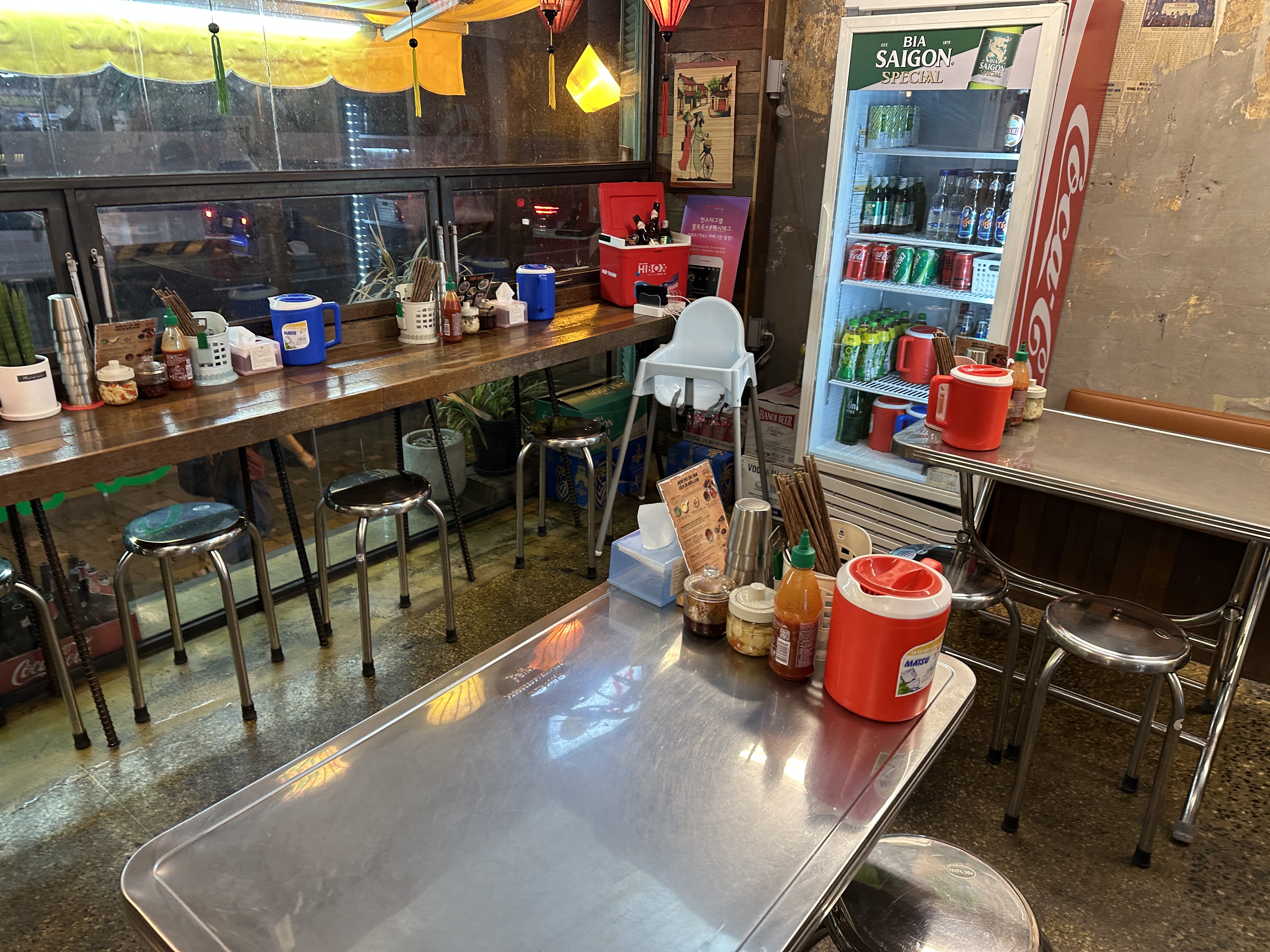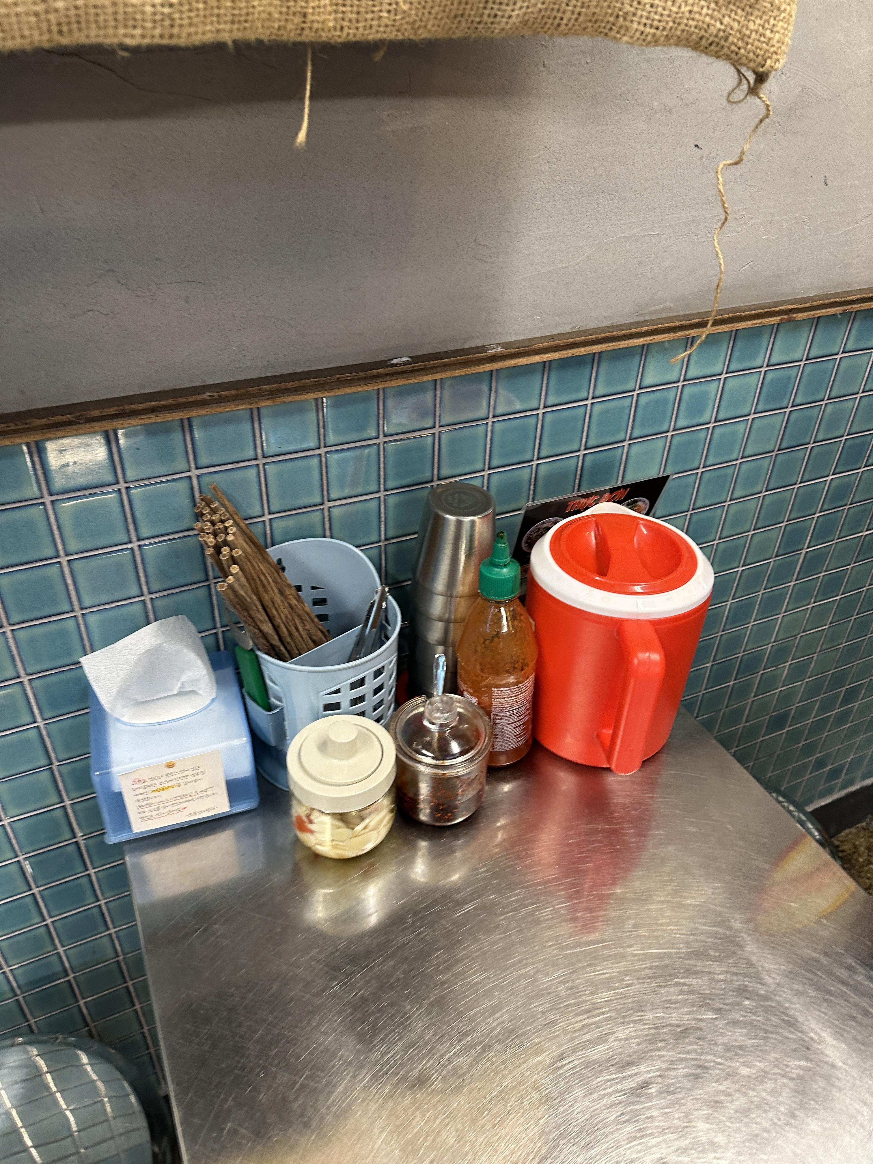 테이블에는 이렇게 다양한 조미료와 물(쟈스민차)이 있습니다. 기본 쌀국수만 빠르게 주문해 봅니다. 주문이 끝나자마자 기본찬이 나오고, 고수도 따로 말씀드려서 받아옵니다.