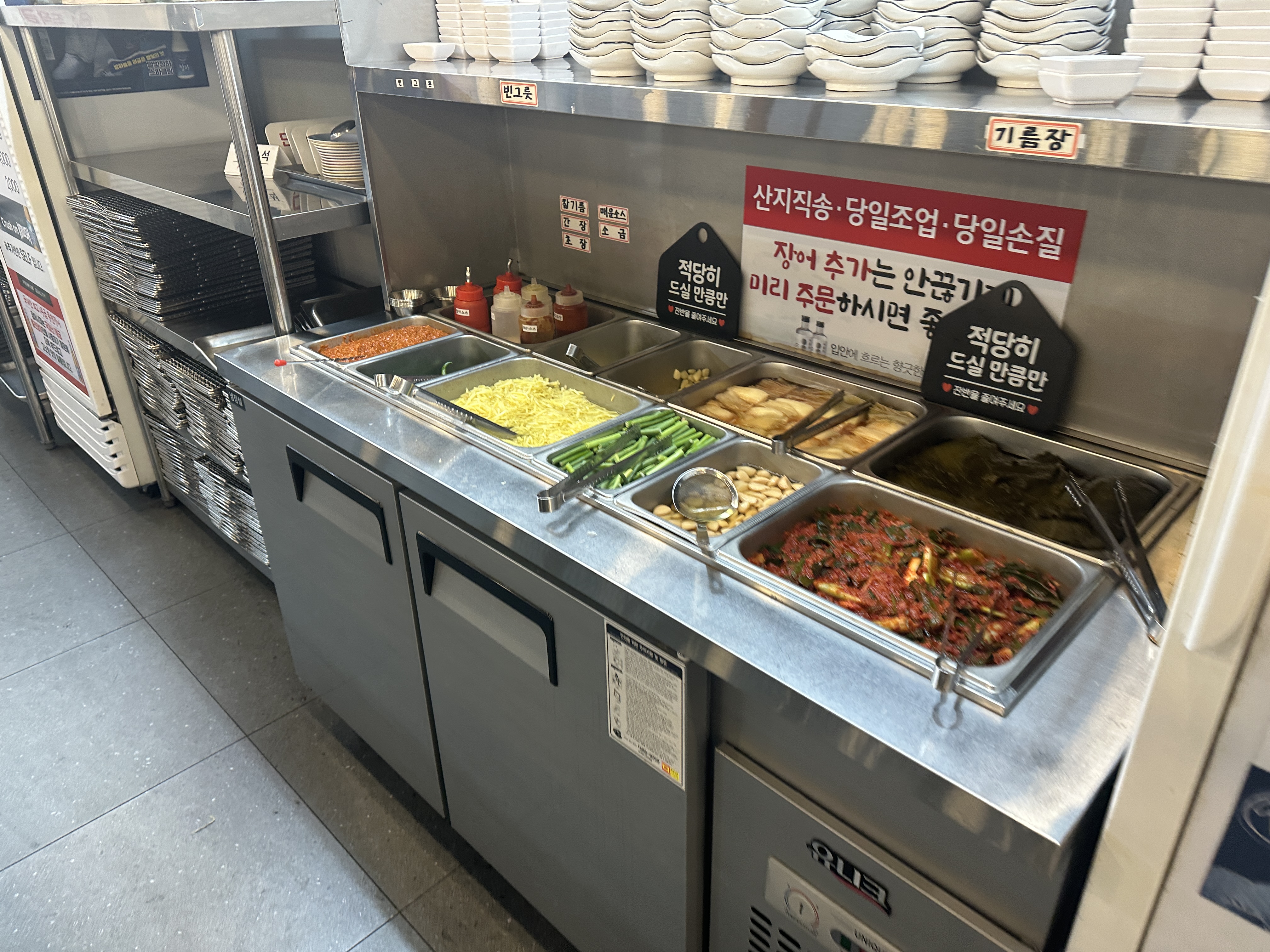 장어시대 군자점의 셀프바와 테이블 세팅입니다. 푸짐합니다. 저희는 생강을 많이 리필해 먹는 편이에요. 장어를 주문하면 2인당 1개의 장어탕이 작게 한 뚝배기 나옵니다. 이것도 별미에요.
