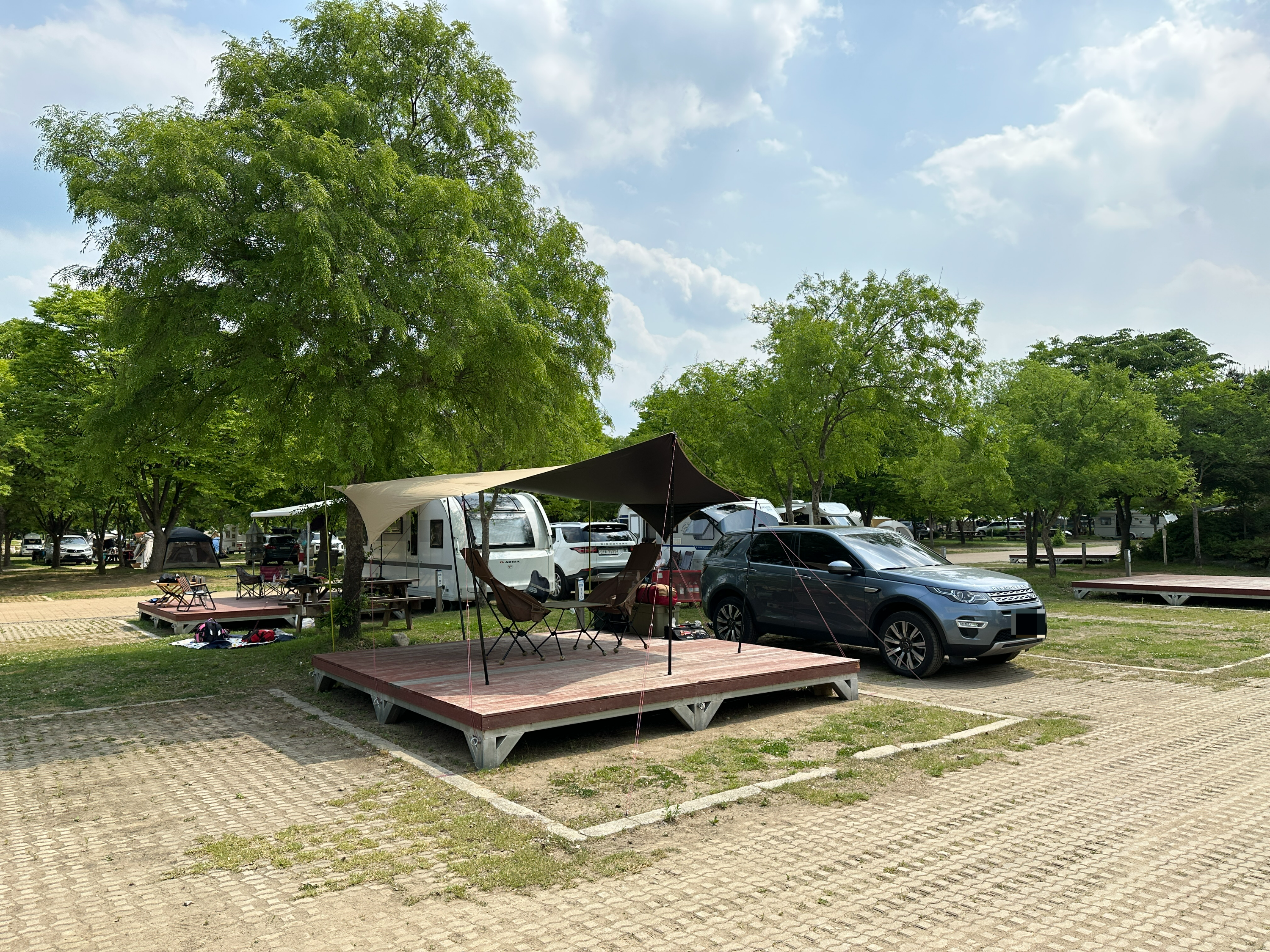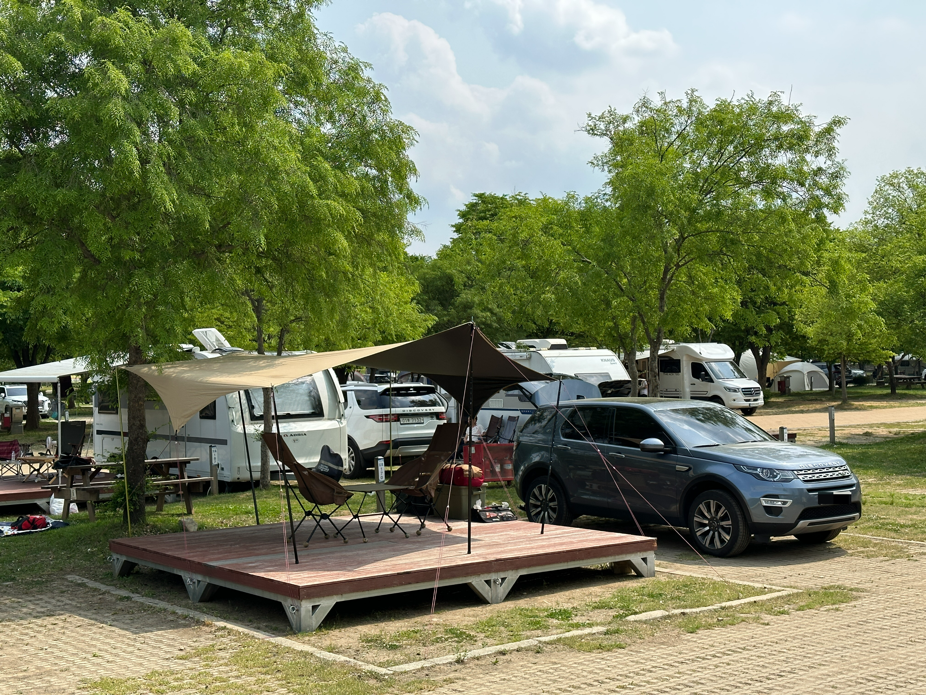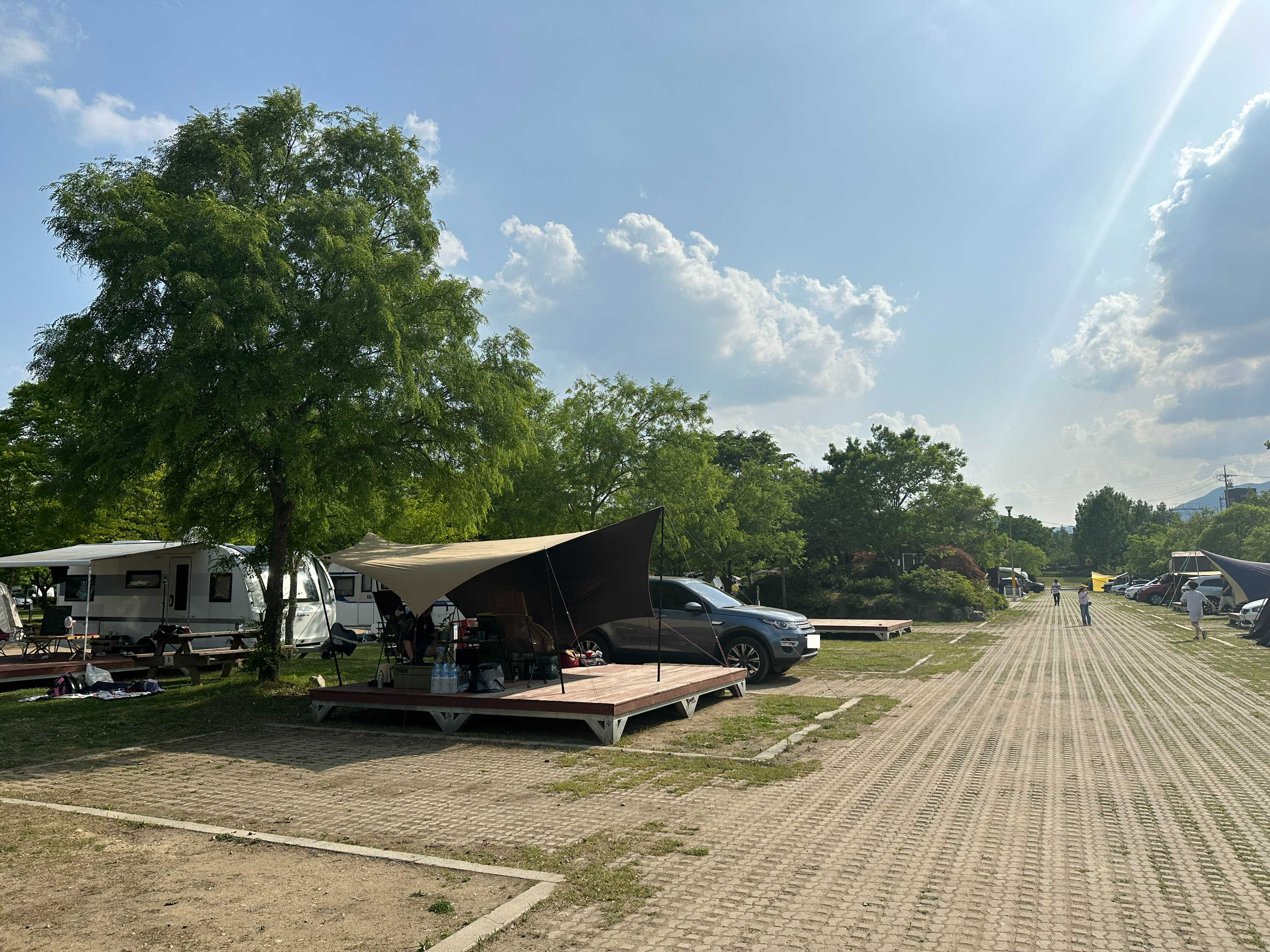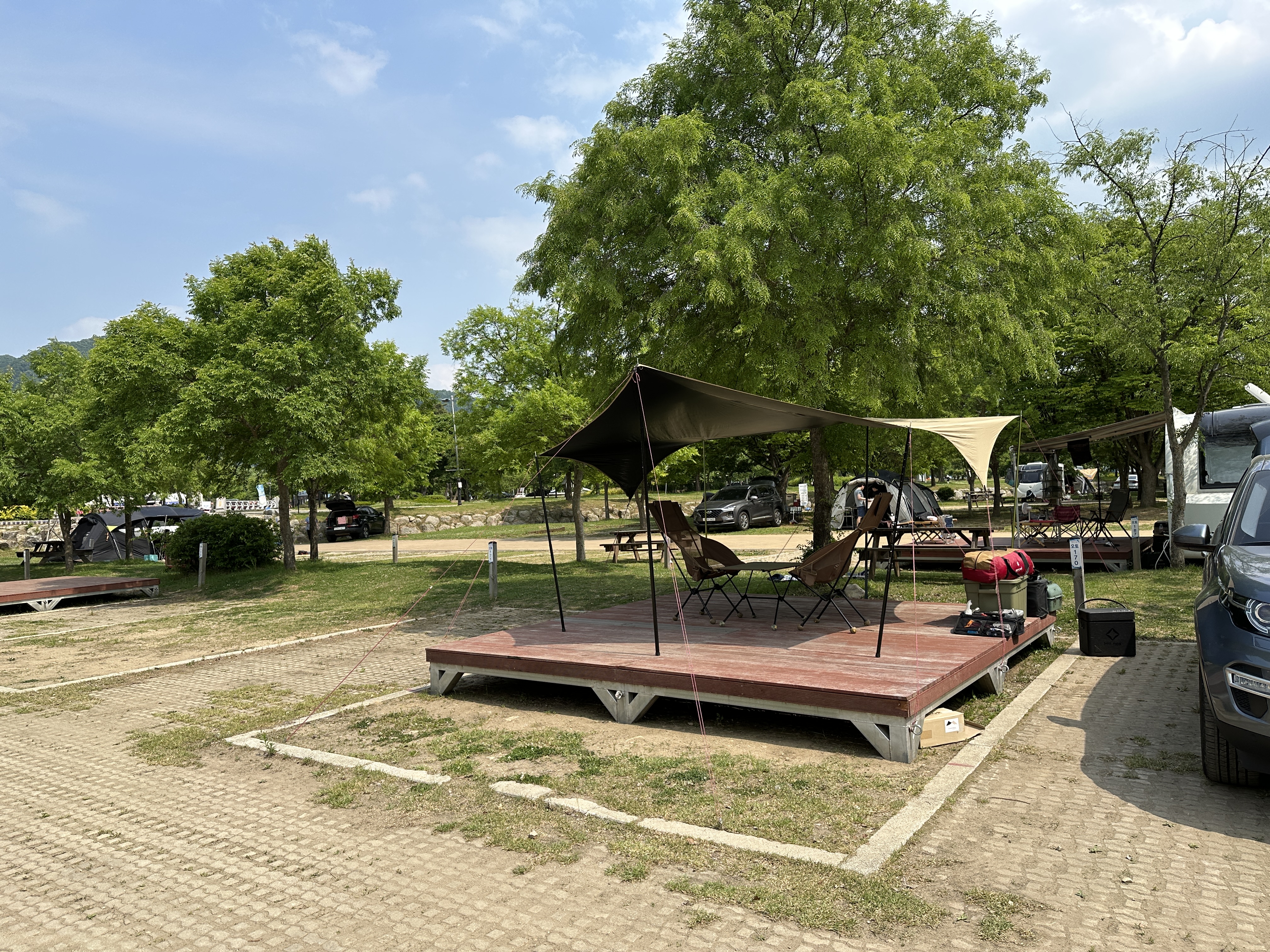결국 태양빛이 내리쬐는 방향의 타프를 내려서 다시 설치했습니다. 예쁘게 세팅되네요. 그늘도 넓어지고 ^^