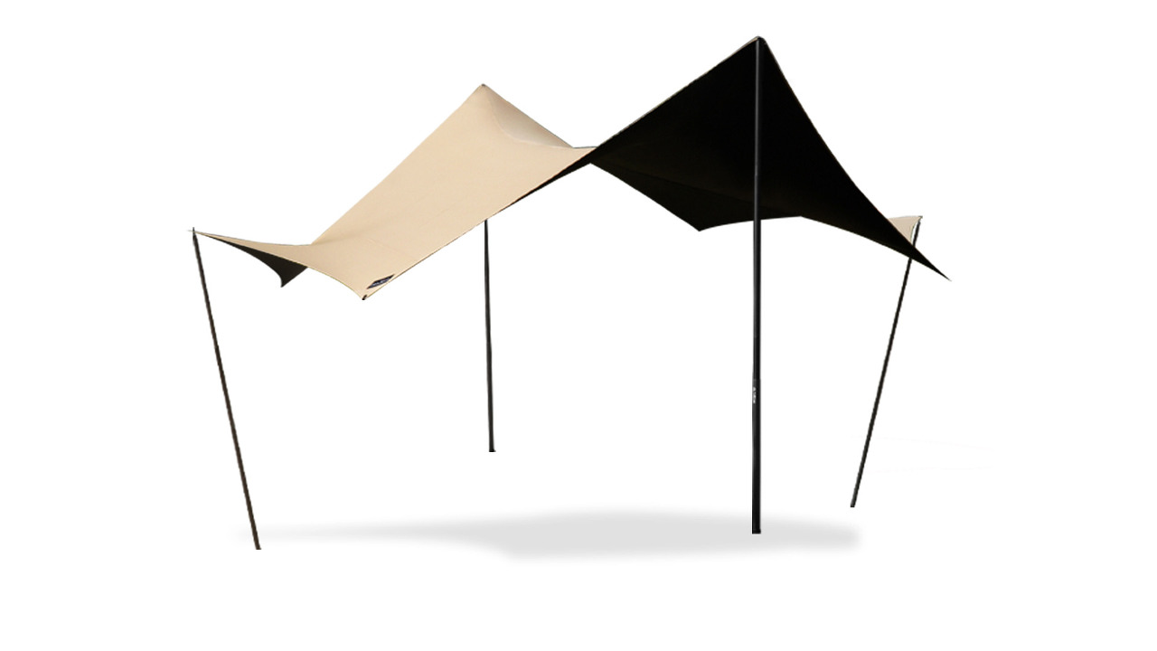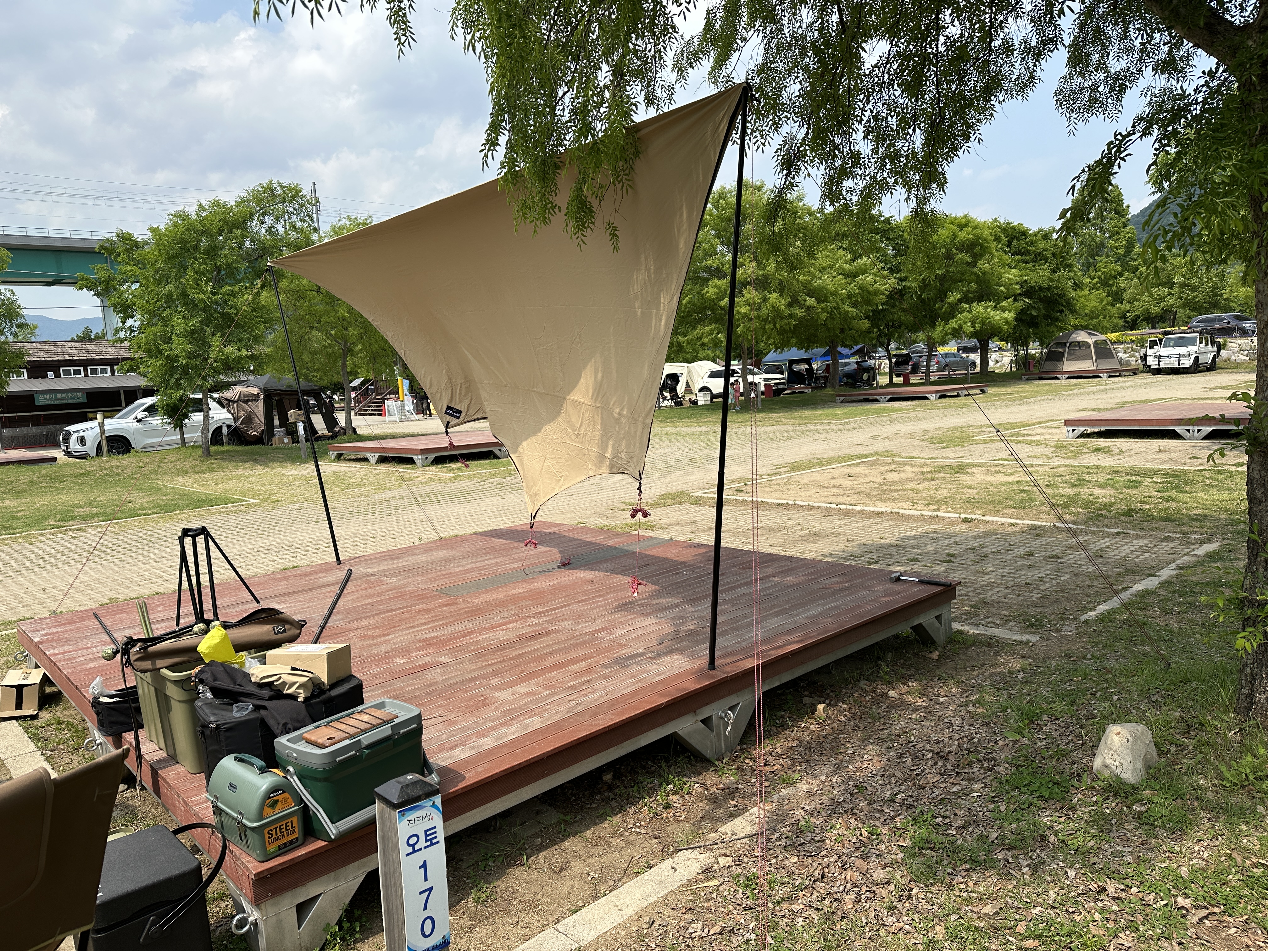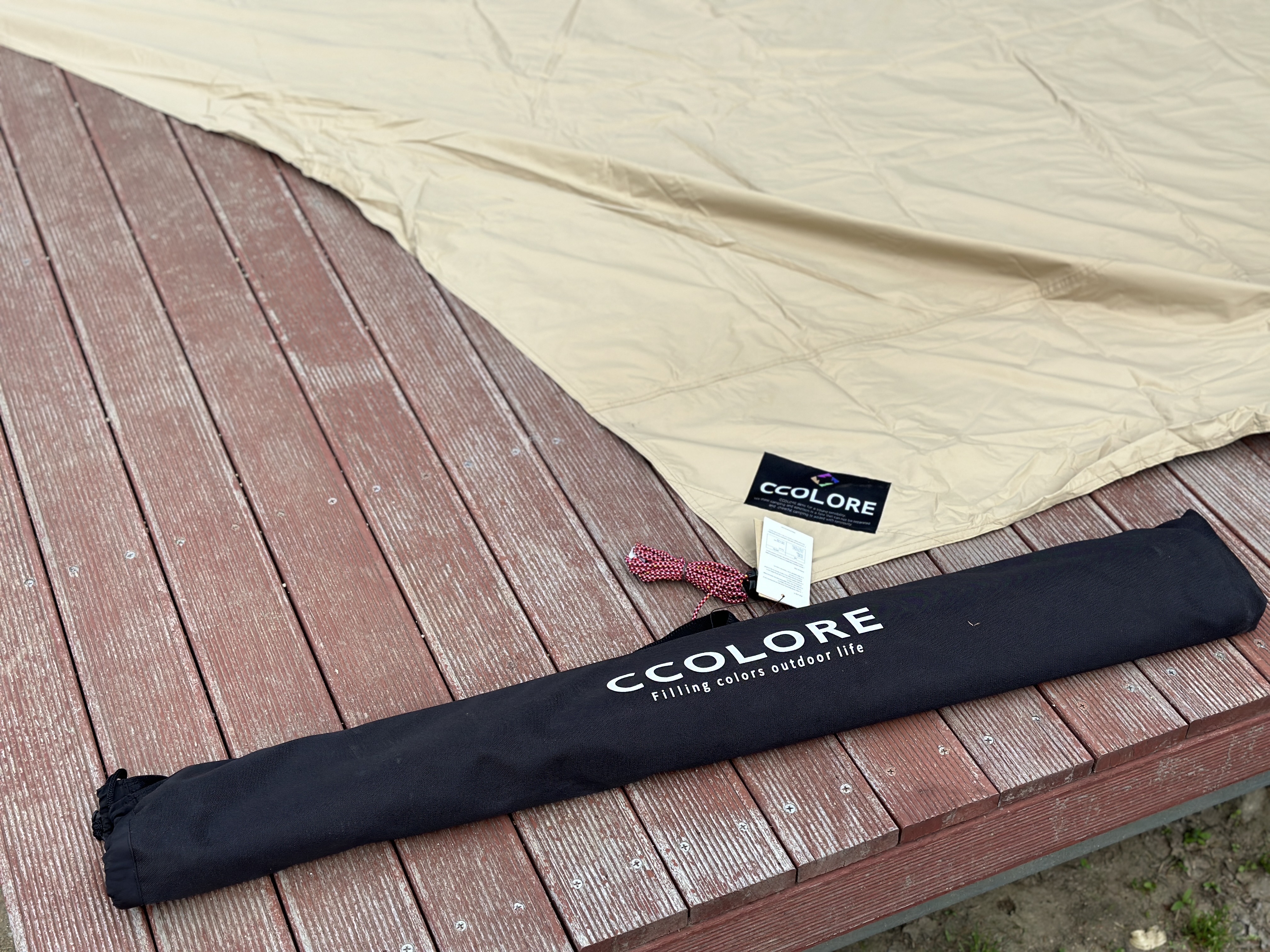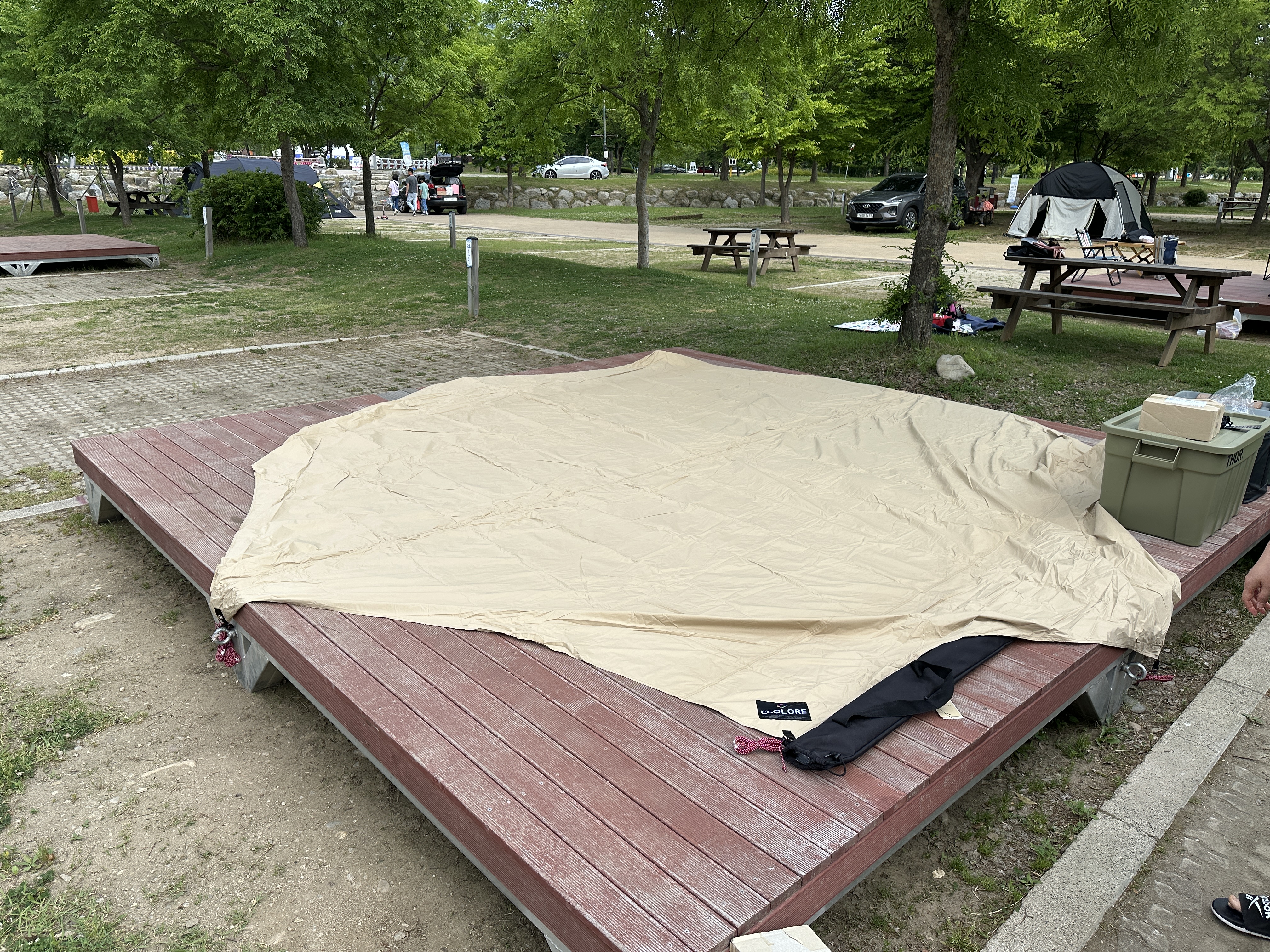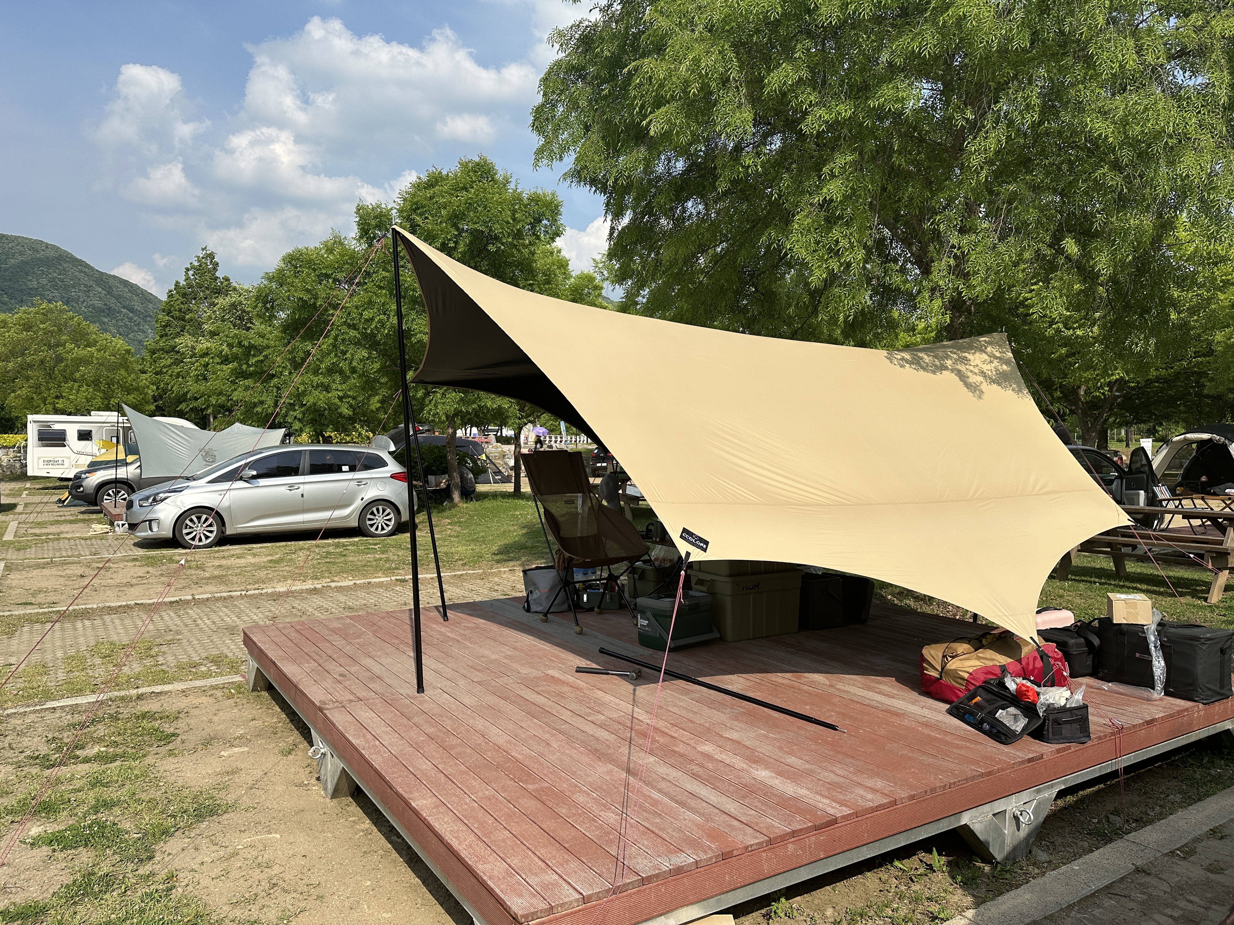 비교도 했으니 이제 타프를 세워봅니다. 타프 사이즈와 데크 사이즈가 귀신같이 맞아 떨어지는 모습입니다. 색감도 너무 밝지 않아서 가지고 있는 장비들과 잘 어우러지는 모습입니다.