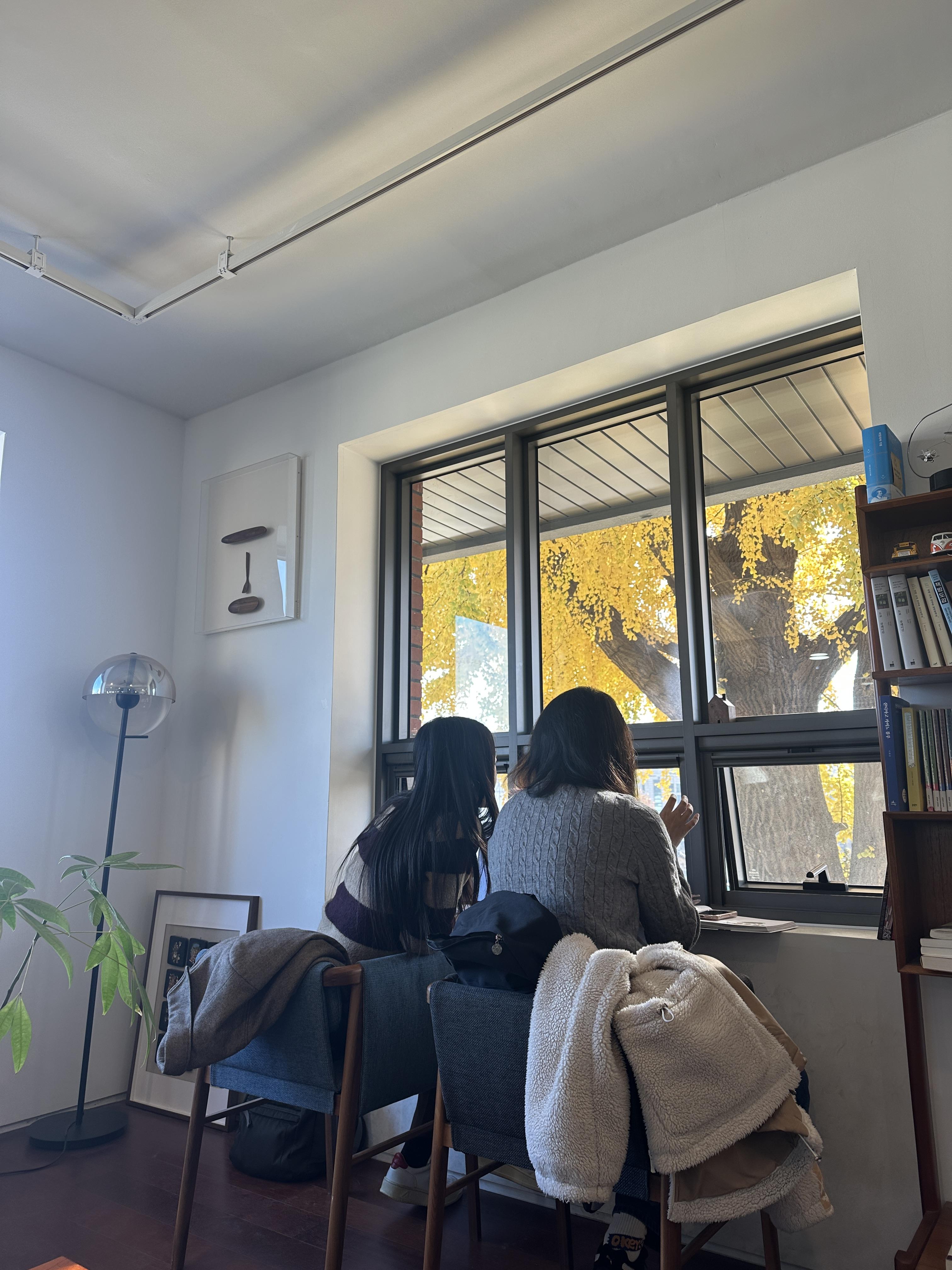 벽면에는 이렇게 창 틀을 이용한 공간도 마련되어 있습니다. 창밖에 보이는 은행나무를 그야말로 정면에서 맞이할 수 있는 공간이기도 하죠. (밤에 왔다가 낮에 왔다가 ㅋㅋㅋ)