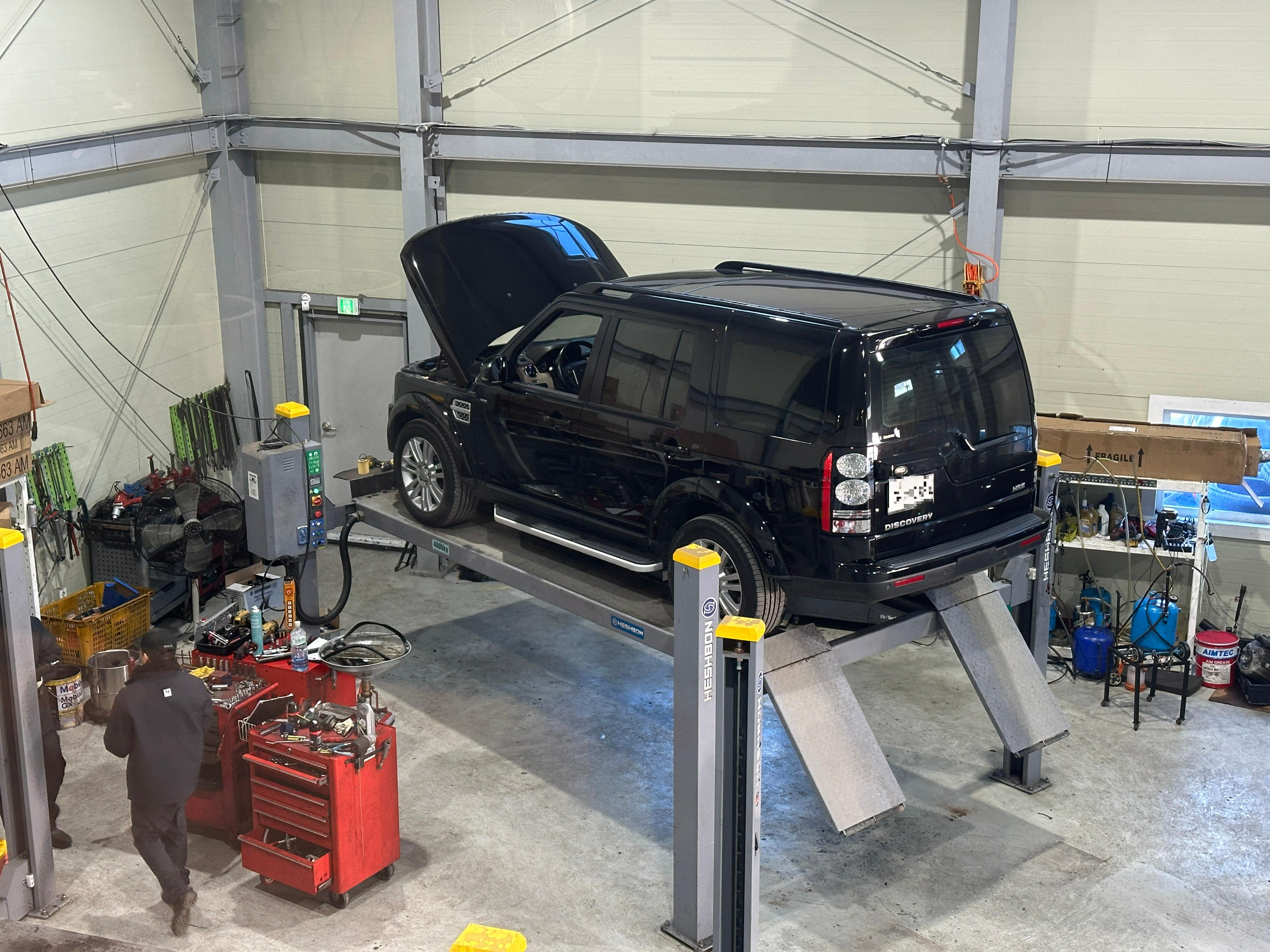 랜드로버 성지 하남 마수리개러지의 정비장소입니다. 입구에 들어오면 이렇게 정비할 수 있는 장소가 있는데요, 리프트에 띄워 올려서 엔진오일/필터 교체를 진행합니다.