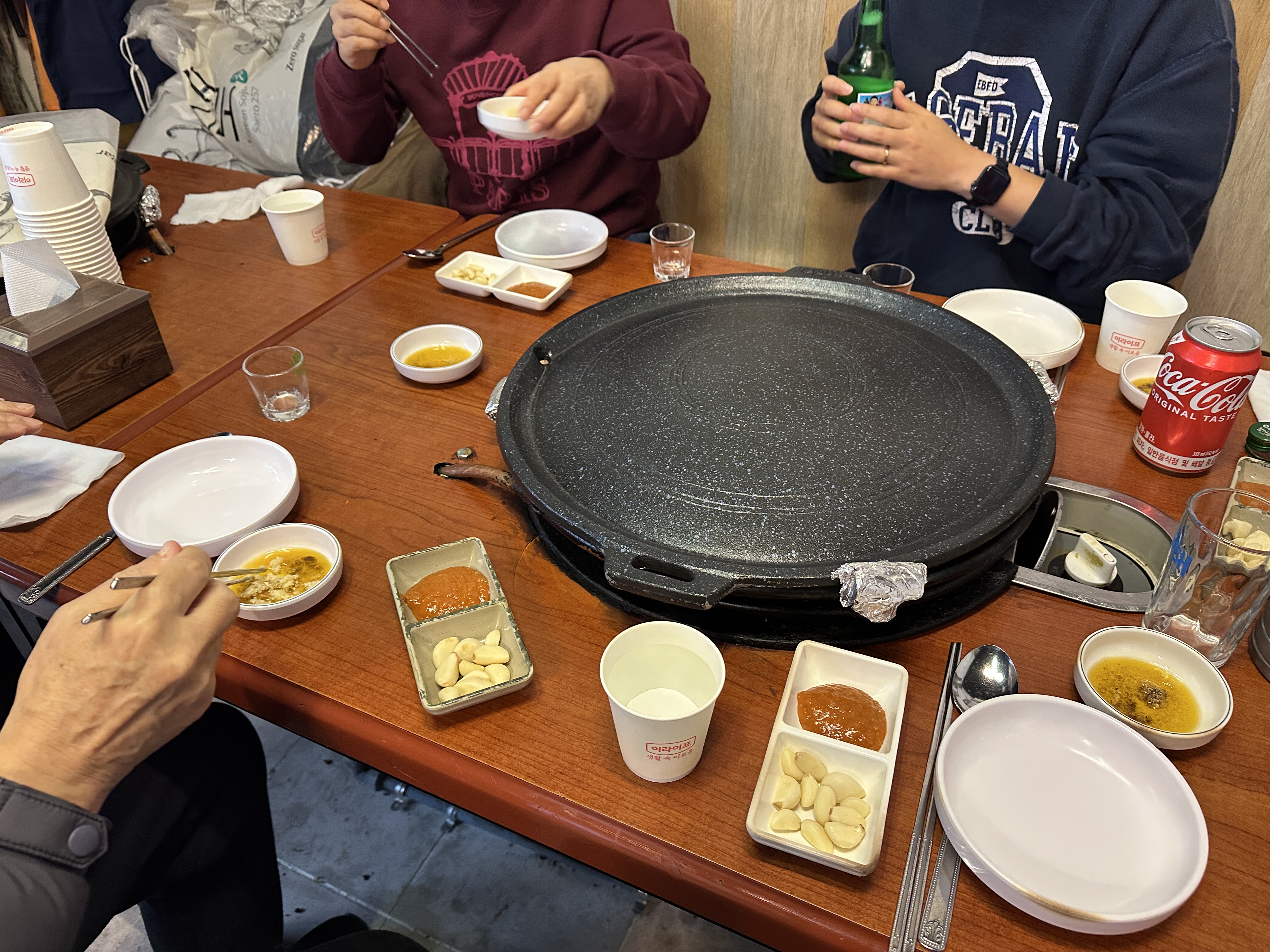 무조건생고기삼겹살에서의 밑반찬입니다. 저희는 4명이니 일단 목살2개, 삼겹살2개 시켜서 기다립니다. 테이블 한가운데에 정말 거대한 불판이 자리하고 있고, 마늘, 파채, 쌈무, 콩나물, 김치 등 착착 세팅이 진행됩니다.