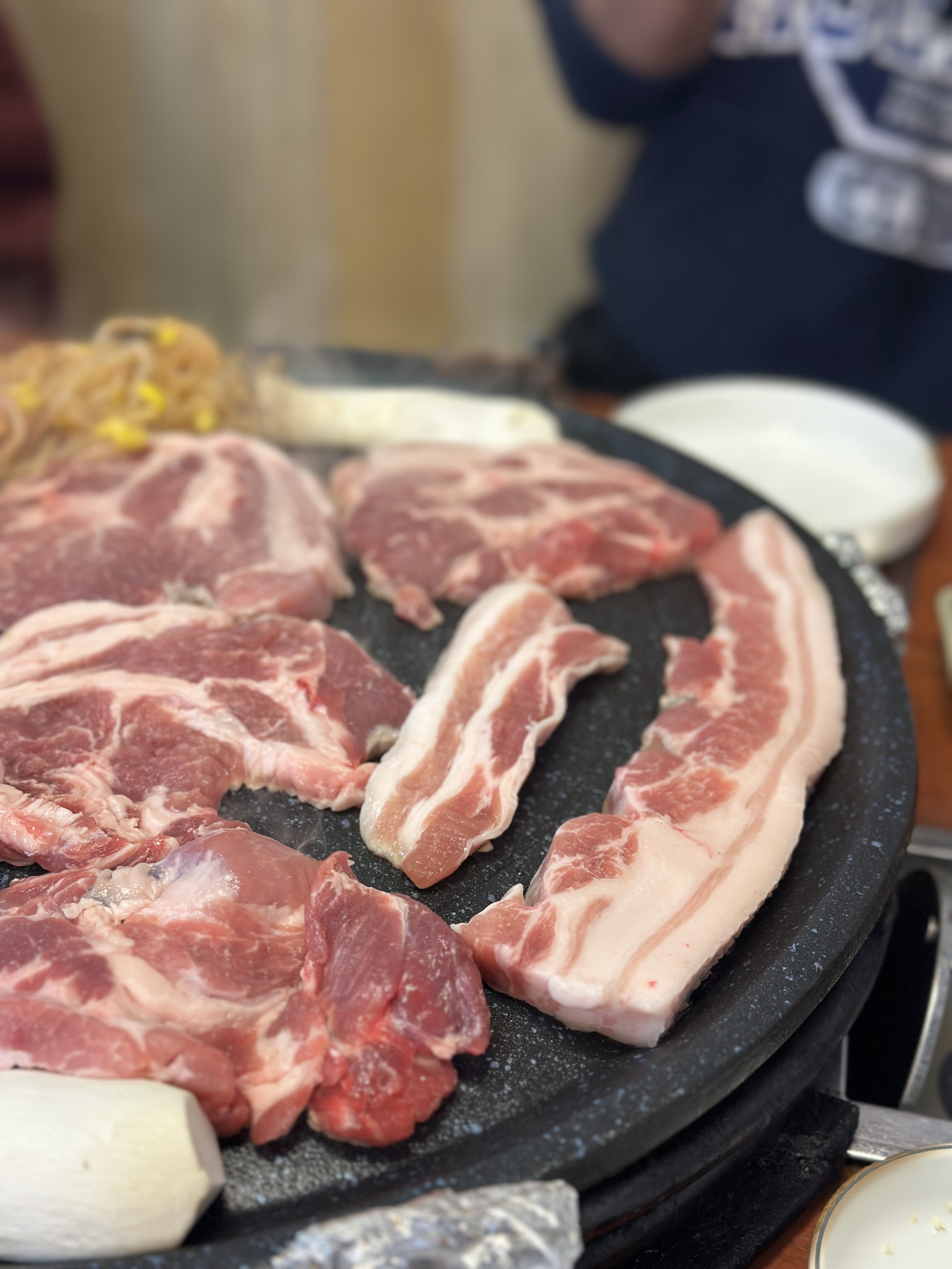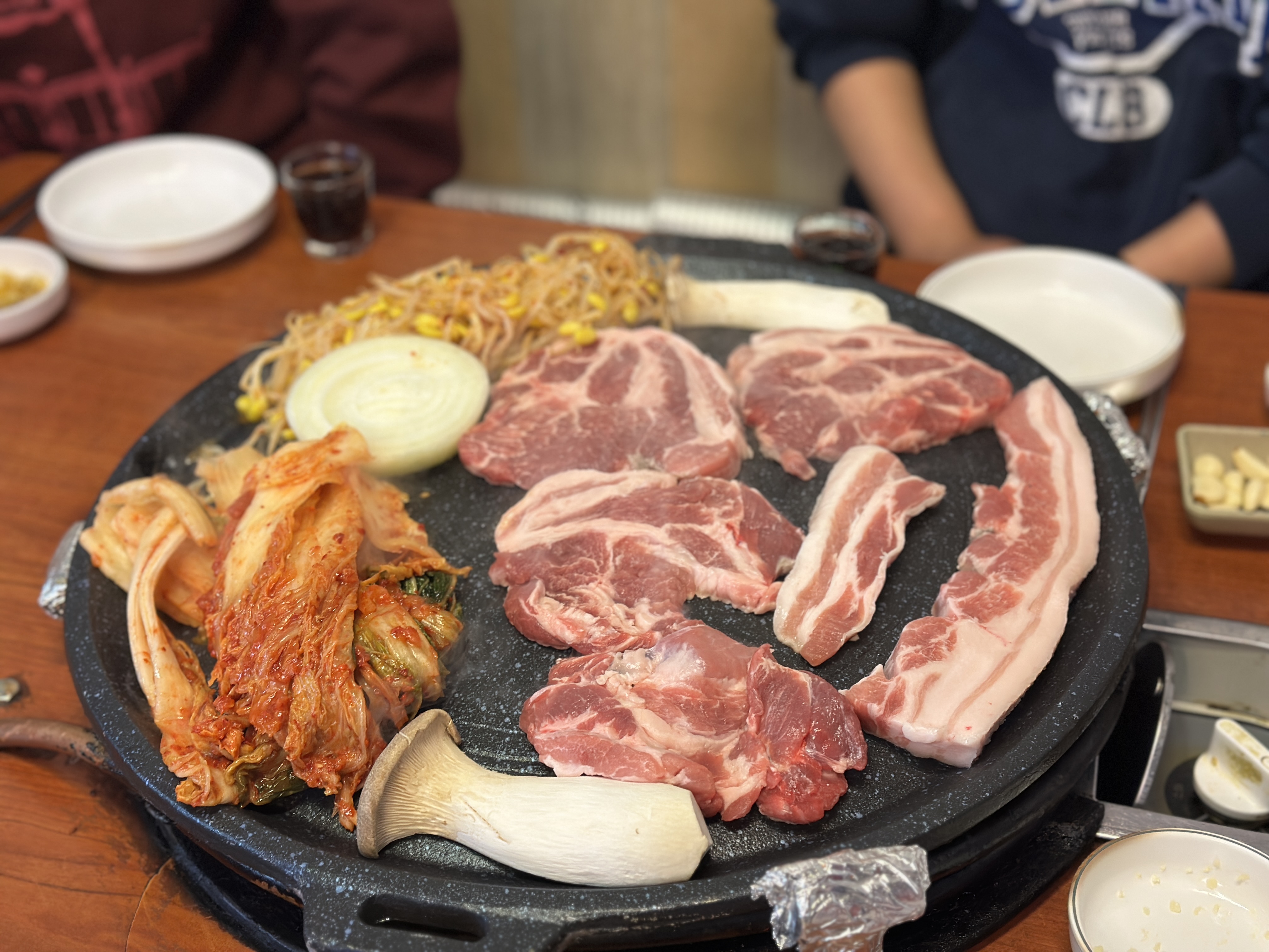 무조건생고기삼겹살의 4인분 세팅입니다. 목살부터 삼겹살, 버섯, 양파 등 한 판에 싹 다 올라가는데 이게 참 보는 재미가 있습니다. ㅋㅋㅋ 불판도 크고, 화력도 쎄서 잘 익는 모습이구요. 그리고 무엇보다 사장님께서 어느정도 시점까지는 직접 고기를 다 잘라주시고 맛있게 구워주십니다. ㅋㅋㅋ