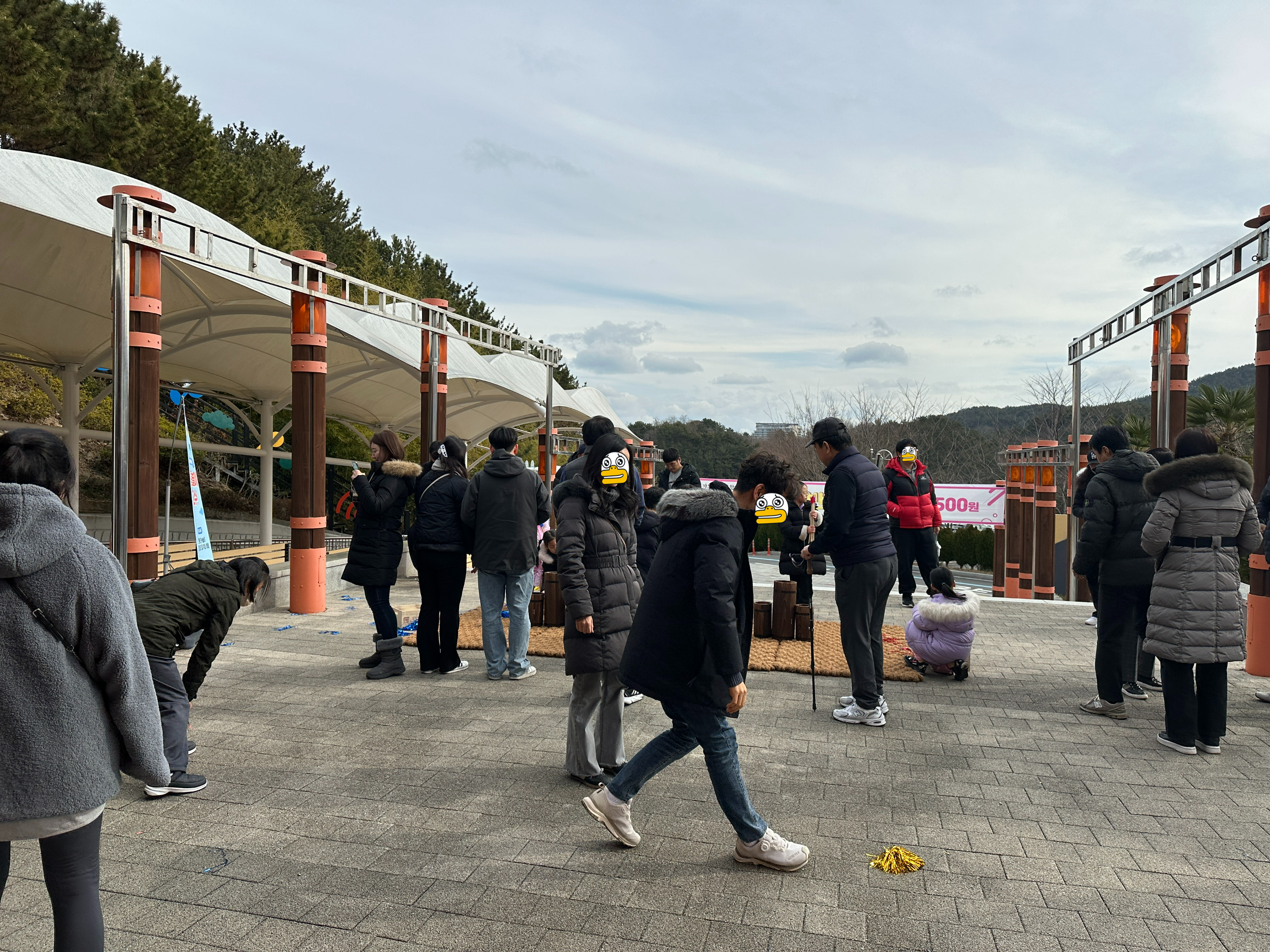 통영 케이블카 앞에는 설이라서 그런지 민속놀이를 즐길 수 있는 장소가 마련되어 있었습니다. 지금은 없을 수 있겠네요. 많은 인파들을 지나 줄을 서봅니다. 다양한 디자인의 케이블카가 눈에 띕니다.