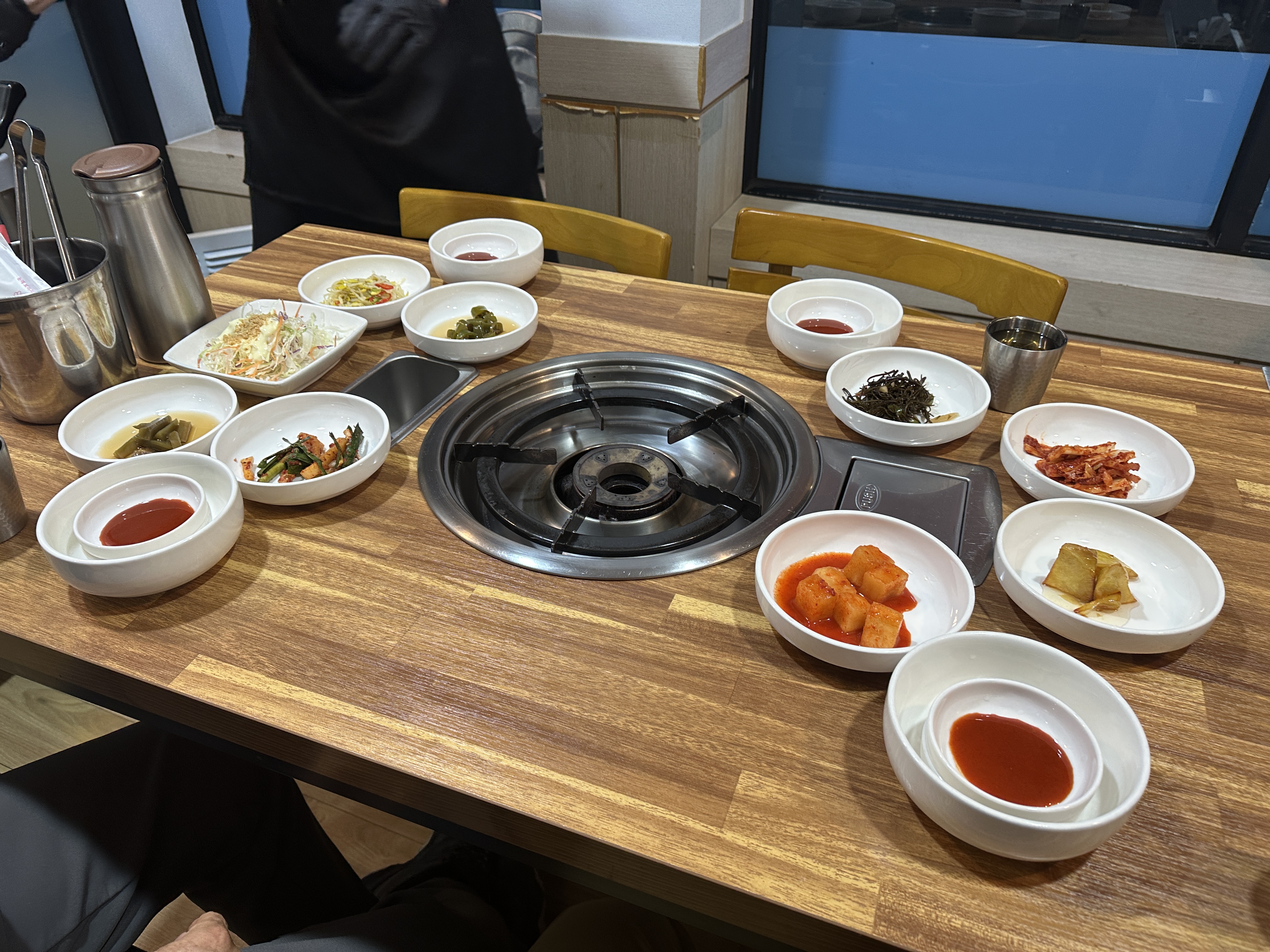 자리에 앉으니 반찬을 바로 깔아주십니다.정겨운 화구 테이블이네요. ㅋㅋㅋ 죽까지 미리 다 서빙이 됩니다. ㅎㅎ 약간 누룽지 느낌이 나는 밥이네요.