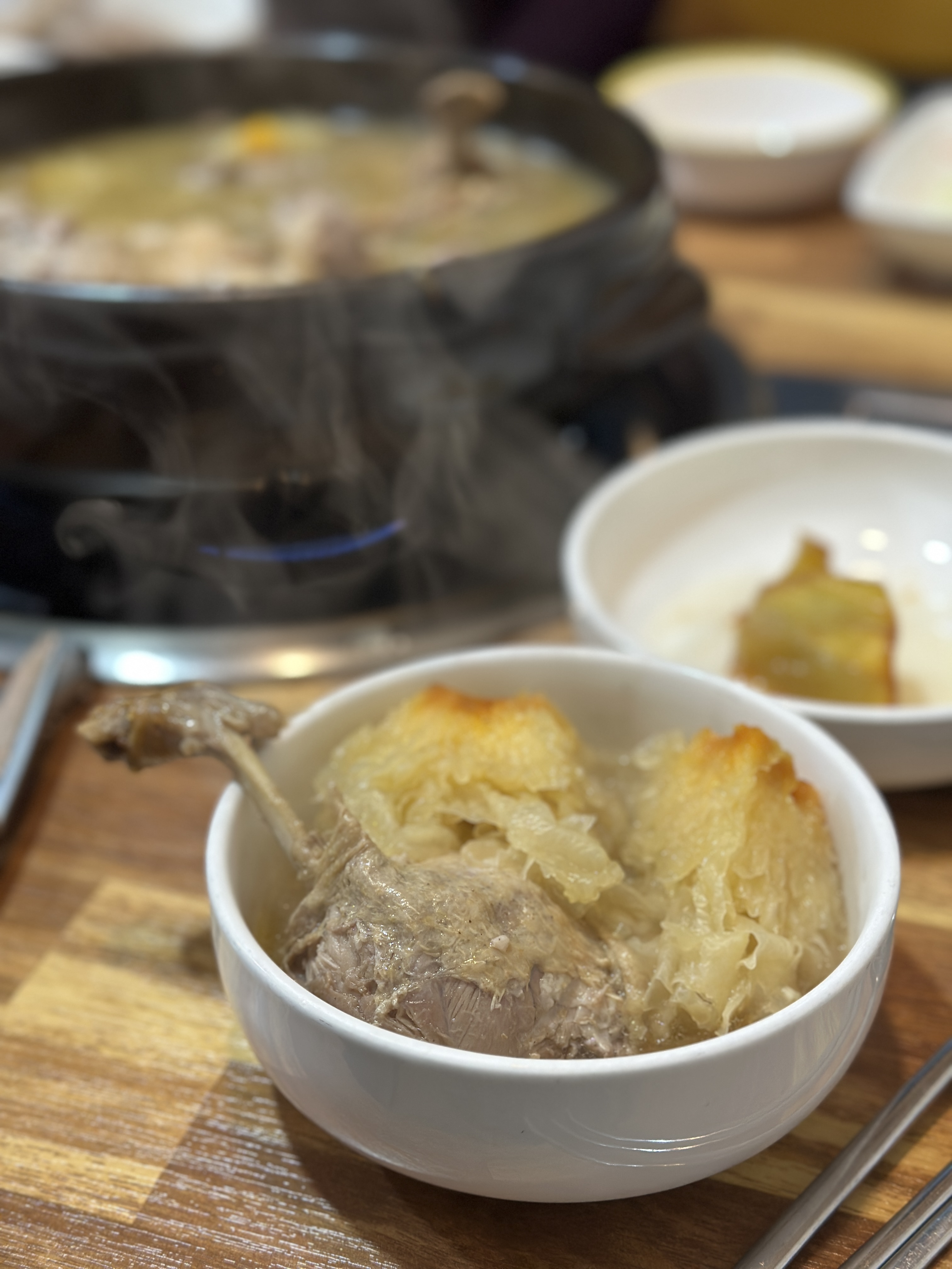 통영황칠의 오리백숙입니다. 오리 한마리와 흰목이버섯이 풍성하게 들어가 있습니다. 오리가 통으로 들어갔고, 이미 잘 익혀 나오기에 어느정도 뎁혀서 바로 먹으면 되겠습니다. 흰목이버섯도 진짜 적당하게 잘 익어서 맛있게 먹을 수 있었습니다.