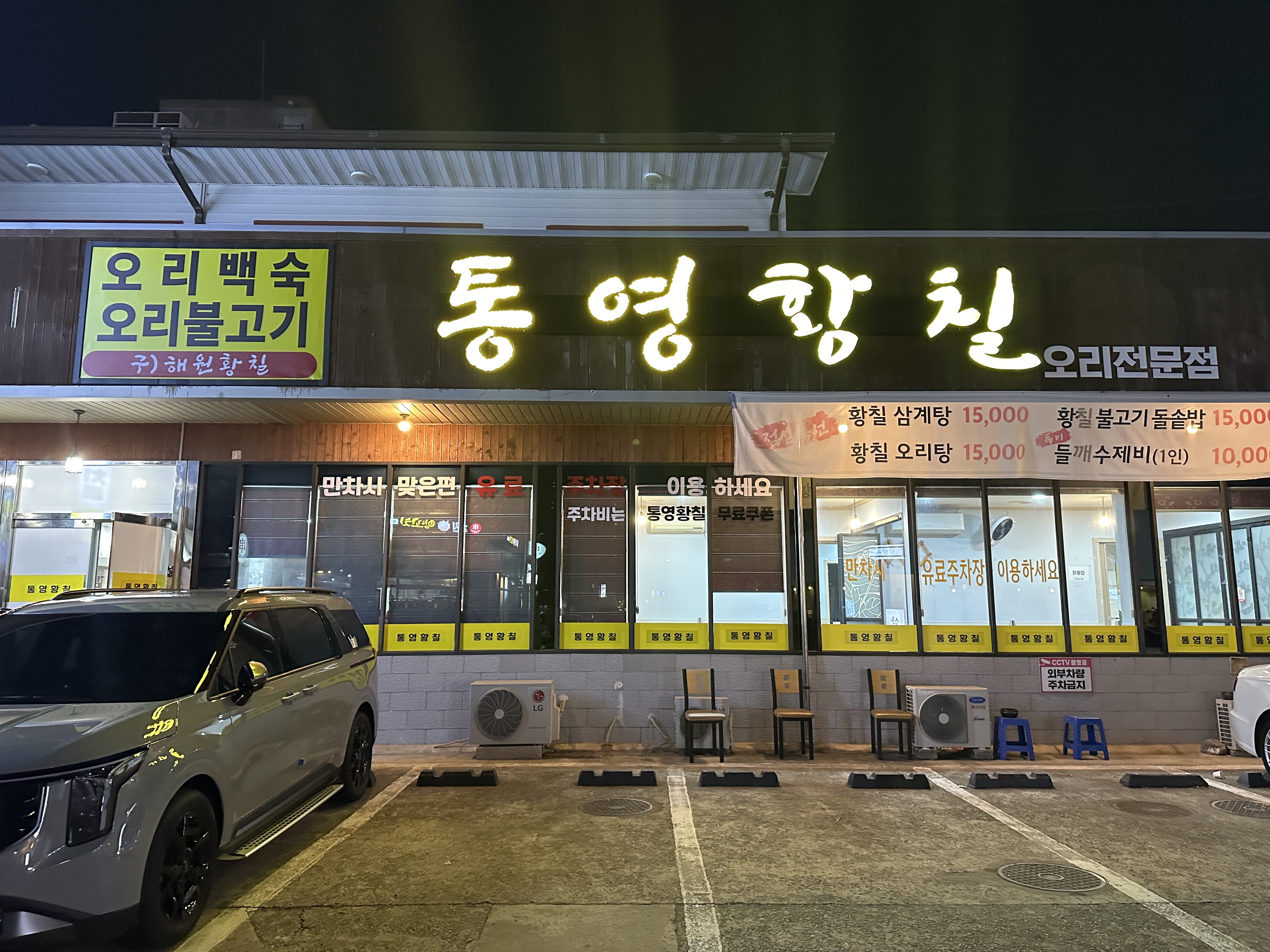 외관입니다. 통영황칠은 꽤 넓은 면적을 자랑하는 식당이고, 오리백숙과 오리불고기 등을 전문으로 하는 황칠오리 전문점입니다. 주차는 매장 앞에 5대가량 구획이 마련되어 있답니다.