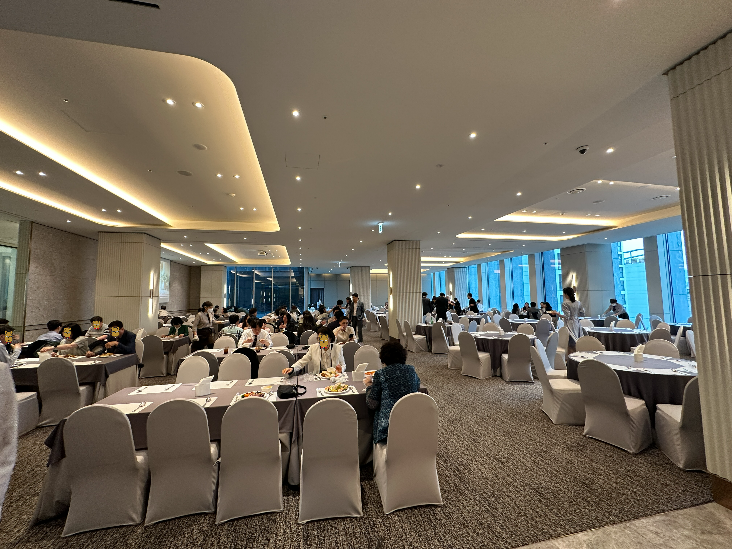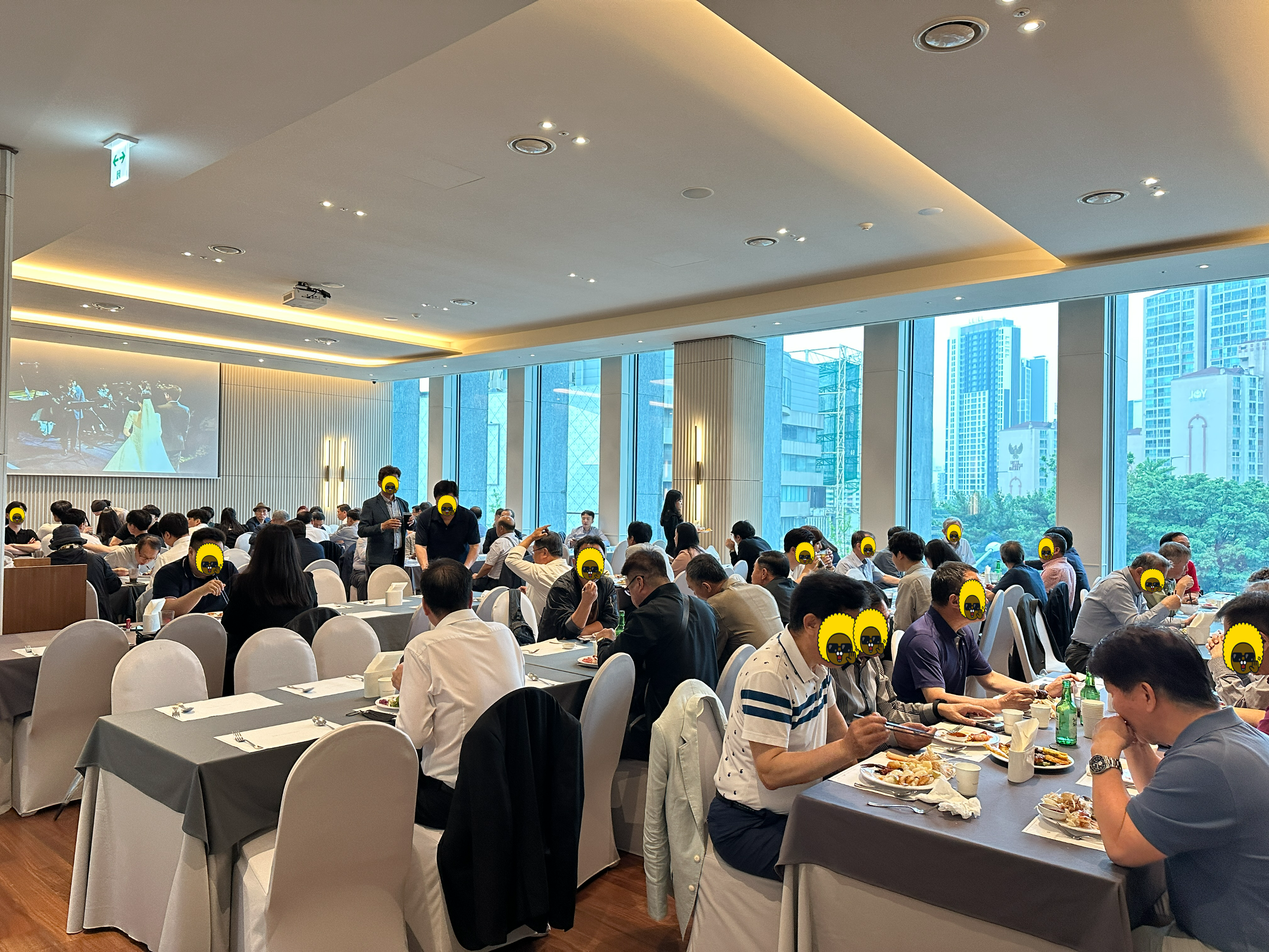 연회장 규모도 상당한 편이며, 인테리어나 좌석배치가 깔끔했습니다. 벽 한편에는 스크린으로 결혼식 시청이 라이브로 가능하며, 반대편은 통유리로 개방감까지 놓치지 않은 모습입니다.