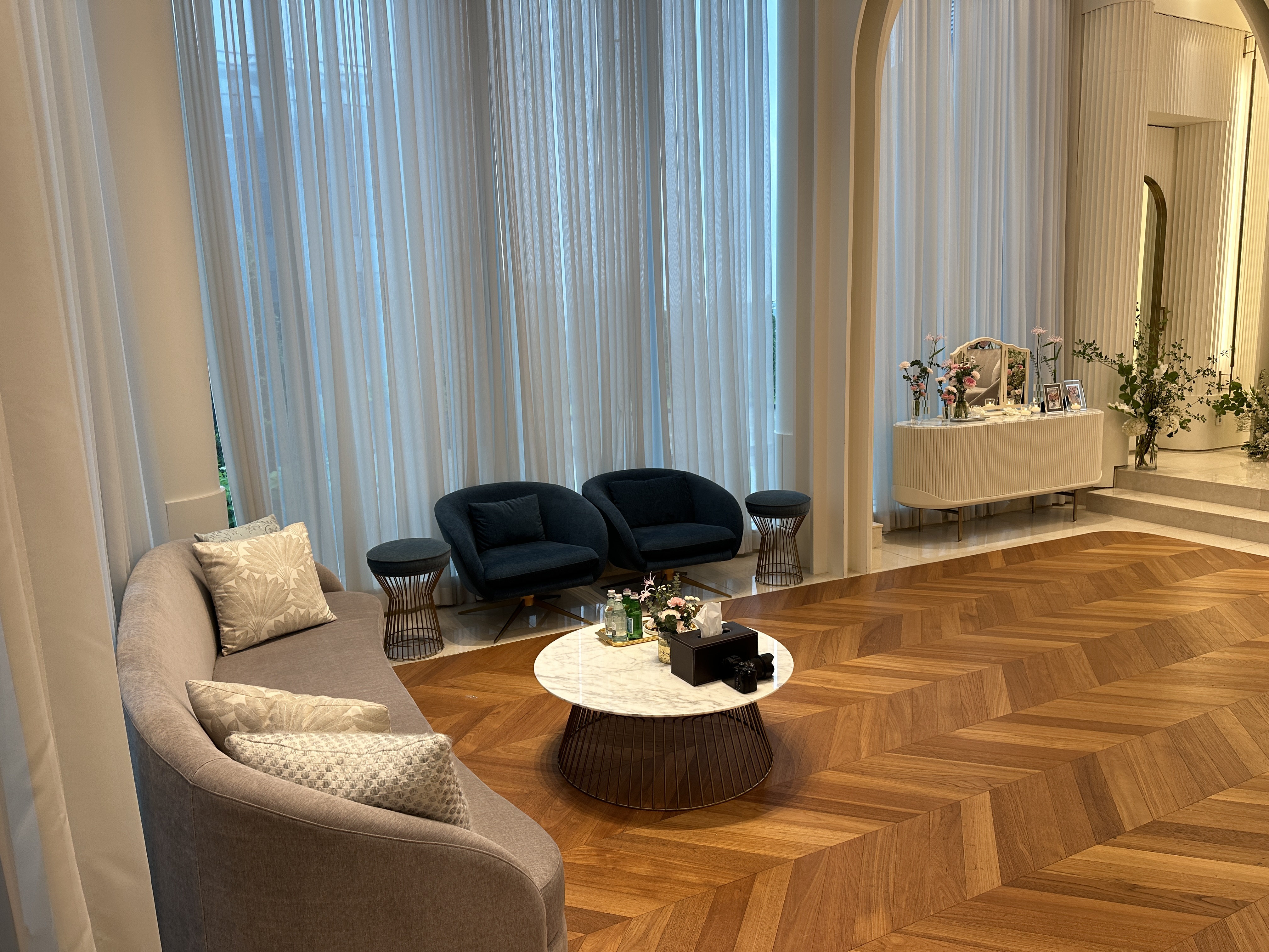 실제 신부대기실의 모습입니다. 좀 전의 로비에서 웨딩홀 쪽으로 이어지는 곳 한편에 위치하고 있는데, 정말 예뻤습니다. 공간이 넓은 것은 물론이고, 탁 트인 개방감부터 인테리어 자체까지 상당히 고급스럽습니다. +_+