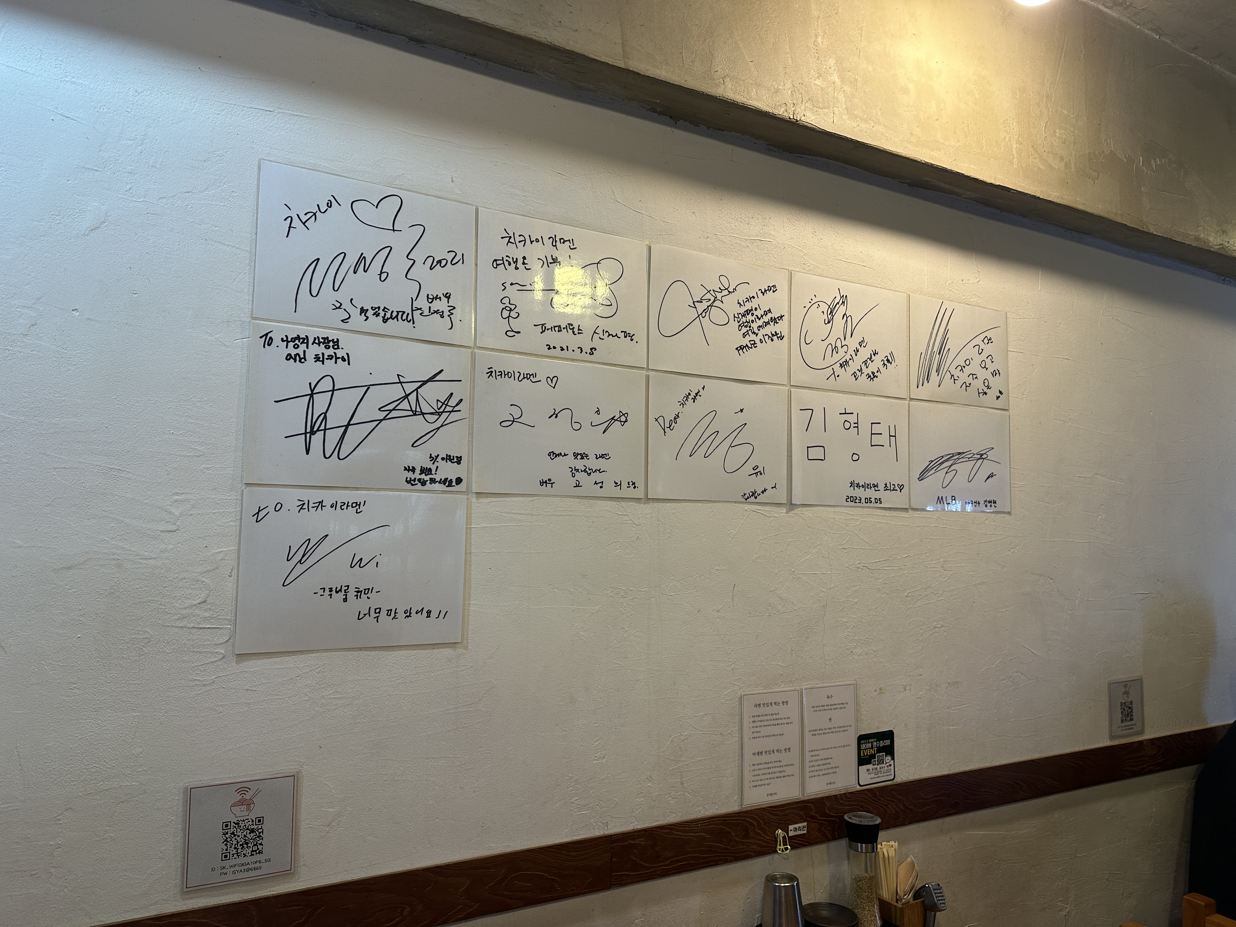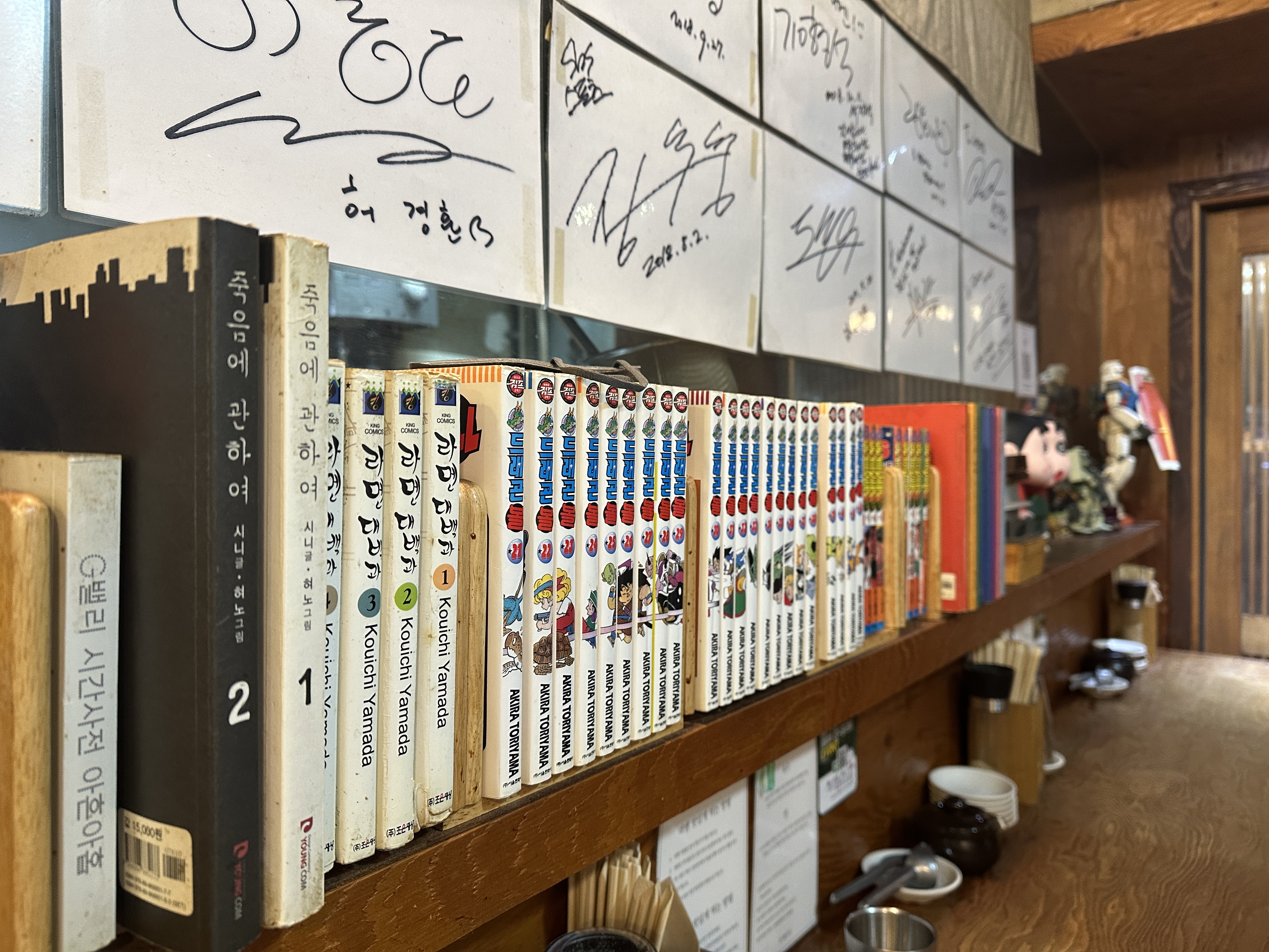 여전히 유명인분들께서 많이 오시는 옥수동 치카이라멘입니다. 싸인이 좀 늘어난 것 같기도 하고... 짱구도 그자리에 있고, 슬램덩크도 그자리에 있고... 왠지모르게 정겹습니다. 오늘은 전여친님을 기다리며 다찌석에 앉습니다.