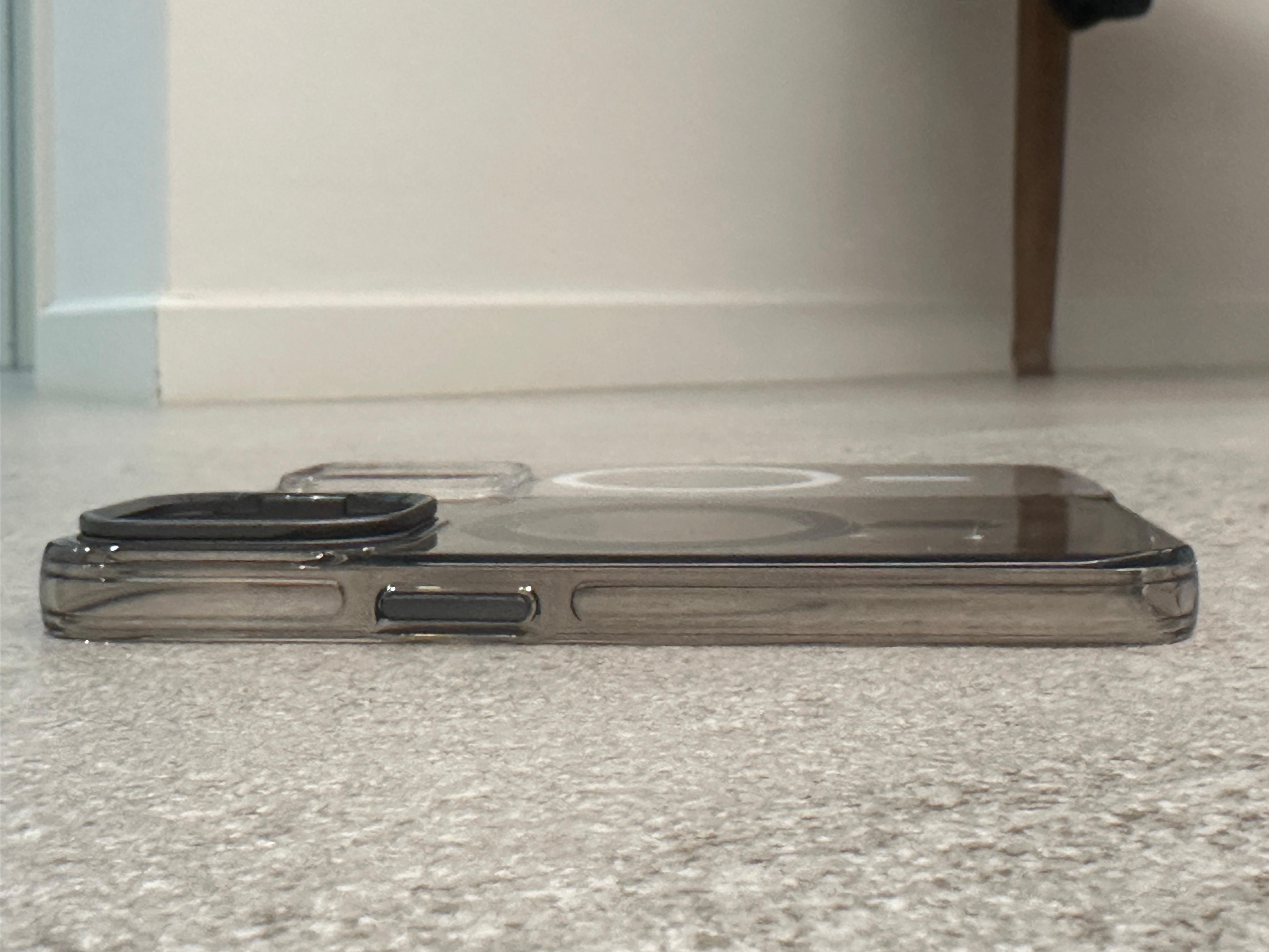옆에서 봤을 때도 유의미한 차이는 없을 정도의 외관입니다. 다만 음량조절, 잠금버튼부를 검정색 버튼으로 교체 해둔 점이 차이가 있습니다. 또한, 하단부 스피커와 충전부가 다릅니다. 사실 이 부분은 아이폰 정품 케이스에서 가장 개인적으로 짜증났던 부분인데, 저 쥐파먹은 부분이 정말 골칫거리였습니다. 깨지기도 했고요, 연한 부분과 딱딱한 부분이 분리되기도 했어요. ㅋㅋㅋ 그런데 보바(VOVA) 메탈 링스탠드 맥세이프 휴대폰 케이스는 그런 것 없이 일체로 쭉 가려주는 것이 아주 만족스럽습니다. 굿굿