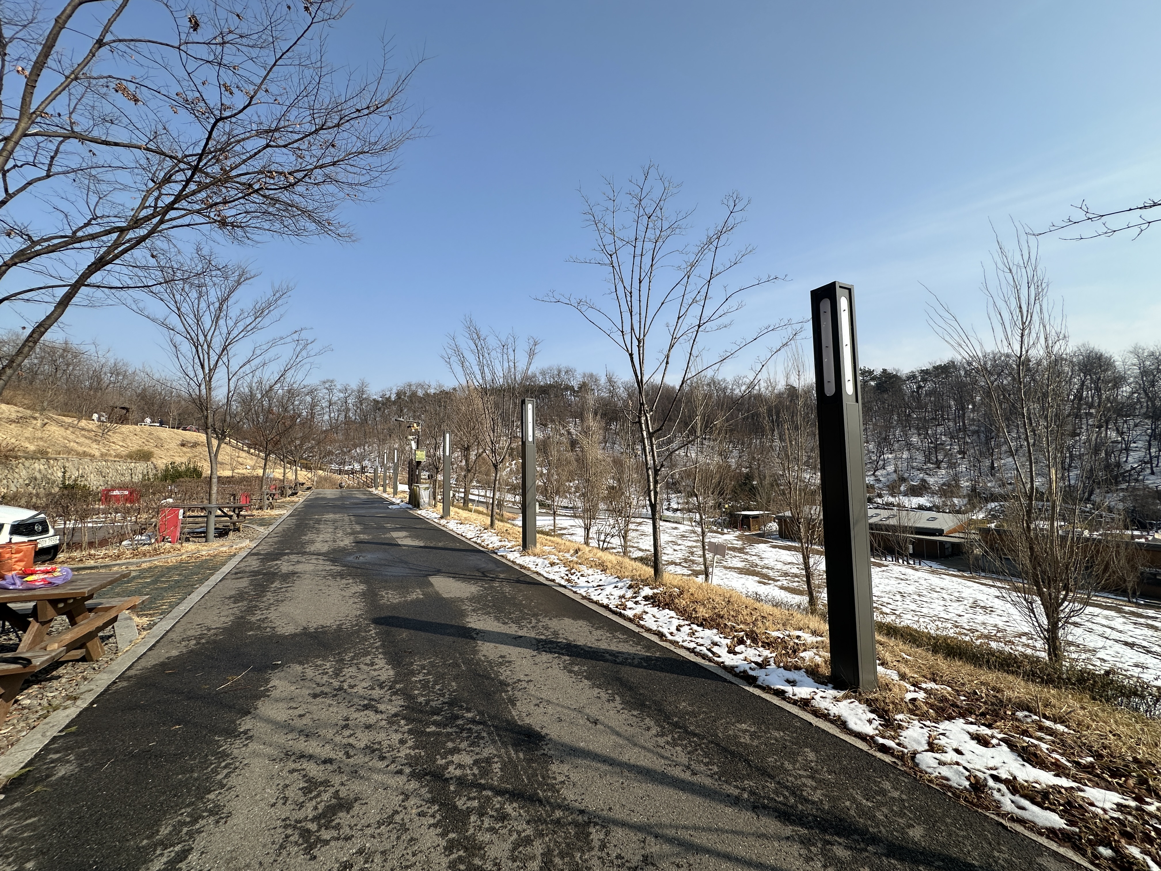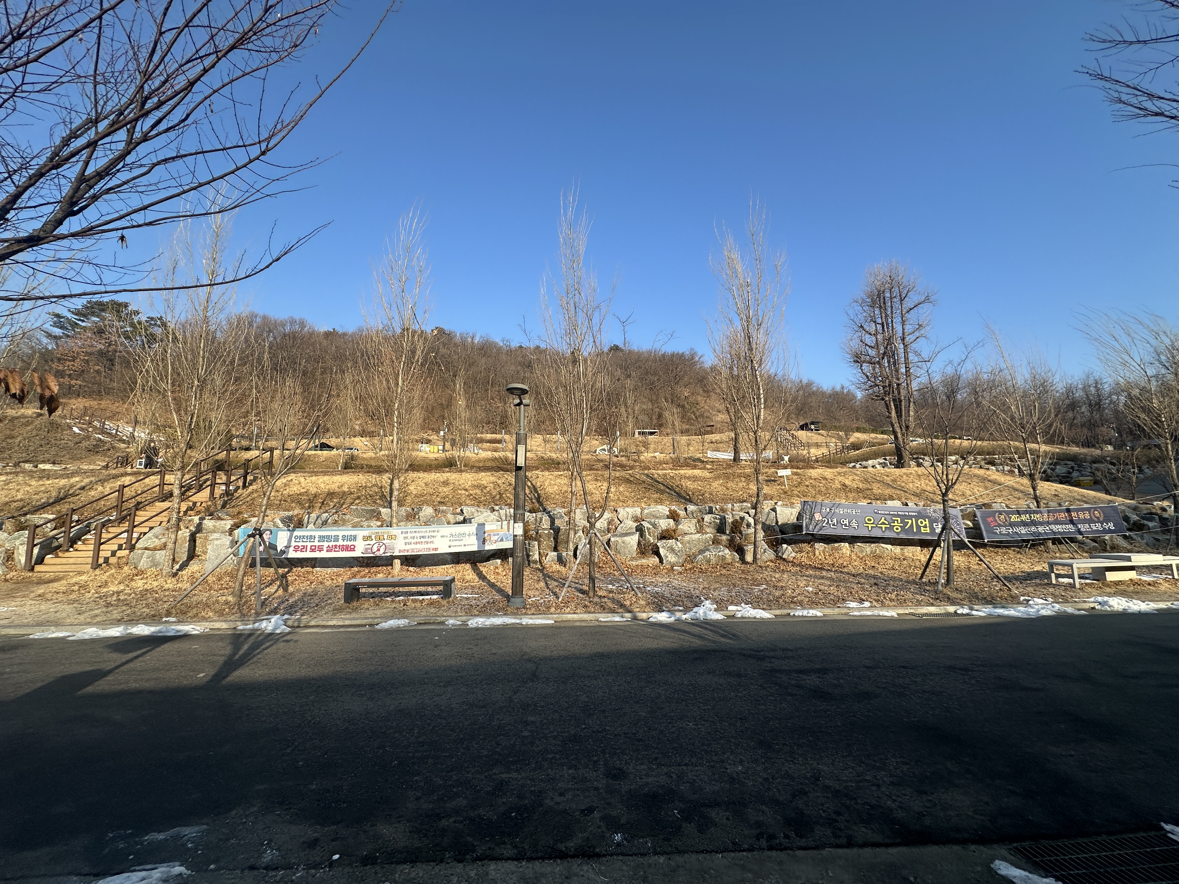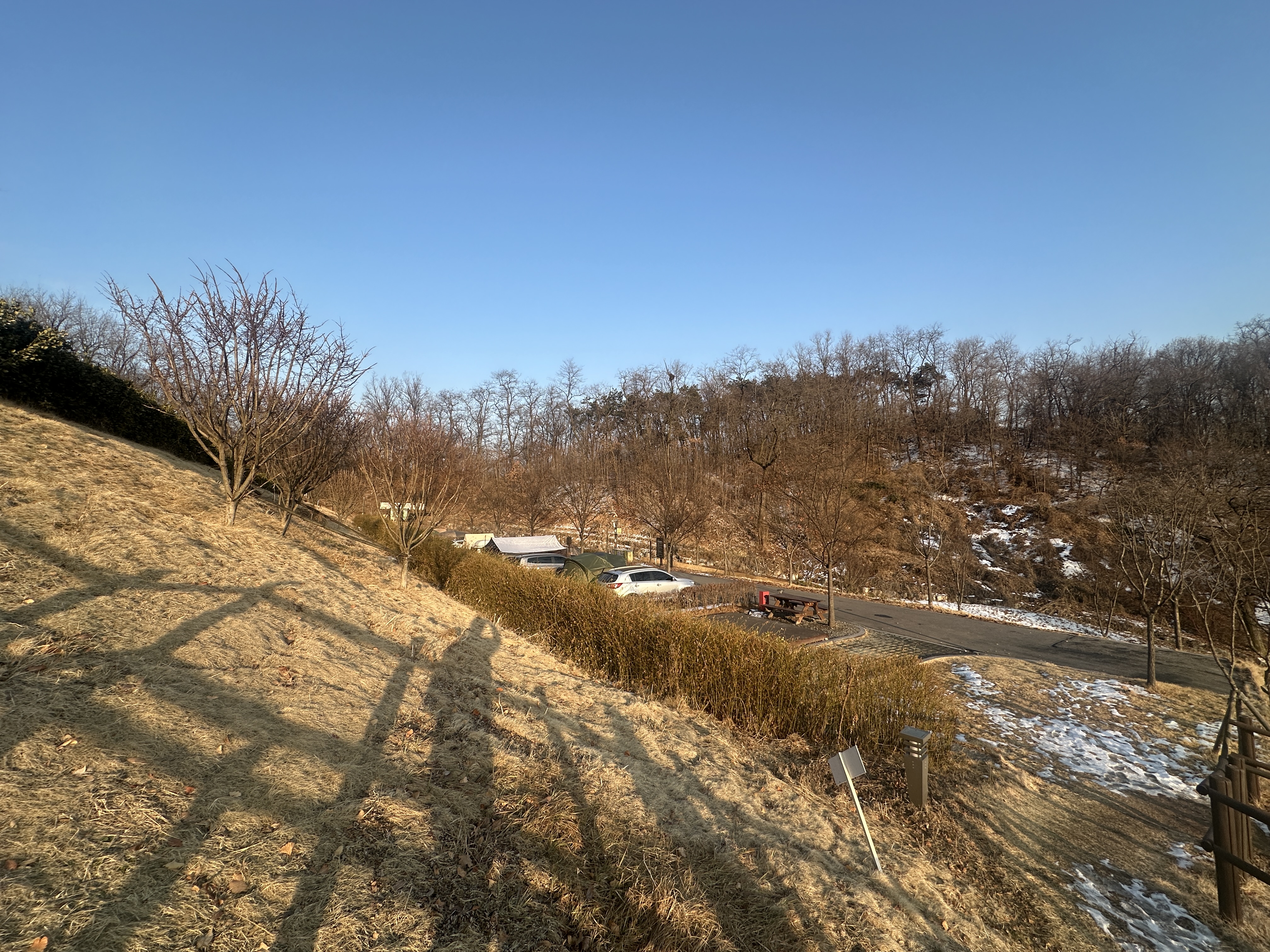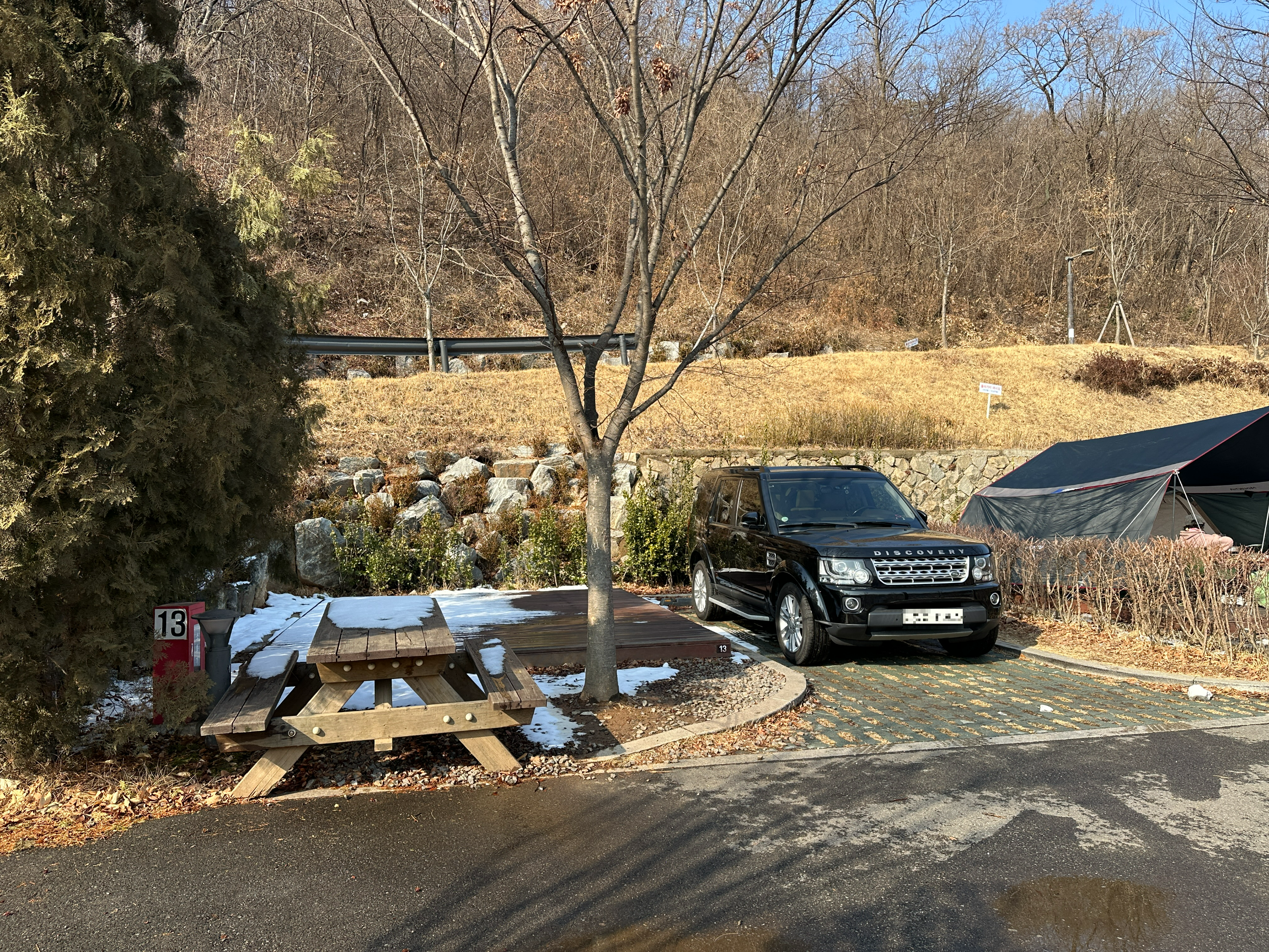 자, 이곳이 구로구 천왕산 가족캠핑장 13번 사이트입니다. 길 끝에 있다고 생각하실 수 있는데, 사진과 같이 언덕쪽에 나무가 무성하게 올라와 있어서 그늘이 져 있는 모습입니다. (체크인시간 기준) 덕분에 눈이 다 녹지 않아서 눈 온 다음에는 조금 불편한 감이 있습니다.