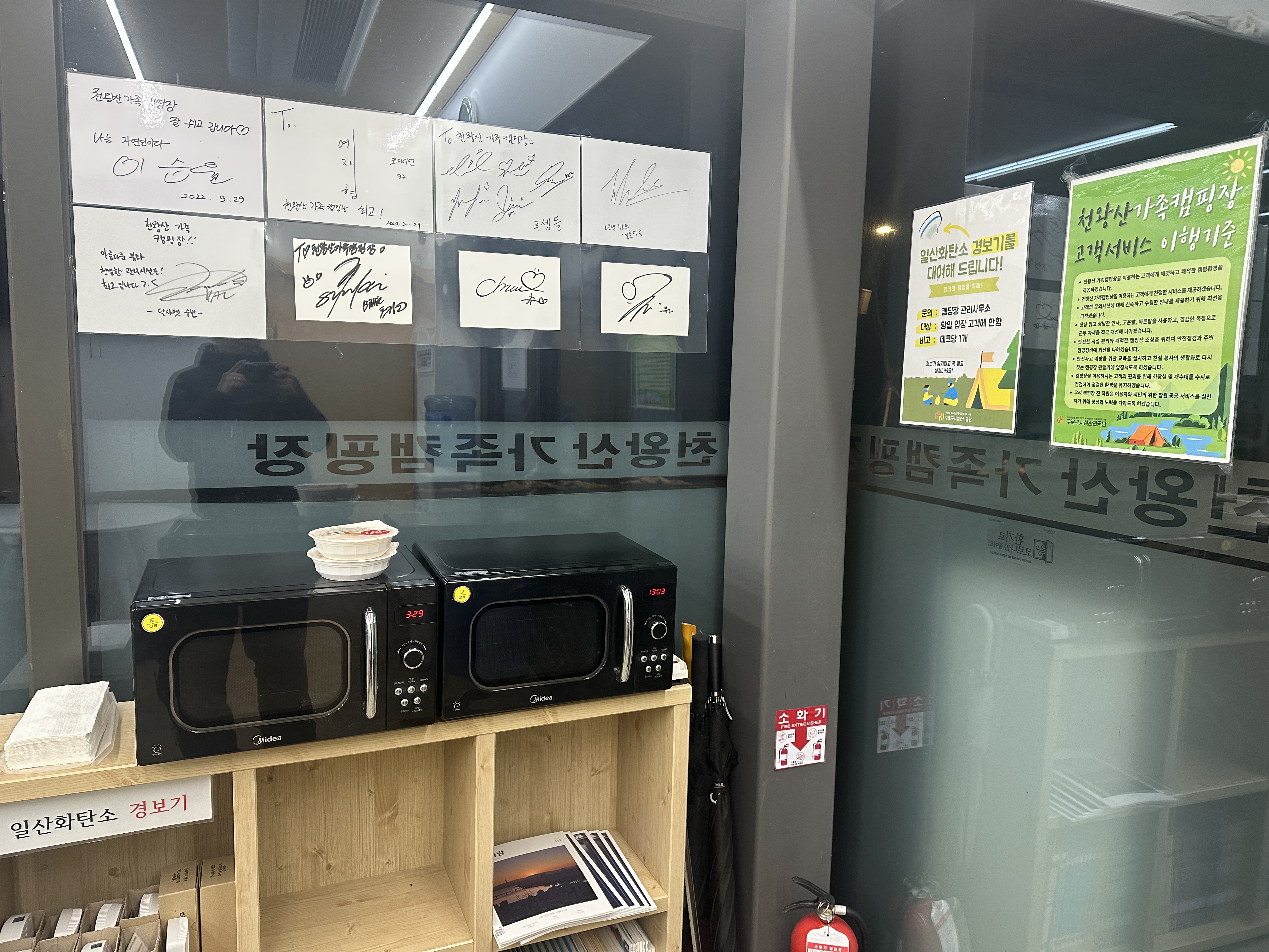 구로구 천왕산 가족캠핑장 관리사무실입니다. 처음에 오시면 이 곳에서 체크인을 하십니다. ㅋㅋㅋ 친절하게 이용안내도 해주시고 기분좋게 캠핑을 시작할 수 있겠습니다. 내부에 전자레인지가 2개 있고, 일산화탄소 경보기도 빌려주시니 깜빡하신 분들은 꼭 빌려서 사고를 예방하시길 바랍니다.