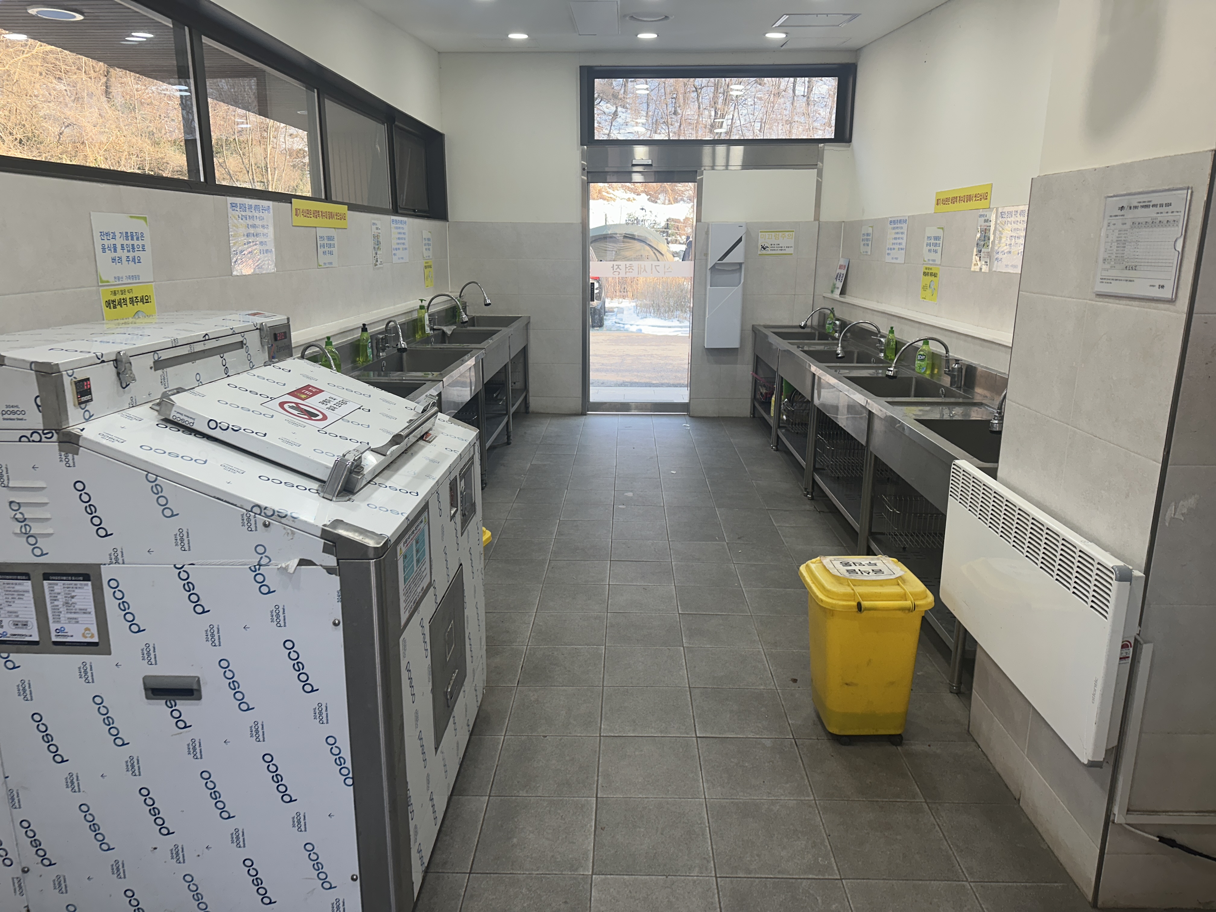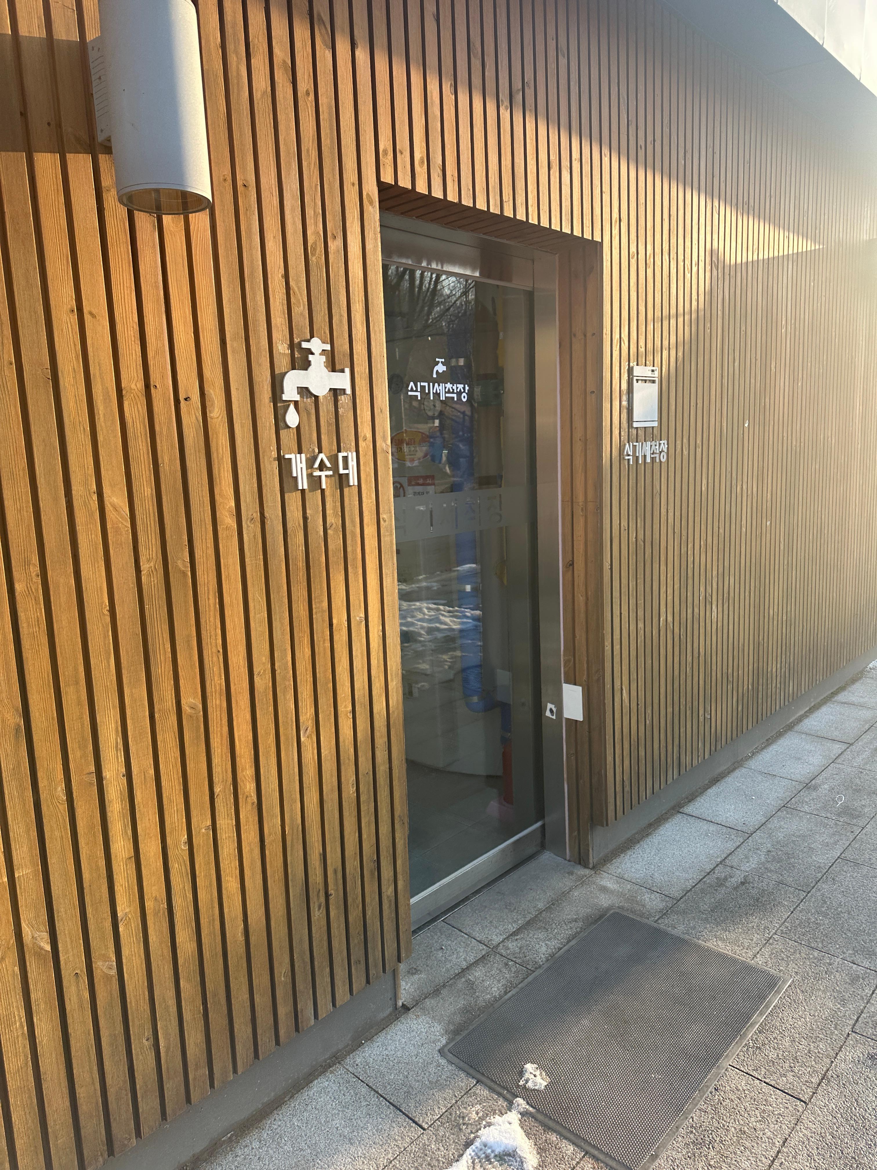 구로구 천왕산 가족캠핑장에는 개수대가 두 곳 있습니다. 언덕 위에도 있지만,사진에는 남기지 못했습니다. 관리동 쪽에 있는 시설은 쾌적합니다. 넓고 싱크대 높이가 낮지 않아서 허리에 무리가 가지 않는 것이 큰 장점 중 하나입니다. 실외는 겨울이라 운영하지 않습니다.