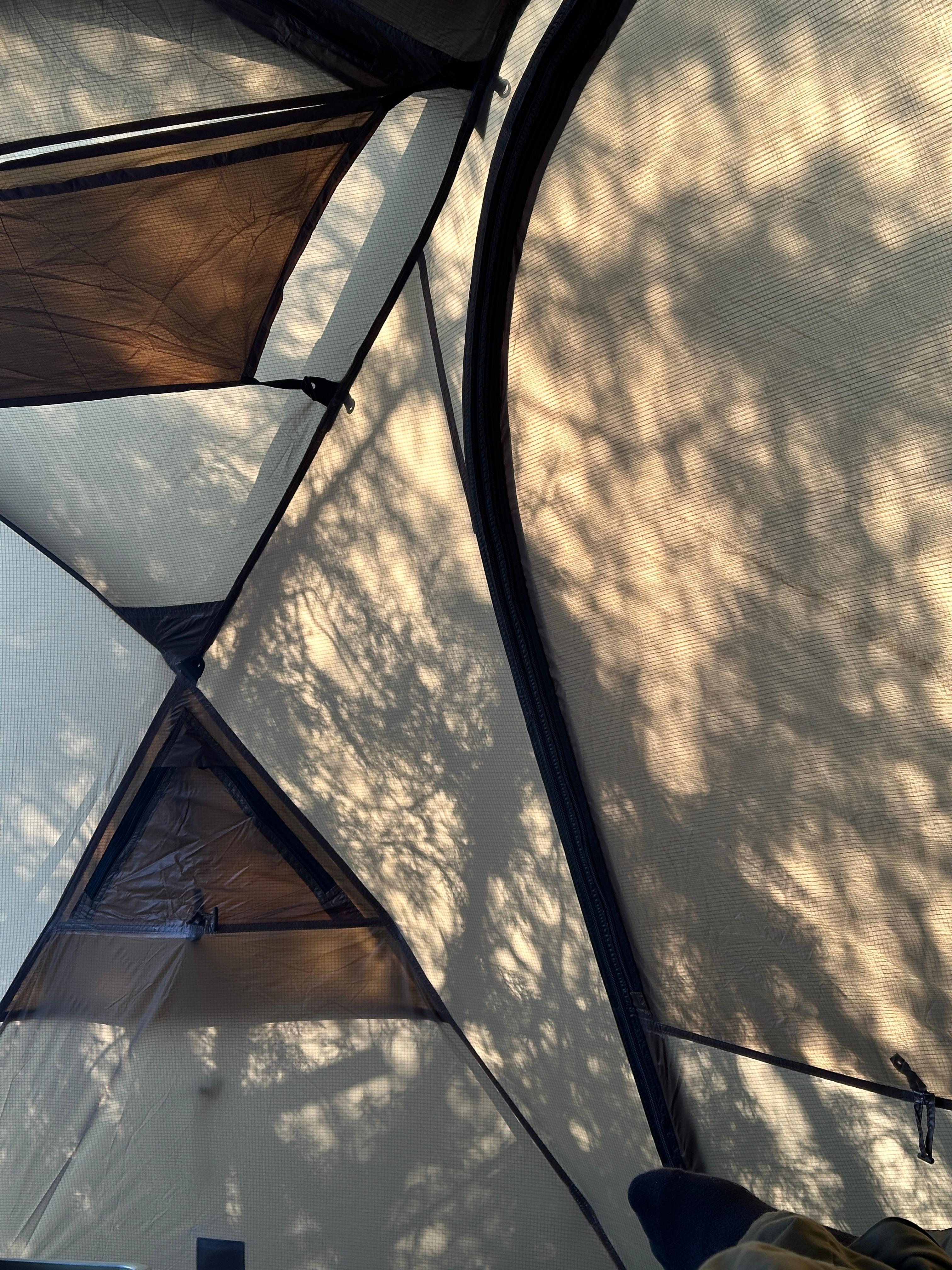나름 캠핑장에서 보는 뷰는 이렇습니다. 계단이 바로 앞이라 사람들이 오가는 점을 제외하면 쾌적하기 그지없습니다. 나름 텐트에 비치는 그림자도 아름답습니다.