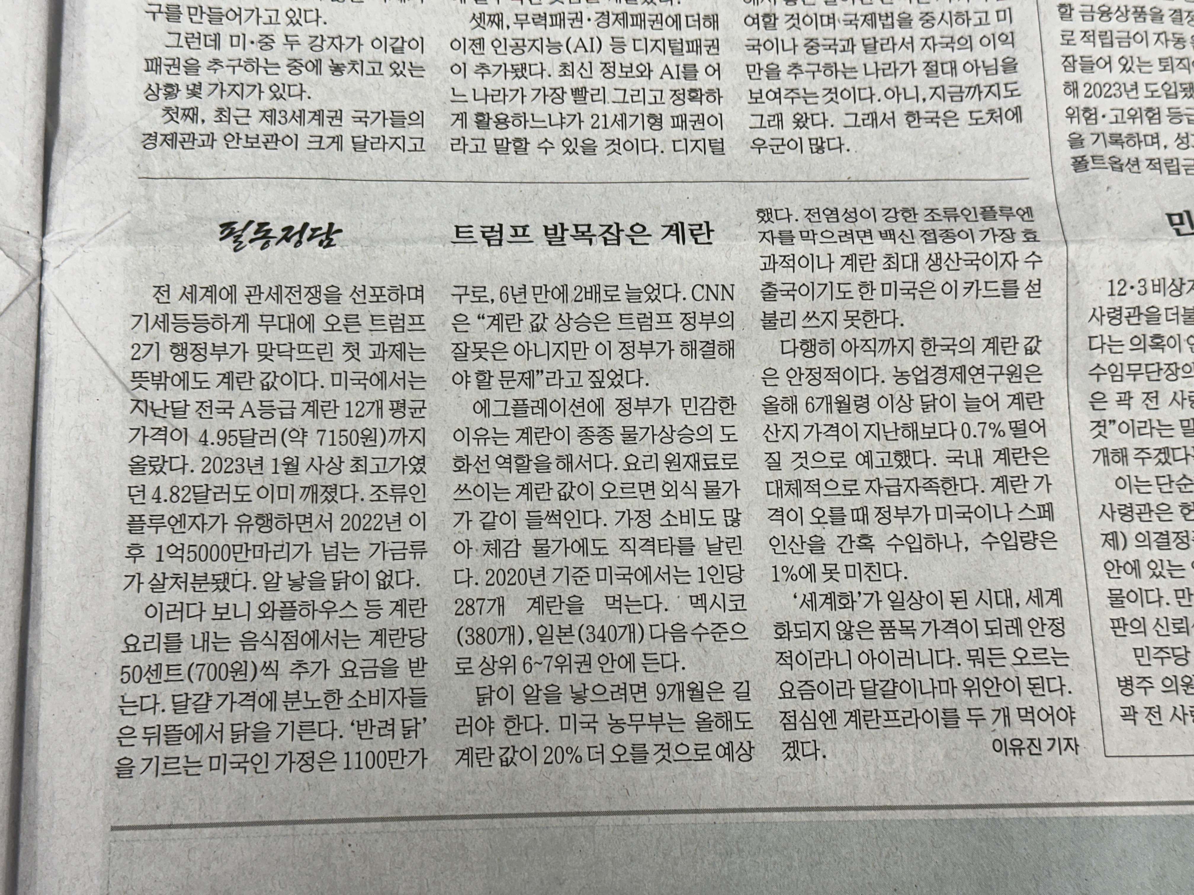 오늘의 기사는 매일경제 2025년 2월 19일 신문이고, 필동정담이라는 섹션에서 발견한 에그플레이션에 대한 이야기이다.