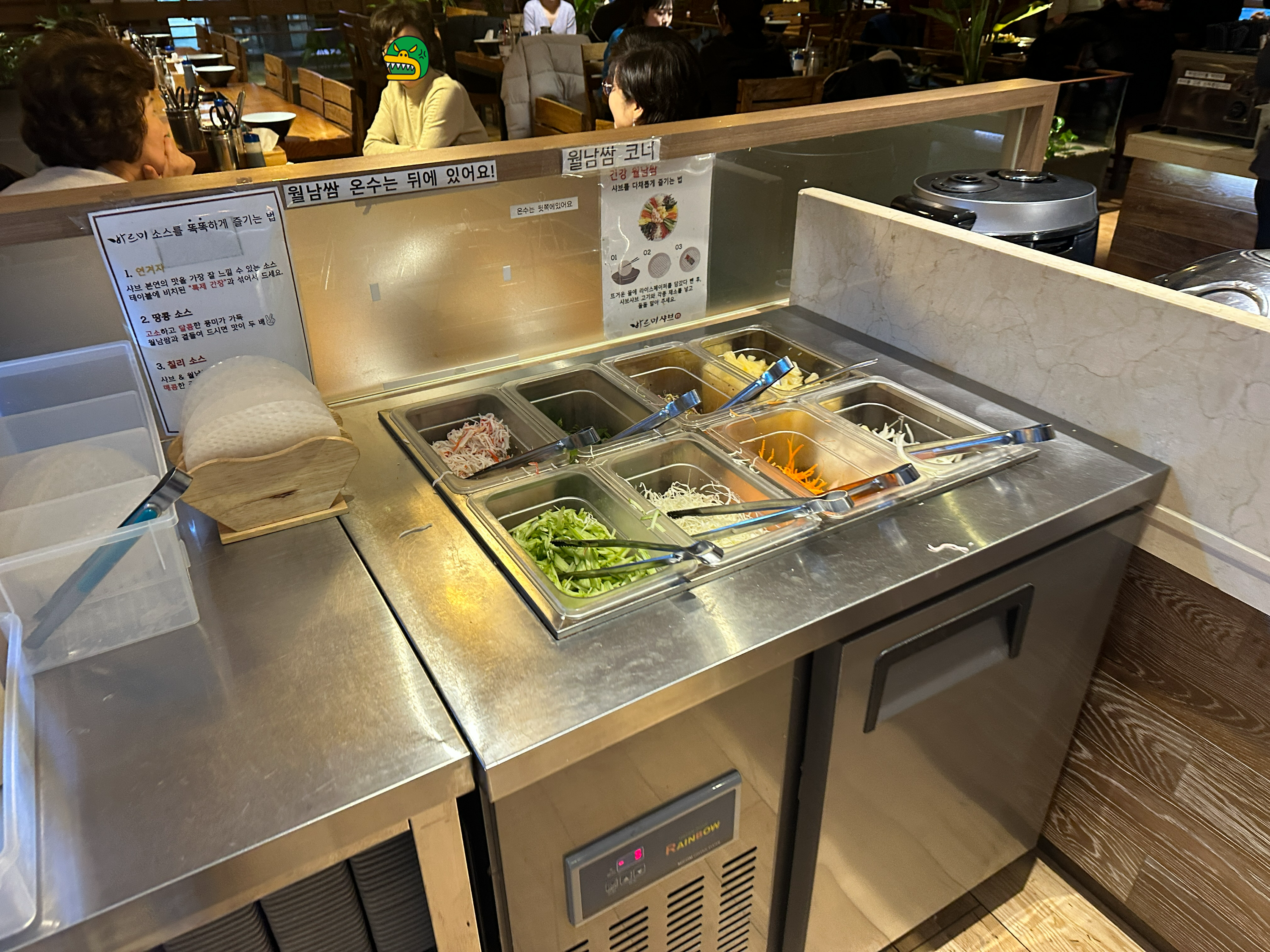매장의 중간에는 다양한 음식이 비치되어 있는 샐러드바가 있습니다. 깔끔하고 또 적당히 다양한 식재료들이 있어서 입맛에 맞게 찾아볼 수 있습니다.