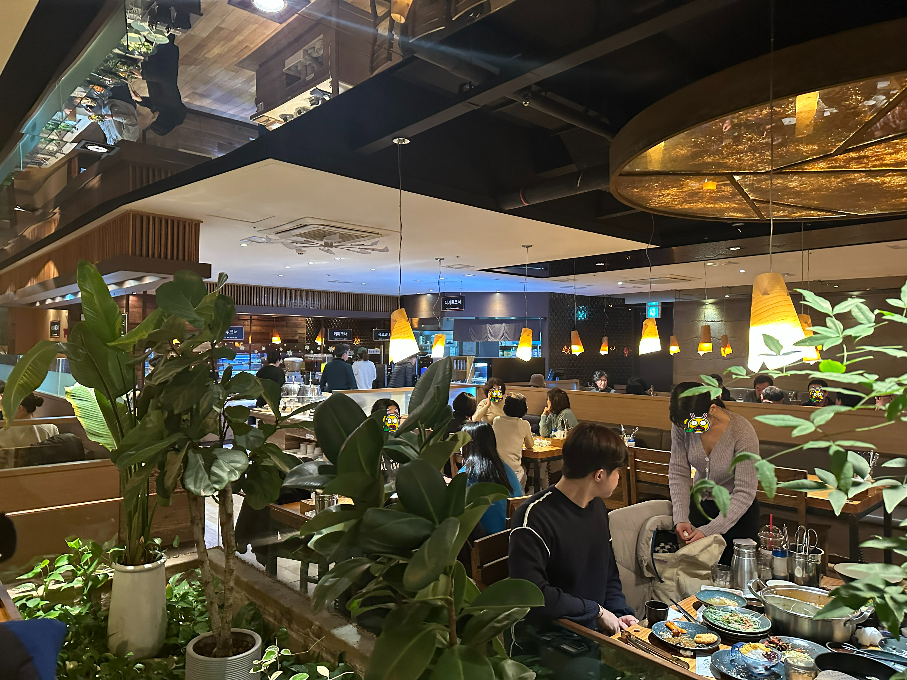 바르미샤브샤브N칼국수 구의점 매장 크기는 상당히 큰 편입니다. 넓은 공간에 뭔가 푸릇푸릇한 느낌이 물씬 나는 그런 매장이고, 좌석간 간격이 넓은 편입니다. 배치를 잘 해 두셔서 그런 것 같아요.