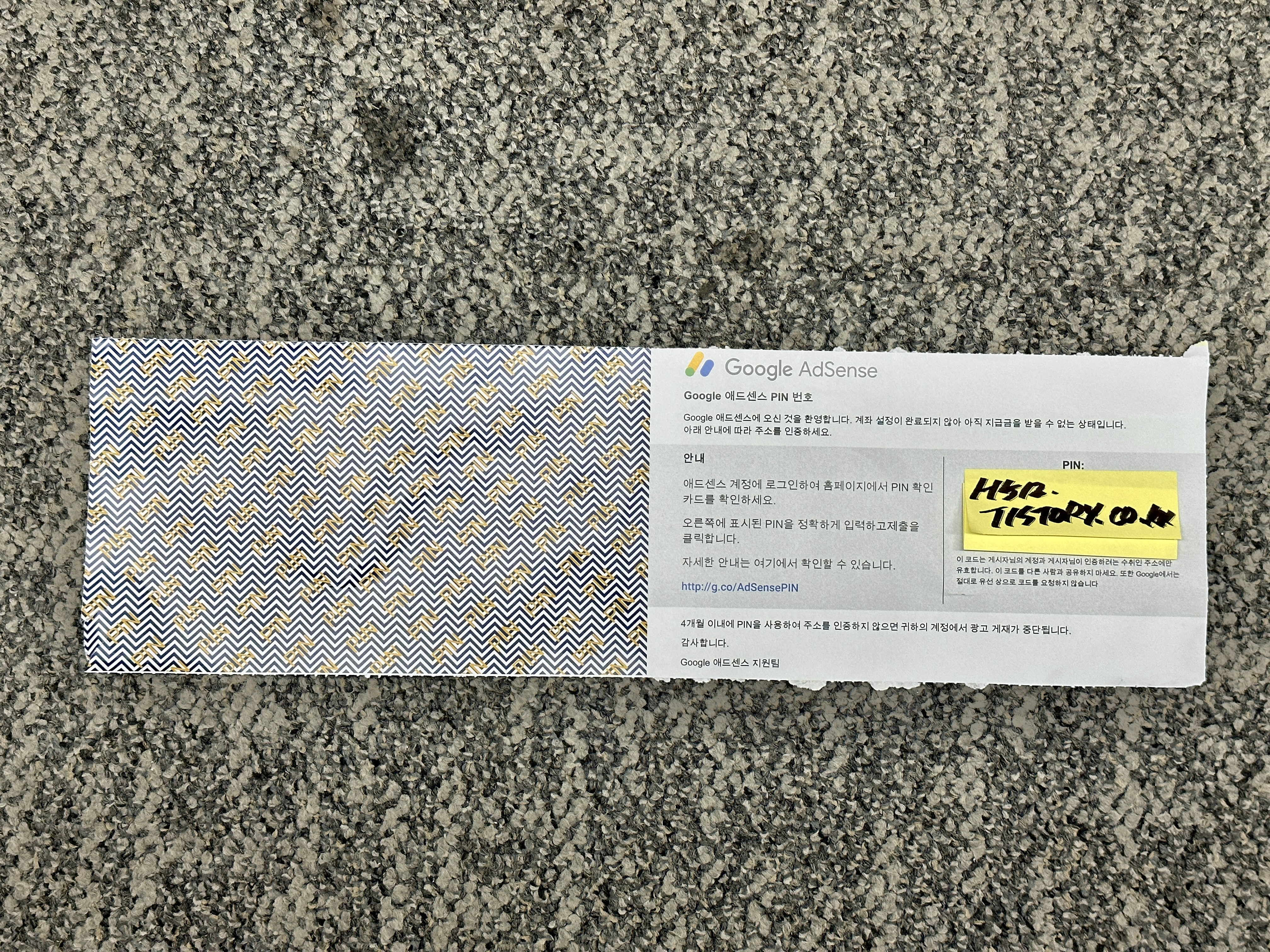 구글 애드센스(Google Adsense) 주소인증 편지 내용물은 간단합니다. 6자리의 PIN 번호가 적혀있고, 반대편은 내용물을 비춰볼 수 없도록 하는 면이 붙어있습니다. 마치 매직아이를 보는 듯합니다. ㅋㅋㅋ