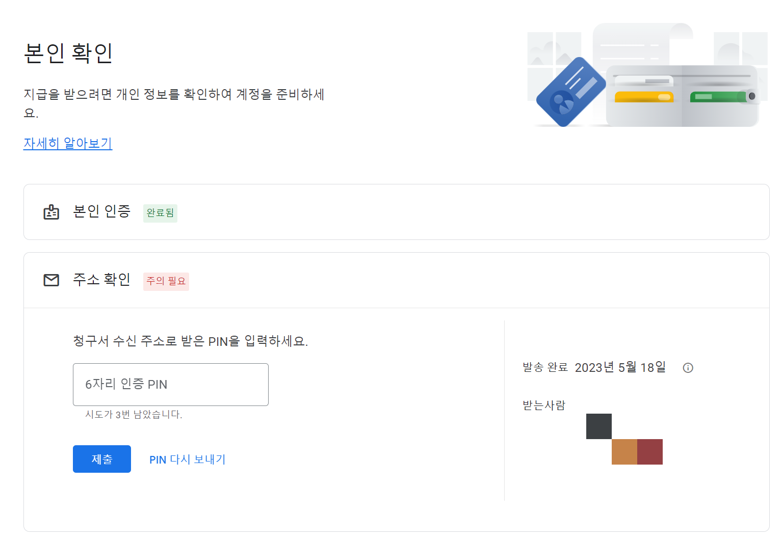 구글 애드센스(Google Adsense) 주소확인을 보면, 아까 확인한 6자리 PIN을 입력하는 란이 보입니다. 정확히 입력해 줍니다. 3회 시도 가능합니다.