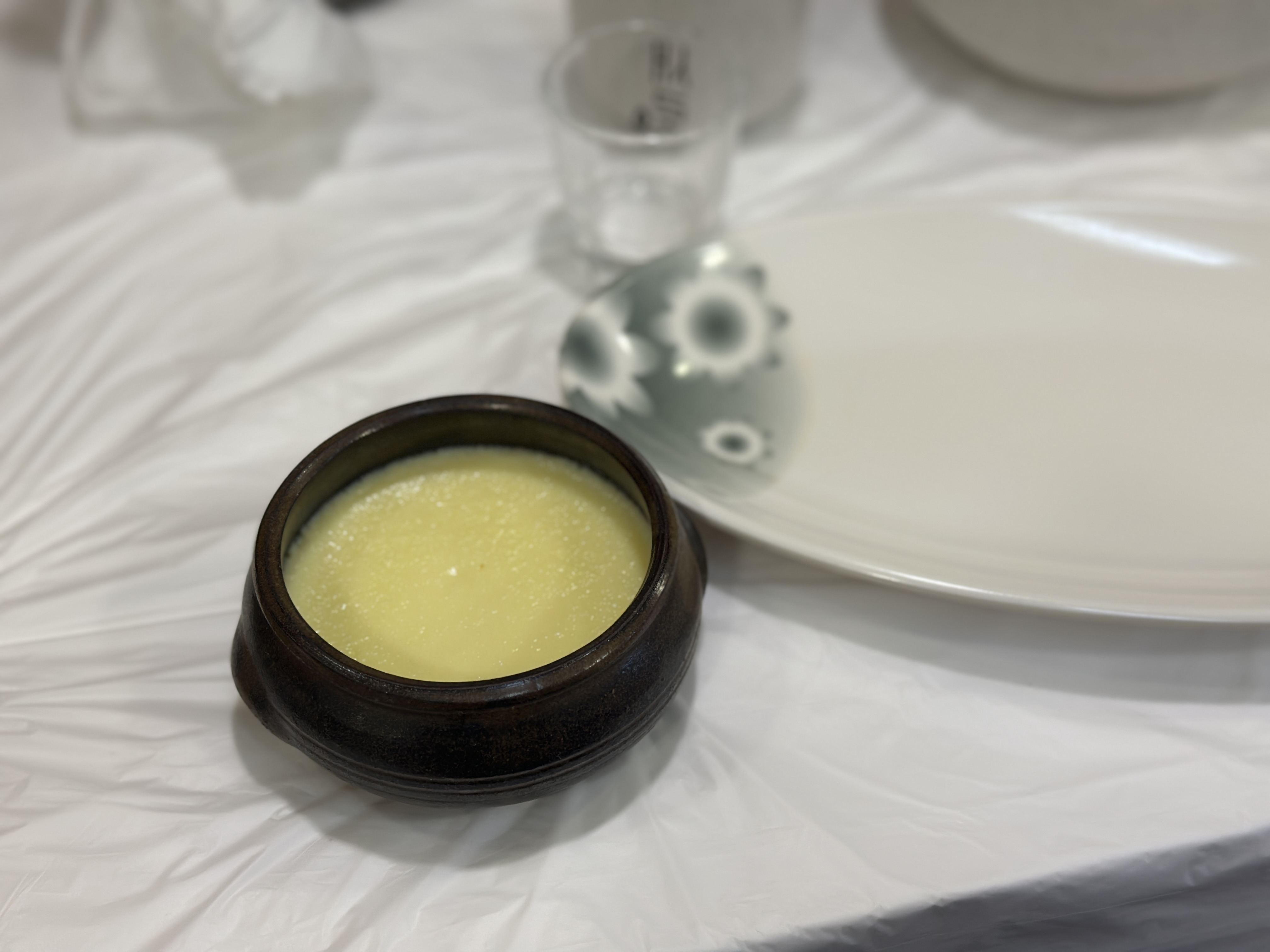 정통코다리의 테이블세팅입니다. 콩나물과 김치, 숭늉이 나오는 게 특징이고, 테이블에 김장비닐은 꼭 장례식장같네요 ㅋㅋㅋㅋ 잠시 있으니 1인당 1계란찜을 주십니다. 약간 계란냄새가 나긴 하지만 부드럽긴 엄청나게 부드럽습니다.