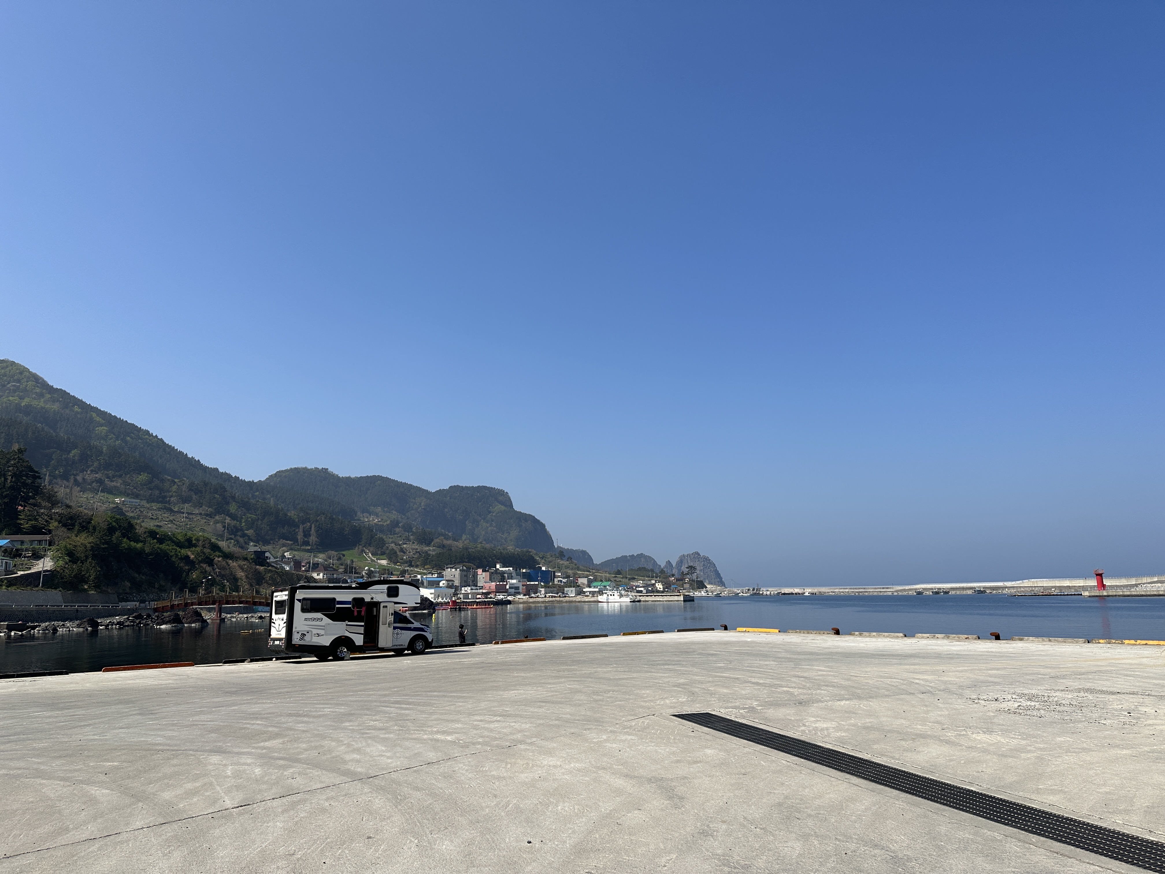 현포항으로 이동하는 길은 또 다른 느낌입니다. 저동항과는 또 다른 느낌의 평화로운 분위기와 고요함이 매력인 항구입니다. 앞에 보이는 캠핑카에는 한 가족이 타고 왔는데, 낚시도 하고, 웃고 떠들며 행복한 시간을 보내고 있었습니다.