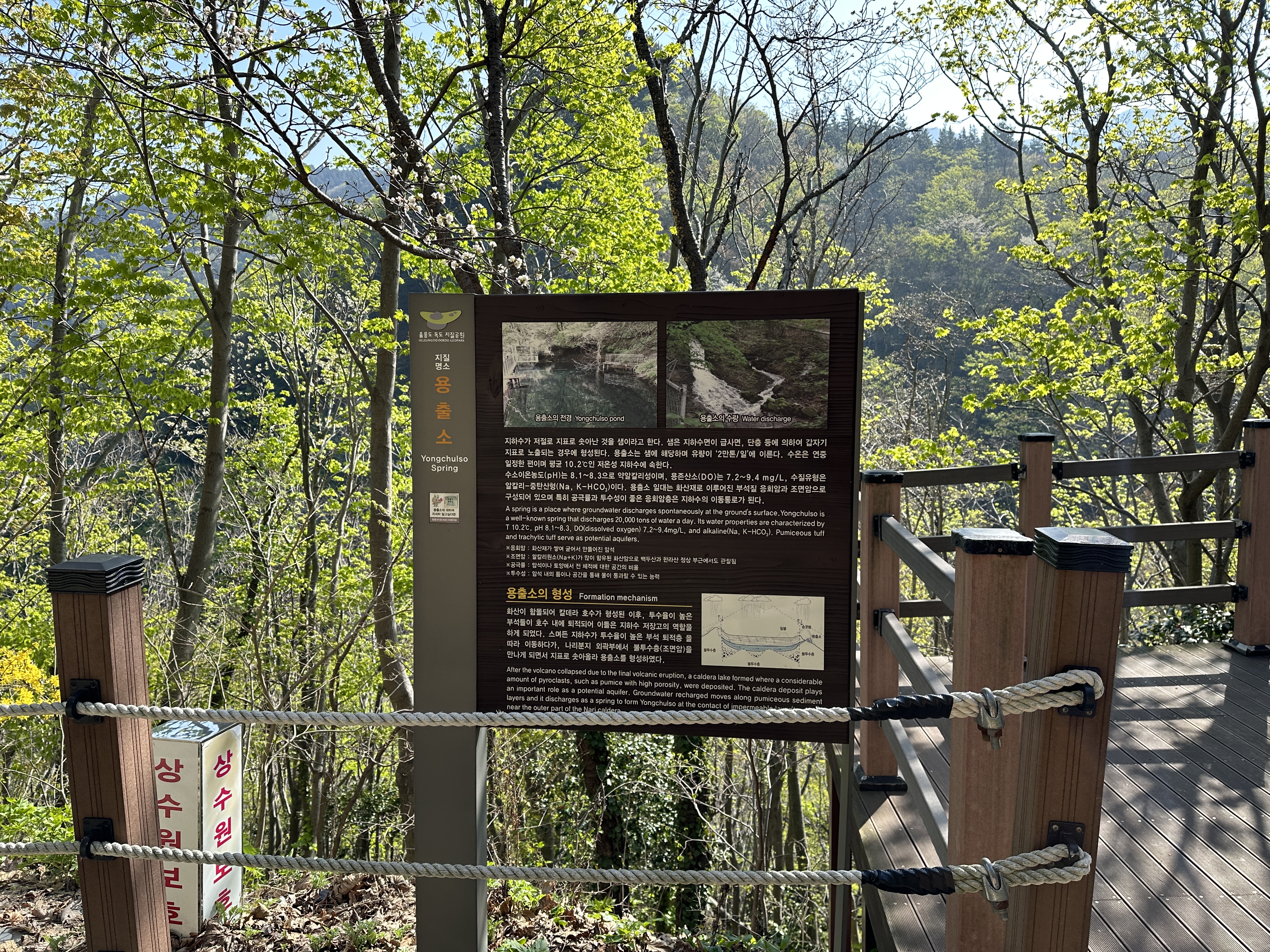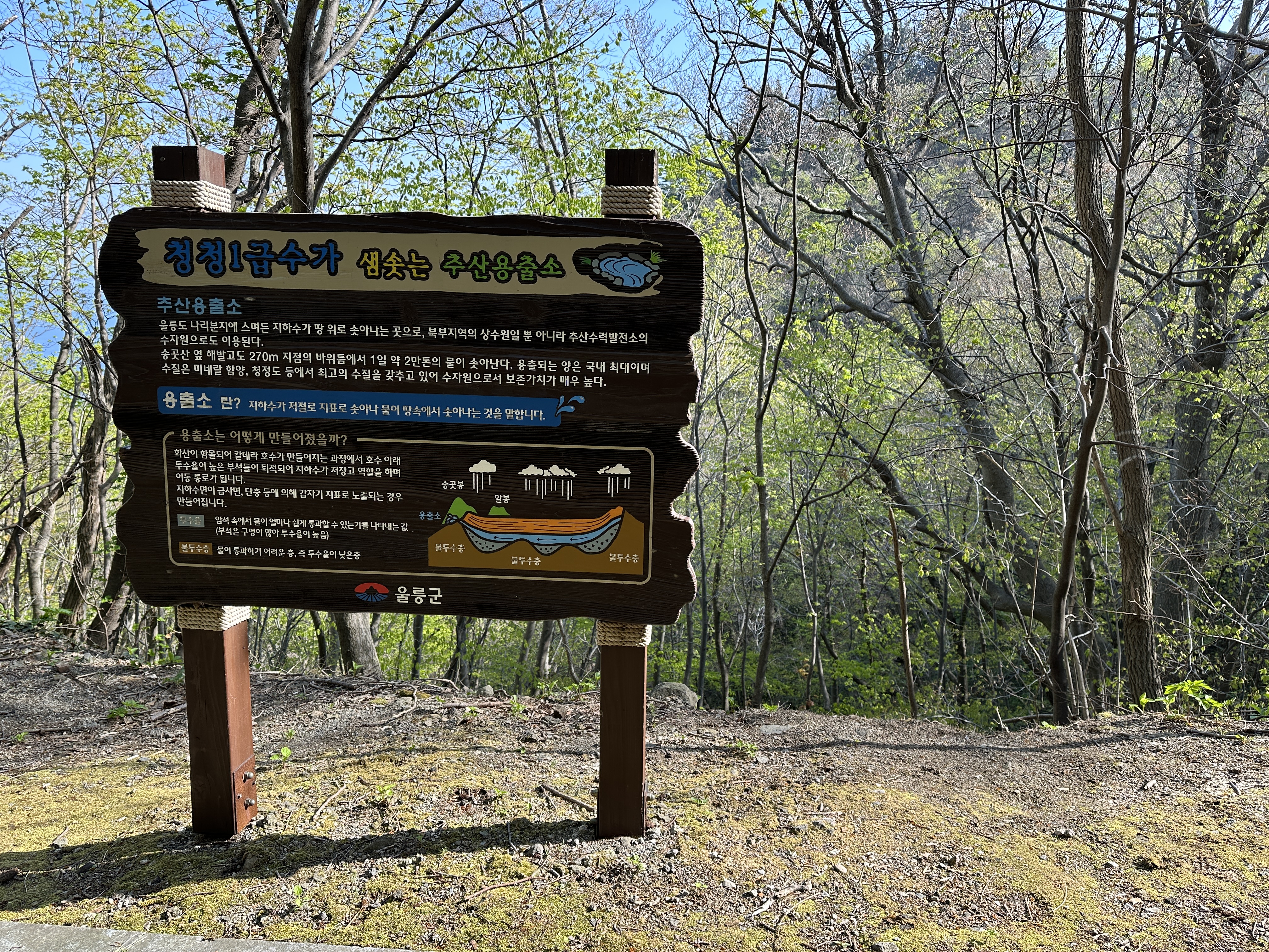 용출소 안내 표지판이 보이고, 졸졸졸졸 소리가 아래 멀리에서 들려옵니다. 생각보다 가파른 경사 아래에 청정1급수가 나오는 용출소가 있습니다. 여기서 나오는 물들이 북부지역의 상수원이라고 할 정도로 대단한 곳이었네요. 물론 접근은 안됩니다. ㅎㄷㄷ