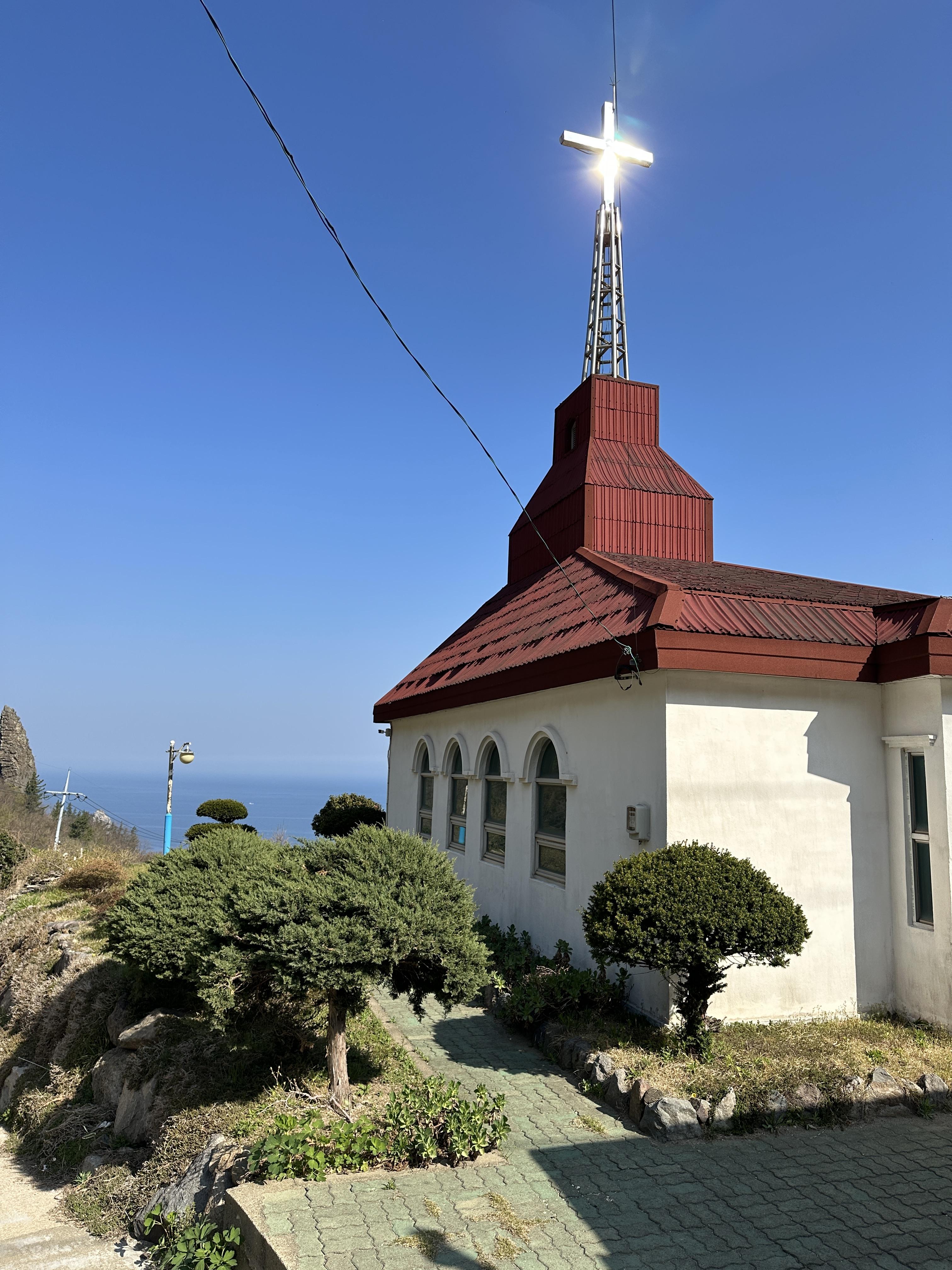 교회다니지는 않습니다만, 십자가에 비친 태양빛과 지붕 색깔, 바다, 하늘 색깔 모든게 너무 예뻐보여서 한 장 찍었습니다. 건물도 느낌있네요 ^^
