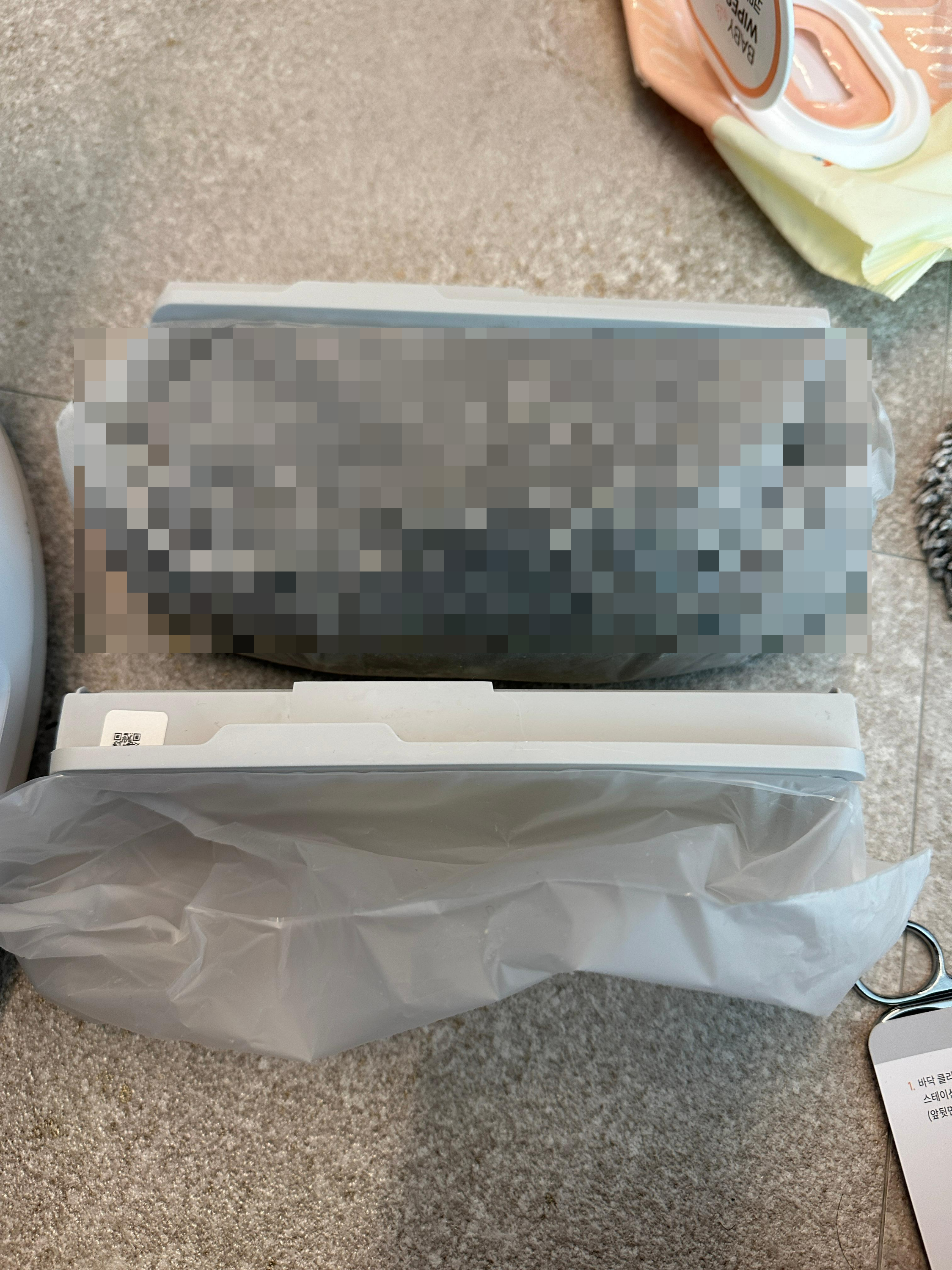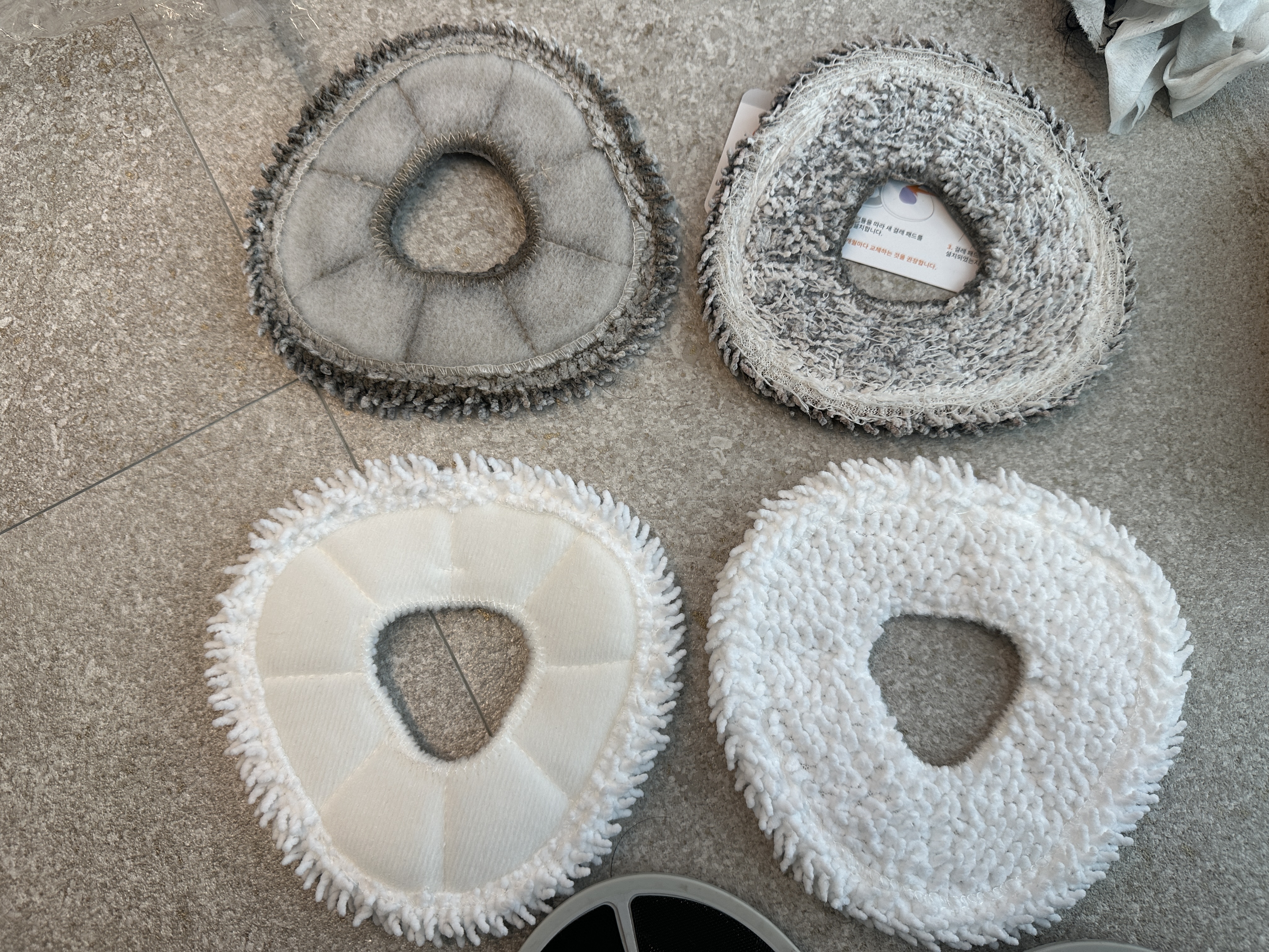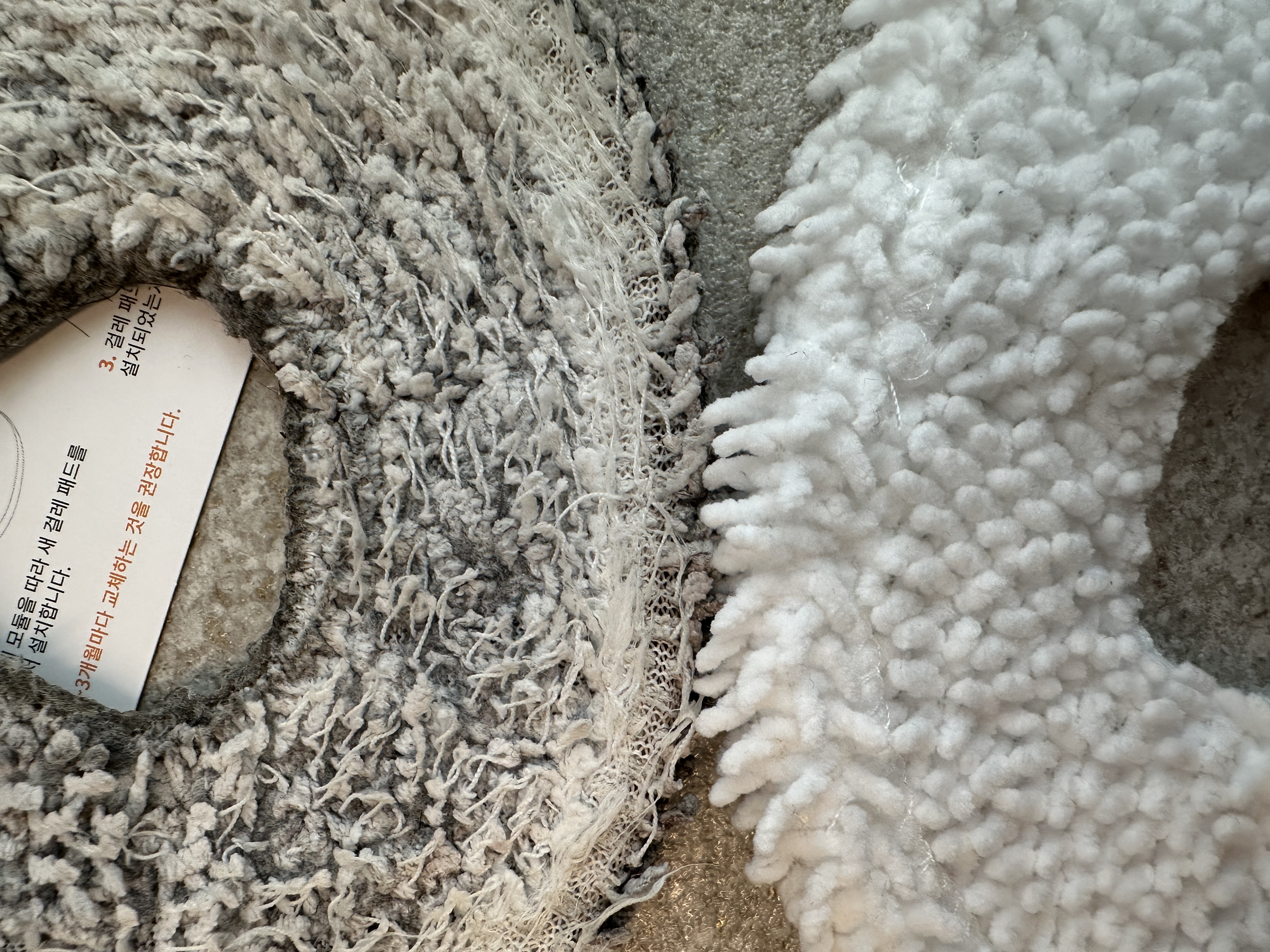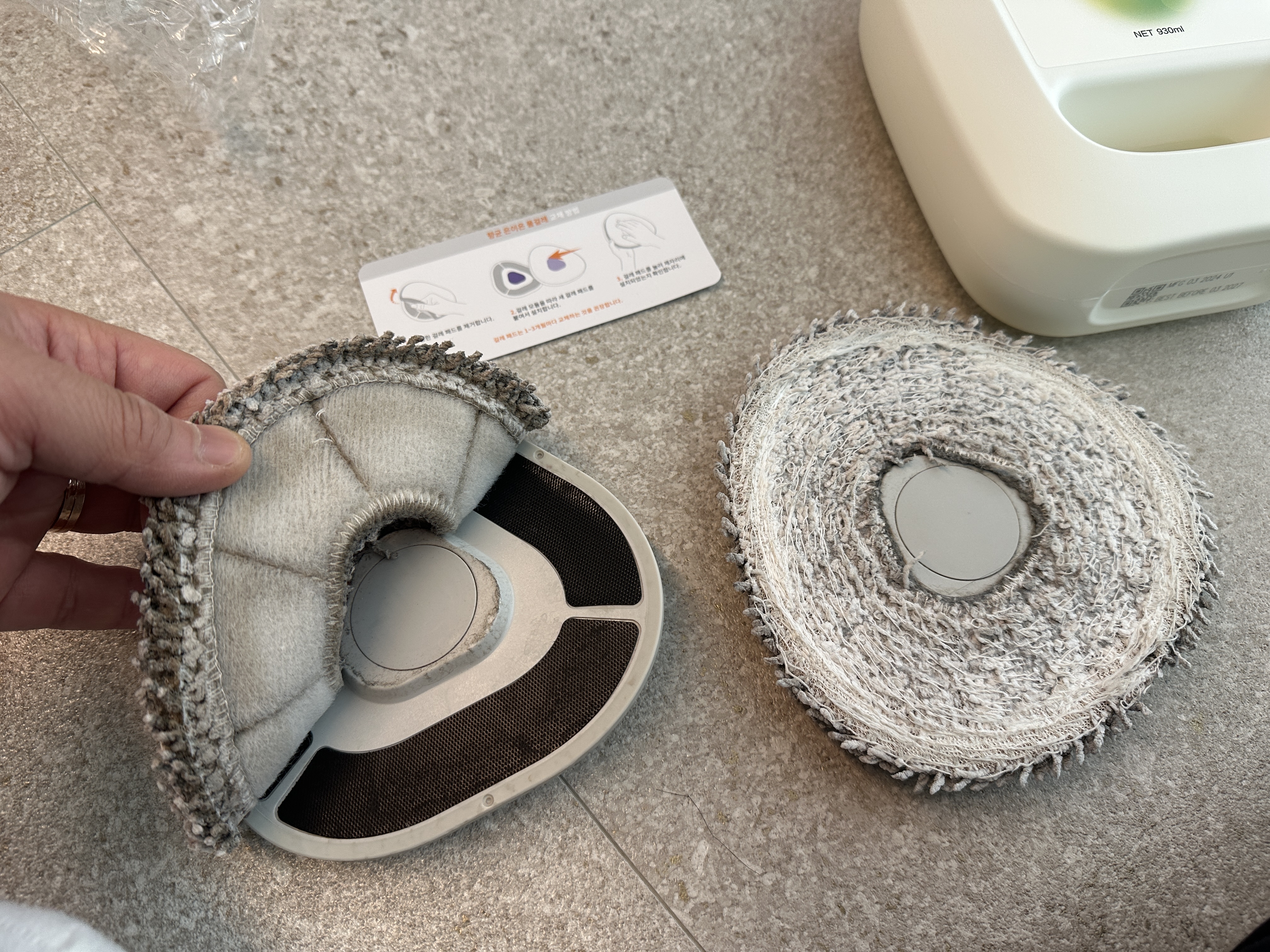 먼저 물걸레를 꺼내봅니다. 그냥 잡아서 떼 내면 찍찍이에서 떨어져 나옵니다. ㅋㅋㅋ 확연하게 새제품과의 차이가 느껴집니다. ㅠ 1년까지 쓴게 용하네요. 요새 잘 안닦인다 싶었는데, 신품과 비교해보니 교체를 너무 늦게해줘서 미안한 마음이 듭니다... 들어보니 물걸레 자체의 압이 강해서 저렇게 금세 변한다고 하네요.