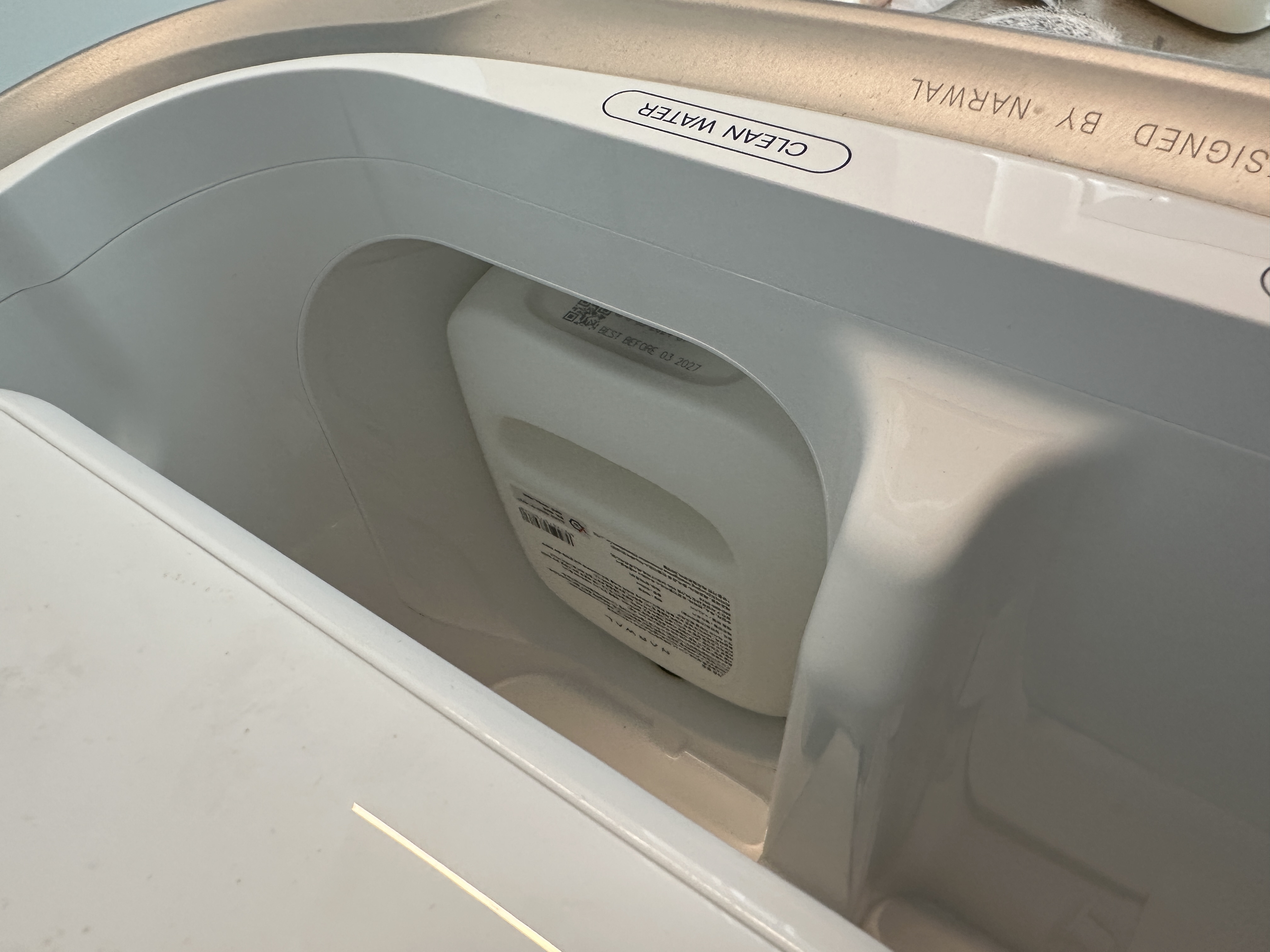 나르왈 로봇청소기 프레오X울트라의 클리너는 물걸레 세척에 활용되는데요, 본체에 밀어넣게 되어 있습니다. 사진처럼 클리너 상단의 스티커를 떼고, 거꾸로 꽂아주면 됩니다. 앞뒤면은 없으니 걱정없이 꽂으시면 되구요.