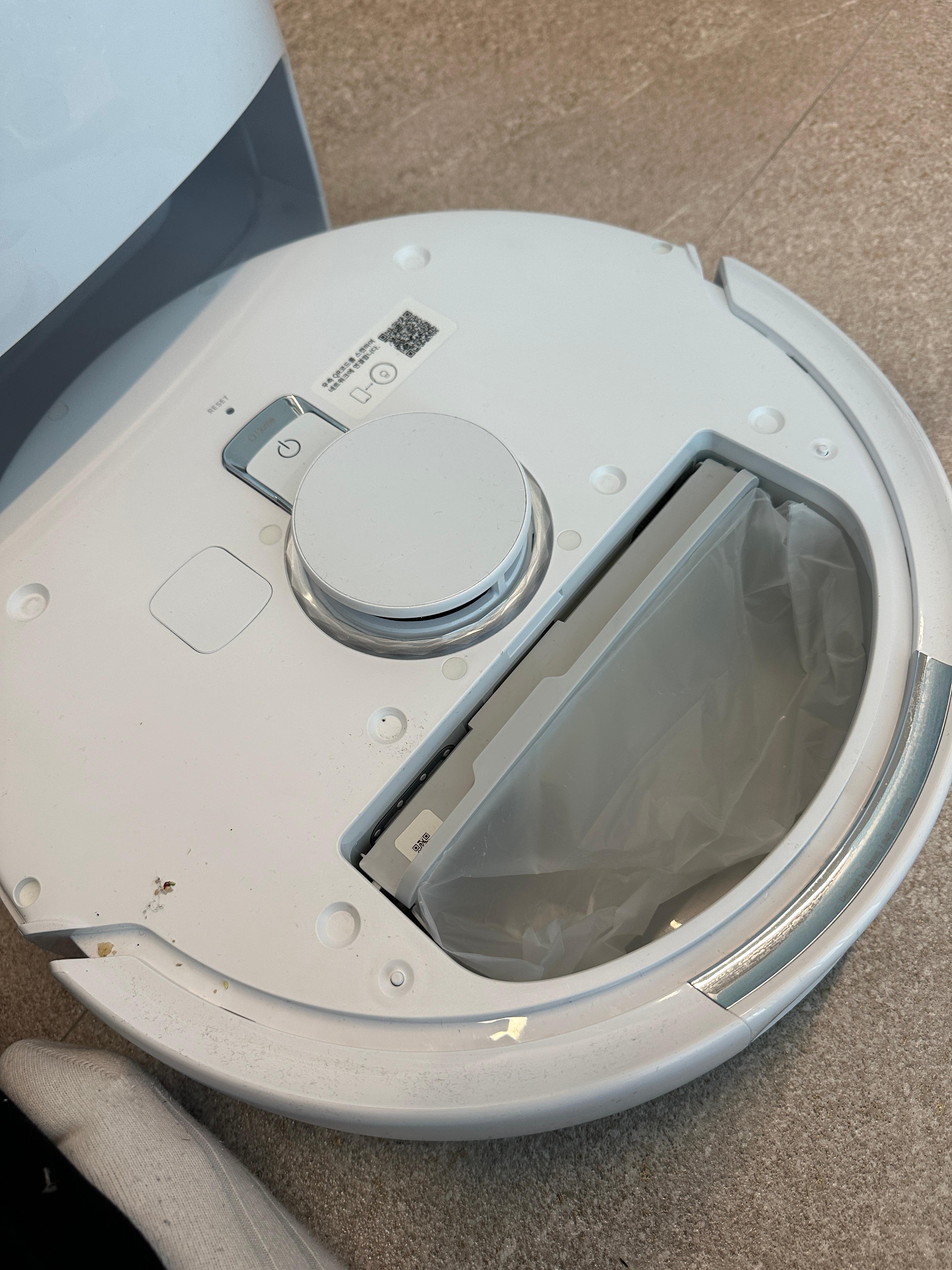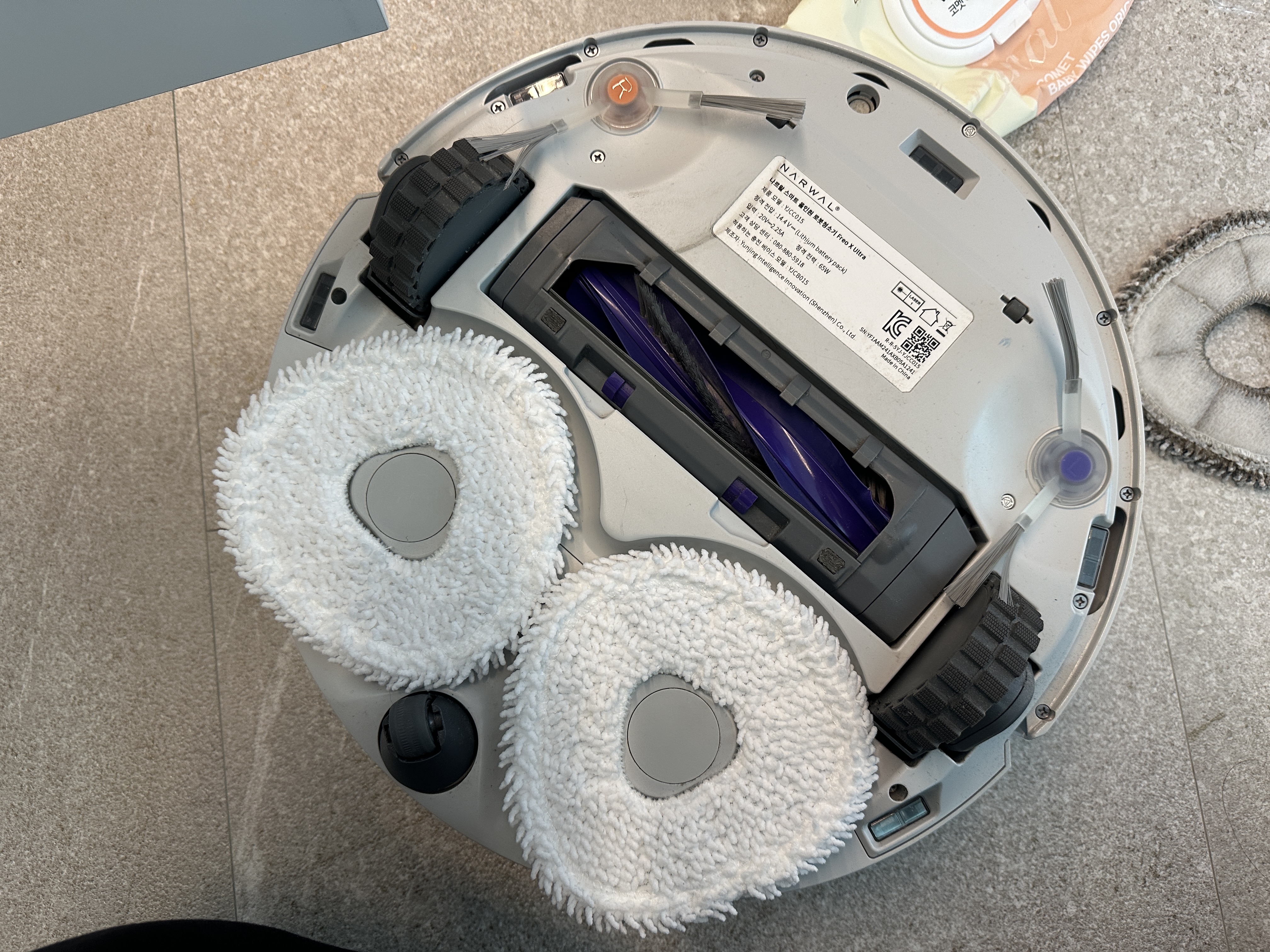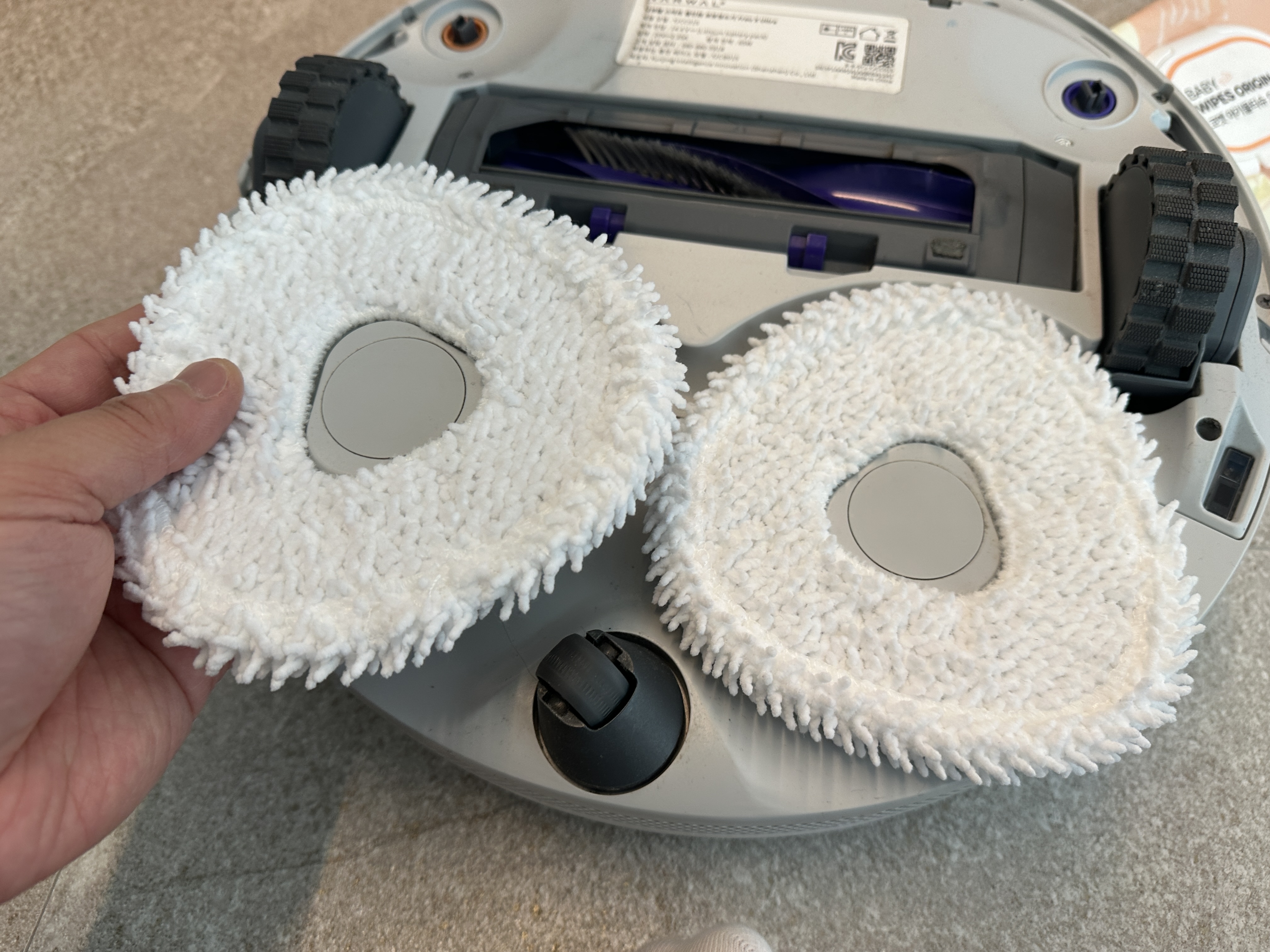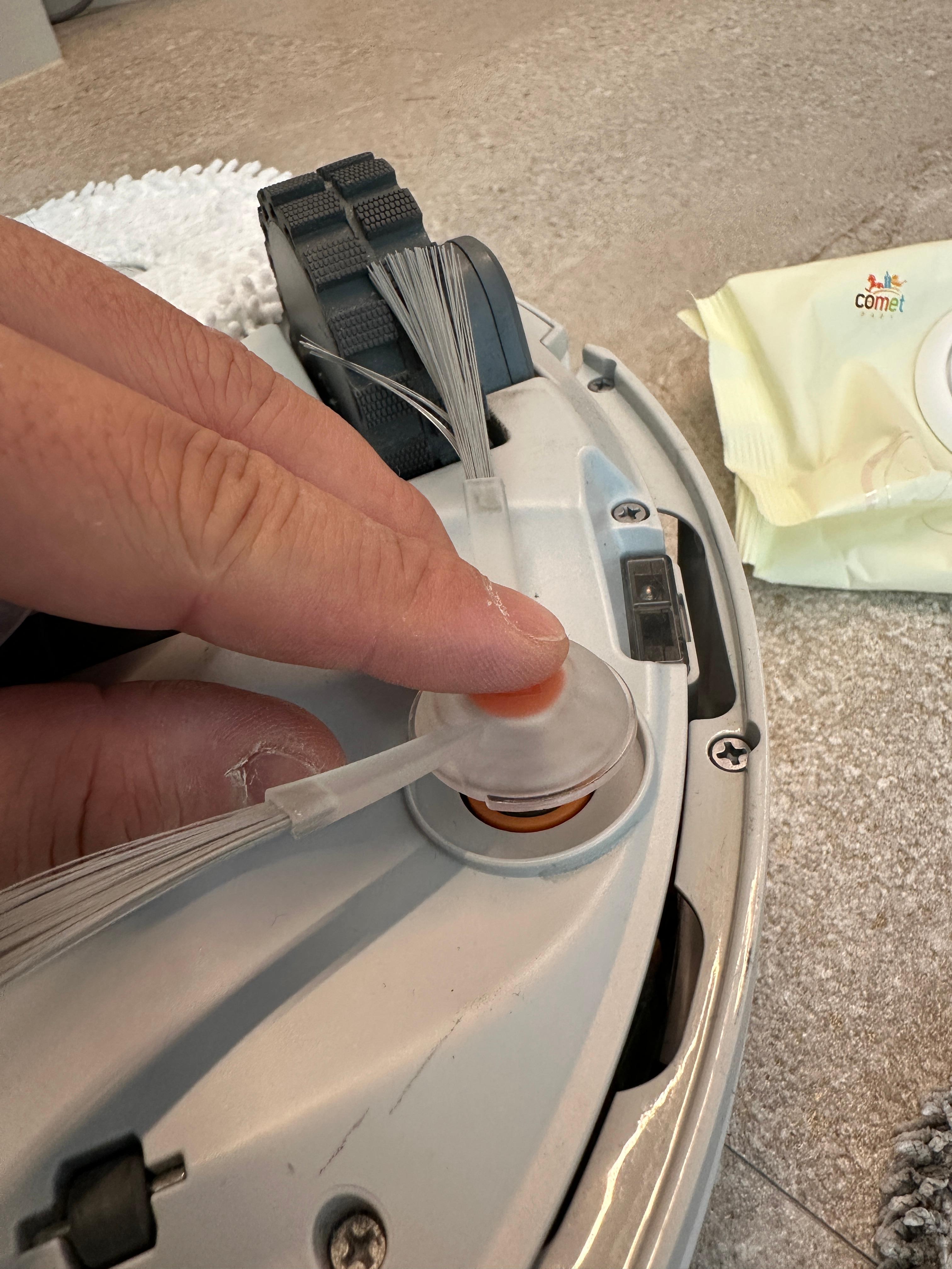 다 사용한 사이드브러시와 물걸레를 떼 냅니다. 결합이 느슨한 건 아니지만, 분리가 어려운 상태는 아니라서 쉽게 똑 하고 떨어집니다.