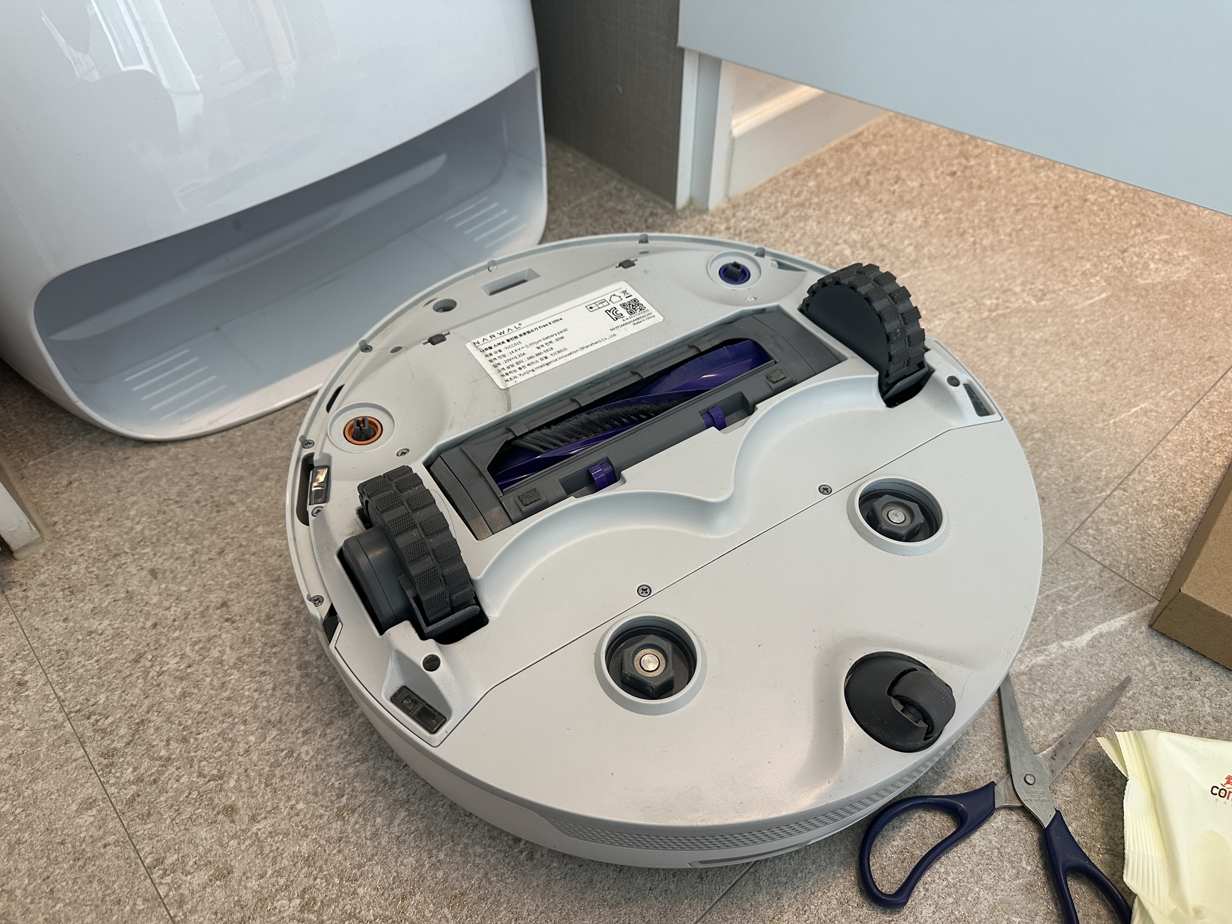 벌써 인테리어가 끝난 지도 1년이 되었습니다. 인테리어 중에 구입한 녀석인데, 나르왈 프레오X울트라 라는 로봇청소기입니다. 나름 구입할 때는 직수관도 연결하고 깔끔하게 잘 쓰고 있던 녀석입니다. 성능이나 사용후기는 아니지만, 간략하게 말하자면 로봇청소기는 정말 직장인 맞벌이 부부에게 최고의 아이템이라고 봐도 과언이 아닙니다. ㅋㅋㅋ