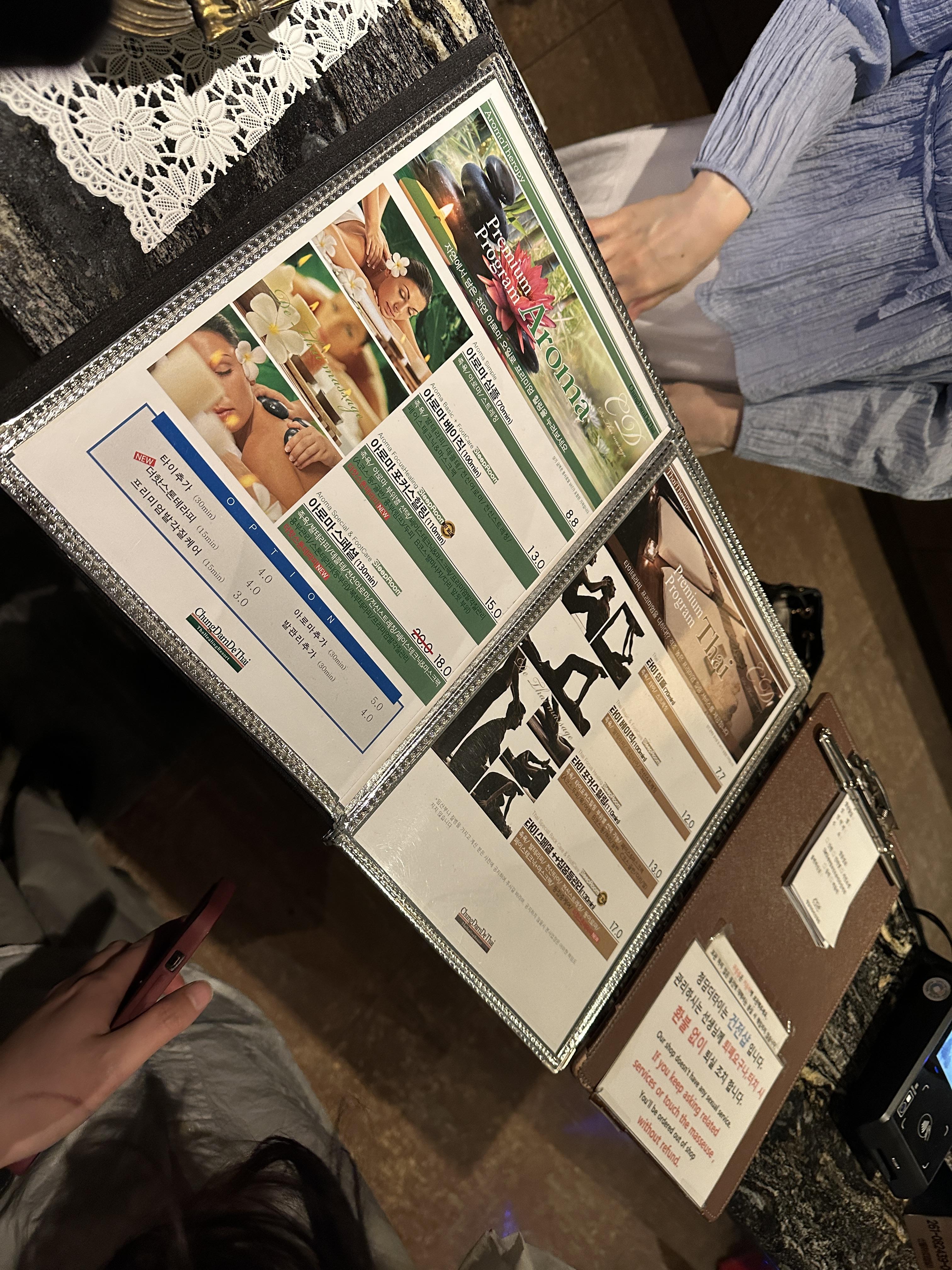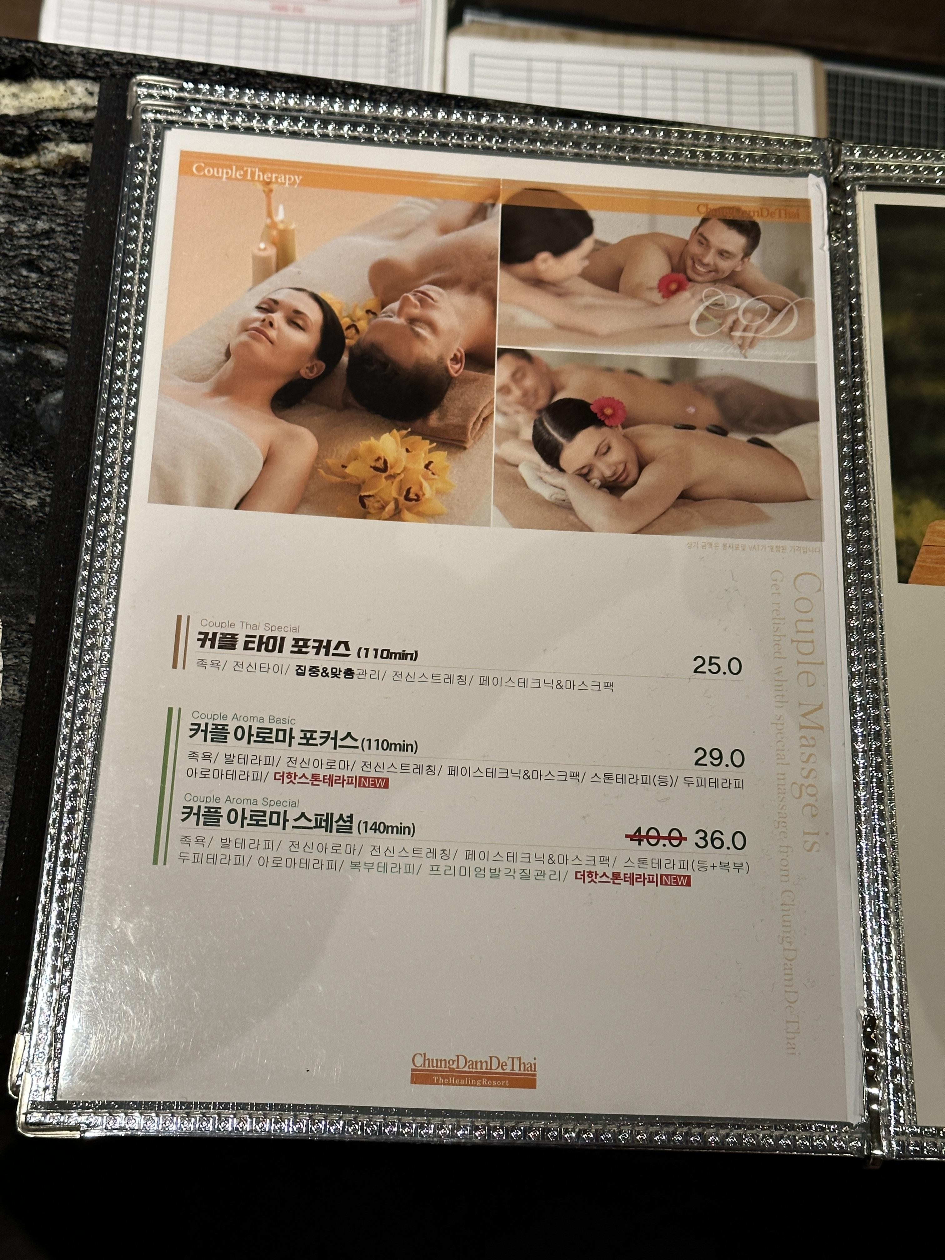 청담더타이 건대점은 입장과 동시에 상큼한 냄새가 퍼져 나오고, 뭔가 신비로운 느낌을 줍니다. ㅎㅎㅎ 입장 후 코스를 선택하는데, 저희는 커플 타이 포커스 25만 원짜리 코스로 110분간 진행했습니다.