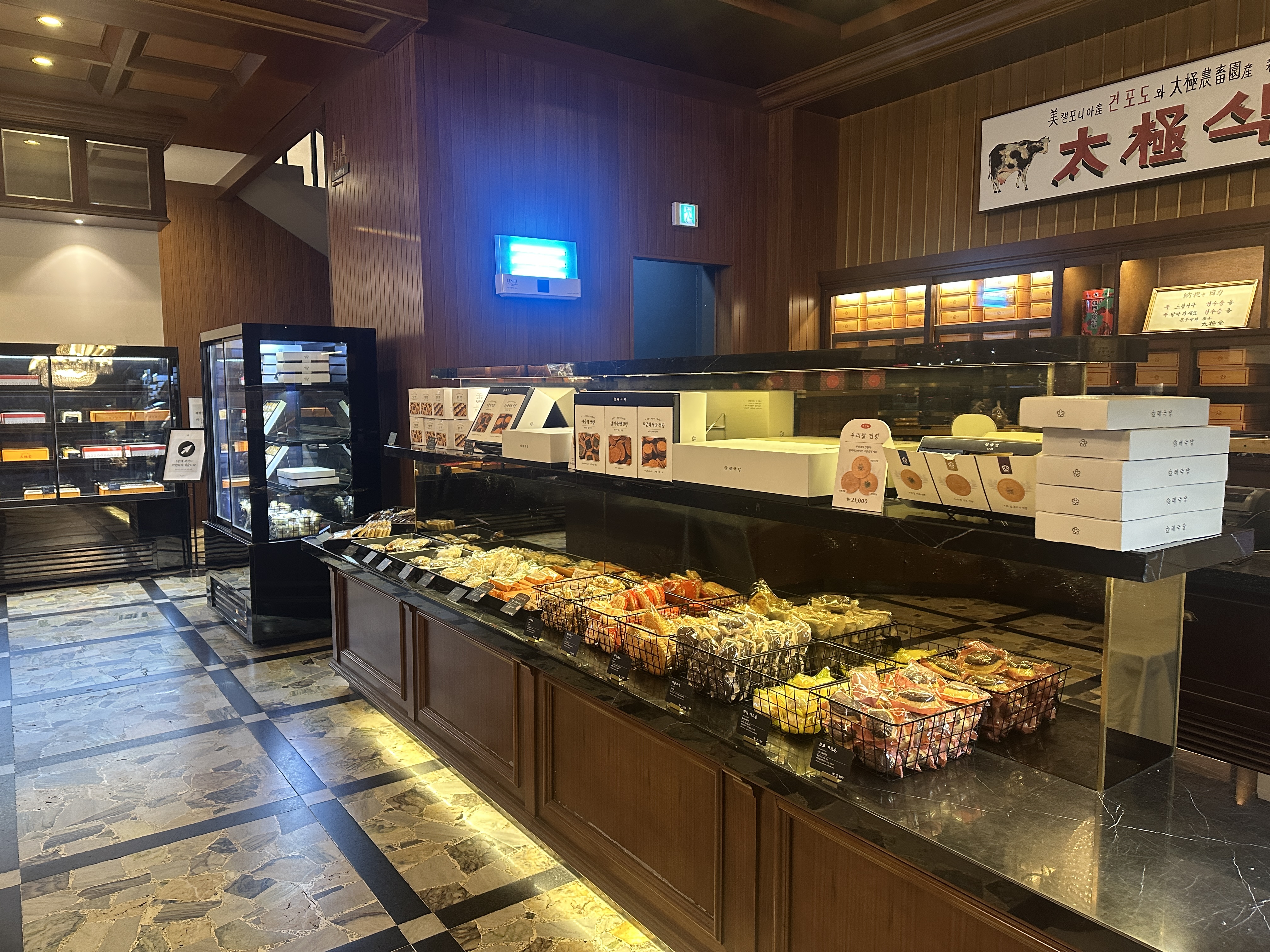 동대입구역 태극당의 실내입니다. 한 켠의 선물세트가 눈에 띕니다. 가격은 조금 있는 편이지만, 클래식한 디자인이 너무 마음에 듭니다. ㅋㅋ 2층으로 올라가는 계단도 있네요. (시간이 조금 애매해서 2층 사진은 못찍었어요.)