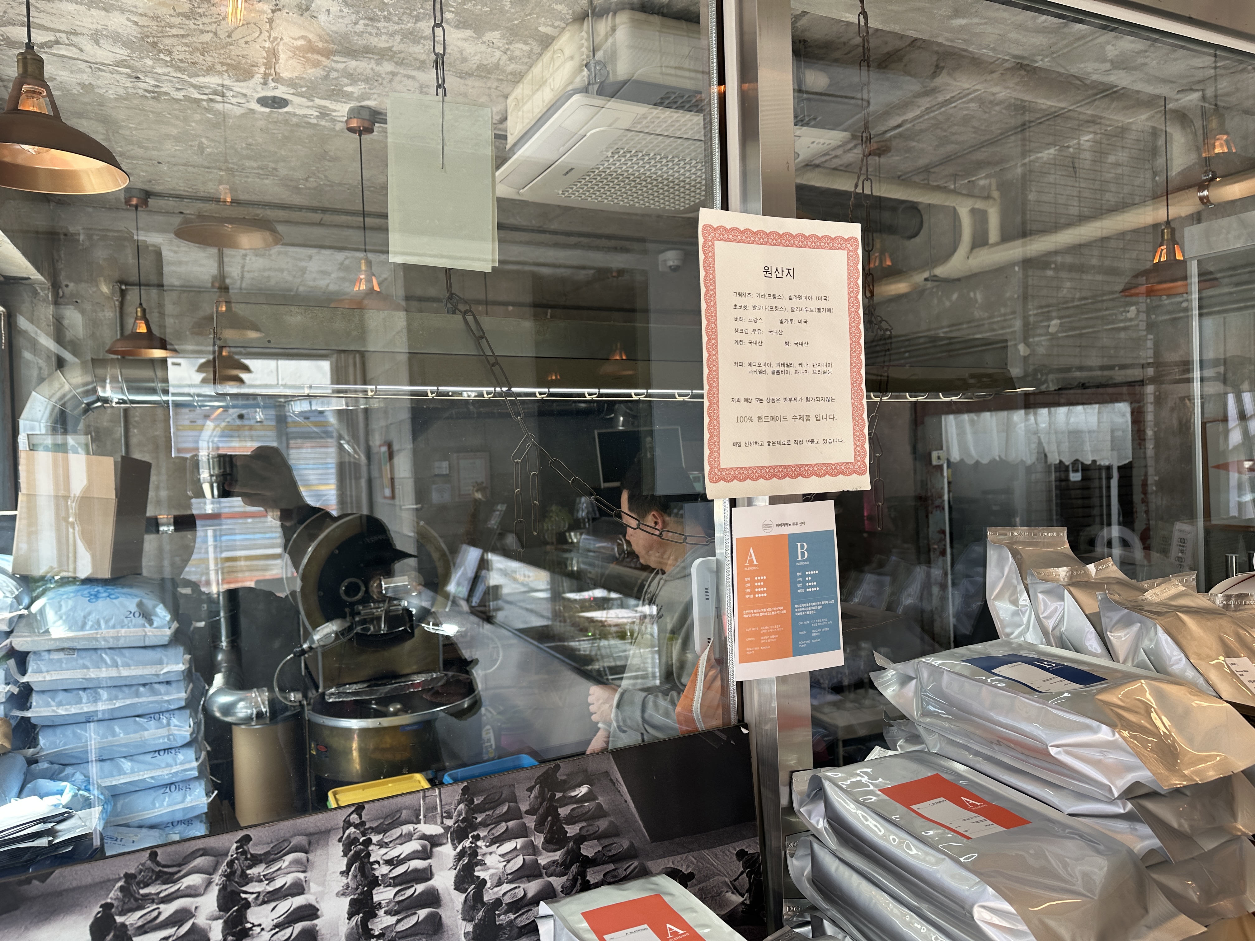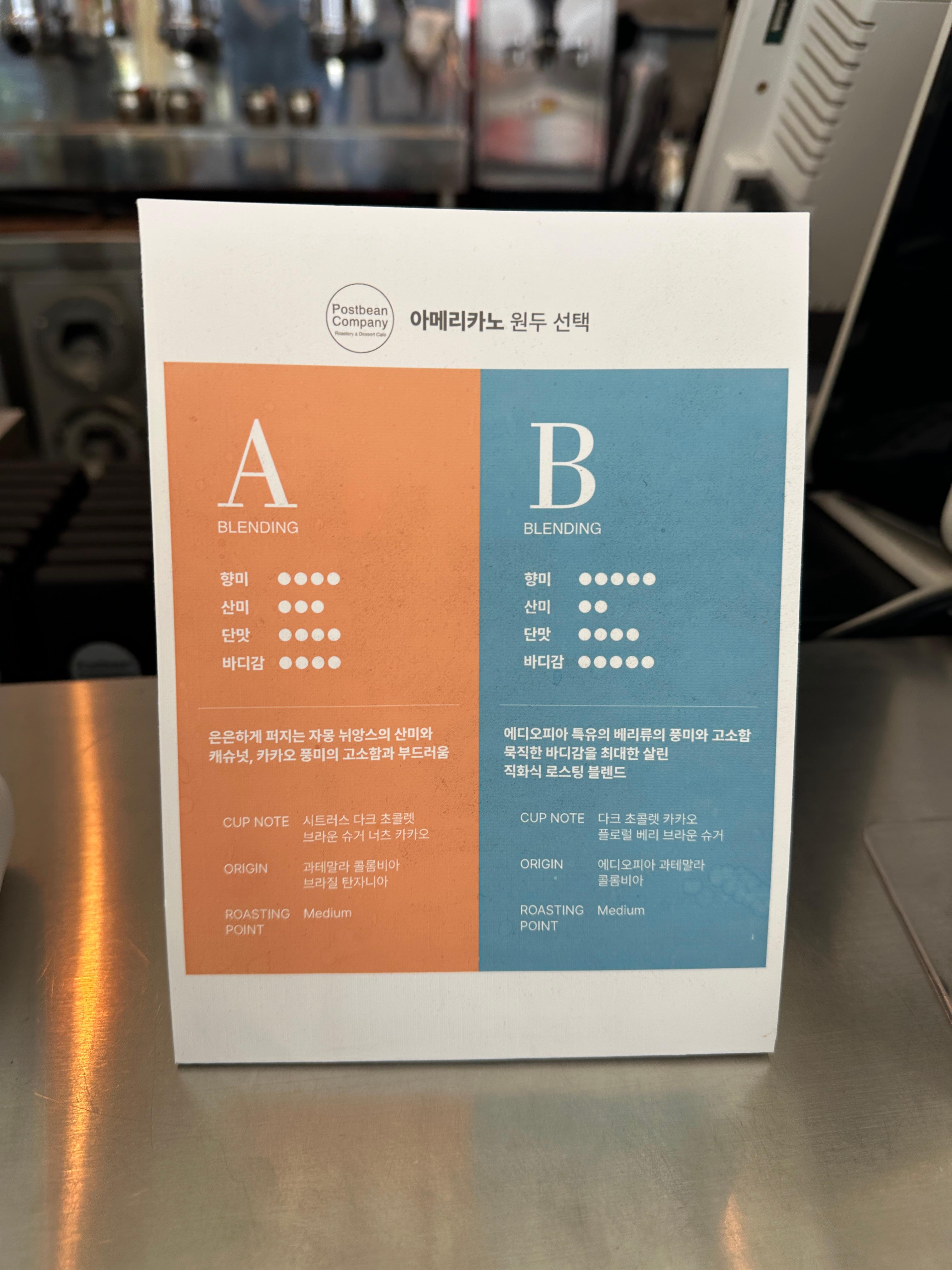 주문을 하는데, 저 콩 더미를 보고 다른 커피를 주문할 수가 없었습니다. 바로 아메리카노 주문했는데요, A/B 한 잔씩 친구와 주문했습니다. 저는 A를 마셨는데, 솔직히 맛있었습니다. 약간 산미가 많이 느껴지는 커피였어요.