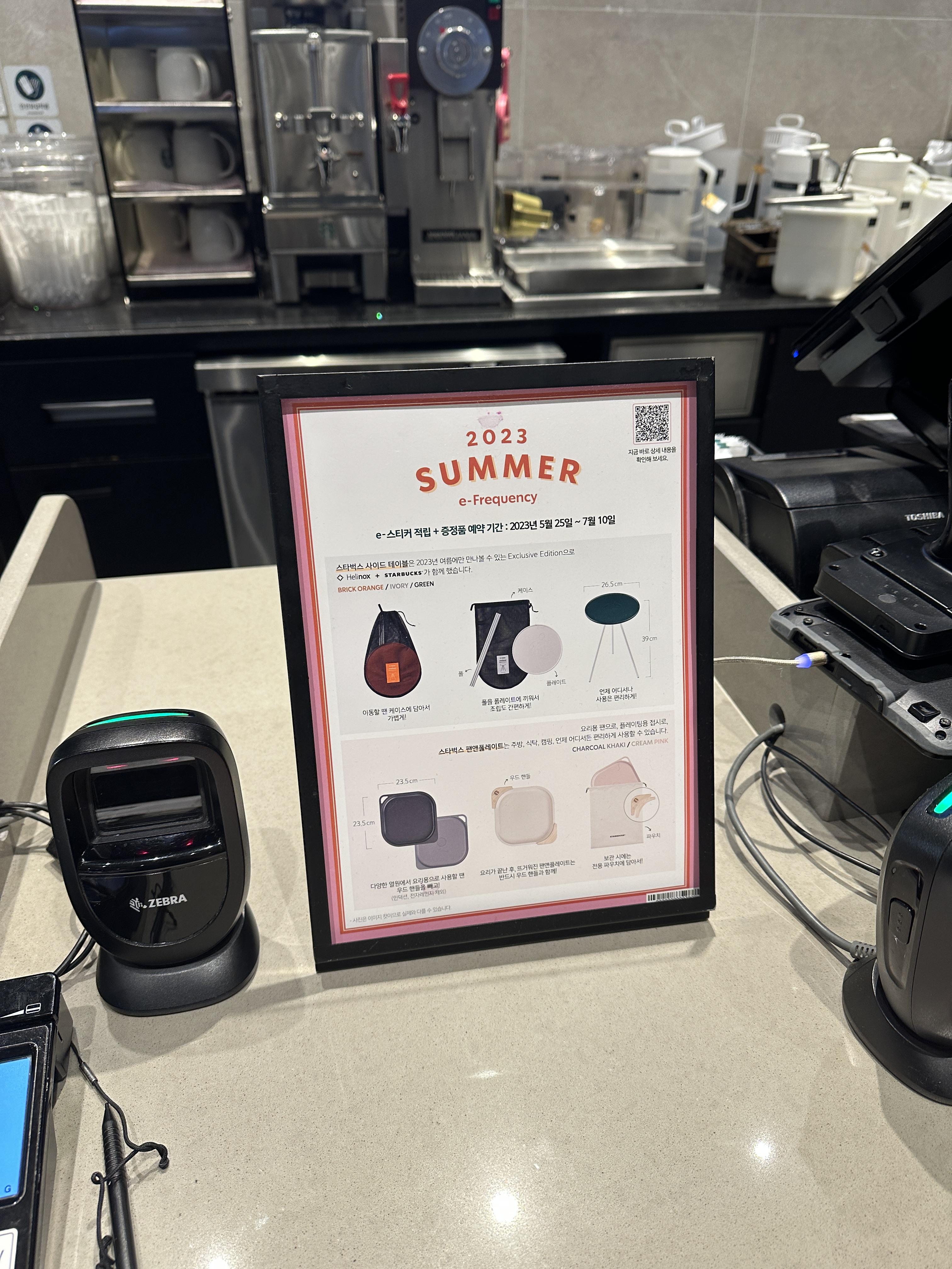 군자역점에 들어가면, 이렇게 계산대 바로 앞에 2023 스타벅스 서머 e-프리퀀시 증정품 관련 정보가 떡하니 있습니다. ㅋㅋㅋ