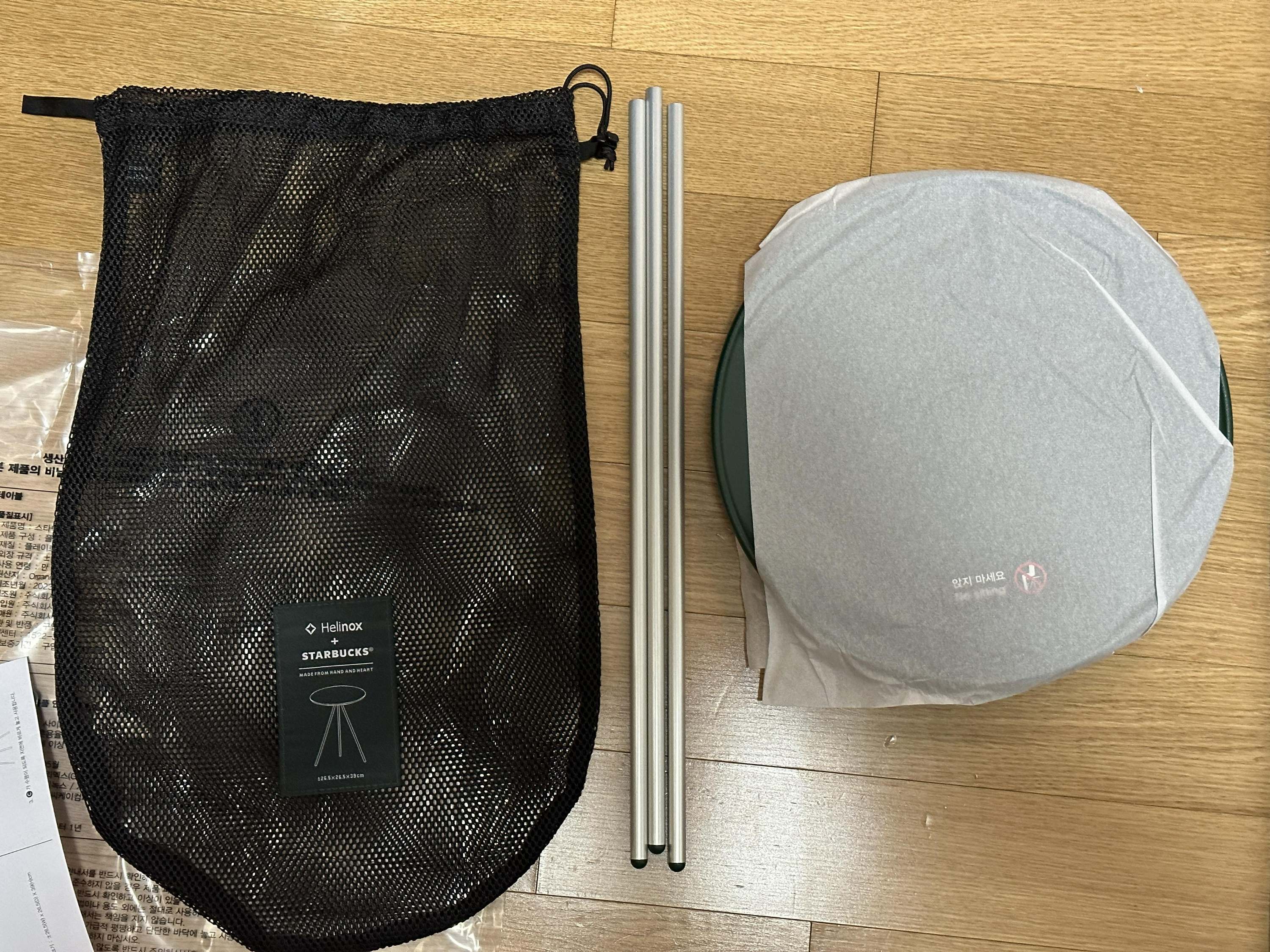 2023 스타벅스 서머 e-프리퀀시 증정품 사이드테이블 그린의 구성품은 특별할 건 없습니다. 테이블 상판, 폴대, 케이스. 이것이 전부입니다. ㅋㅋㅋㅋ 폴대 등에 찍힐 수 있는 상판을 나름 보호하려고 노력한 흔적이 보입니다.