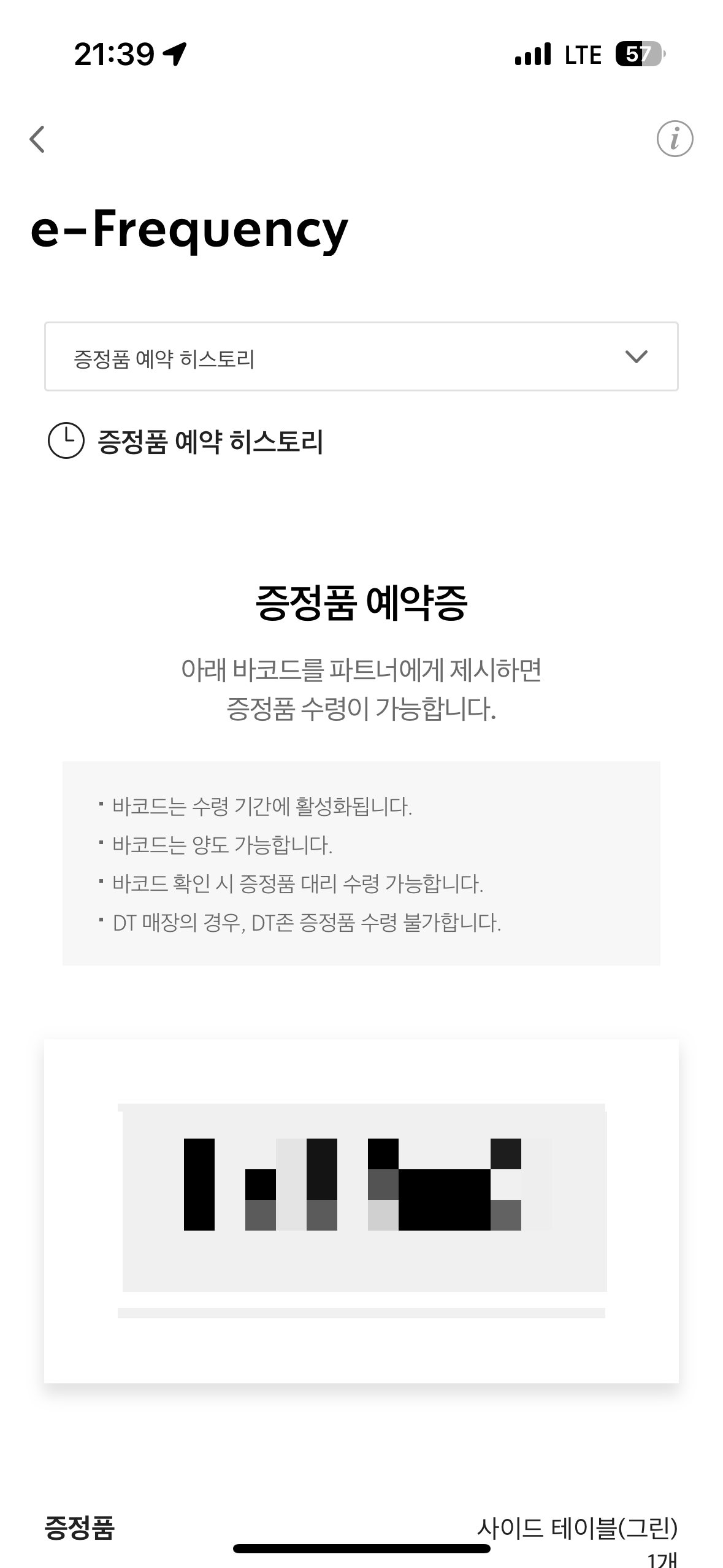 테이블의 신청내역 확인은 프리퀀시 정보 화면에서 가능합니다. 증정품 예약하기 아래에 보면, '증정품 예약 히스토리'라는 버튼이 보이죠? 그곳에 들어가시면 증정품 예약증을 확인하실 수 있습니다.