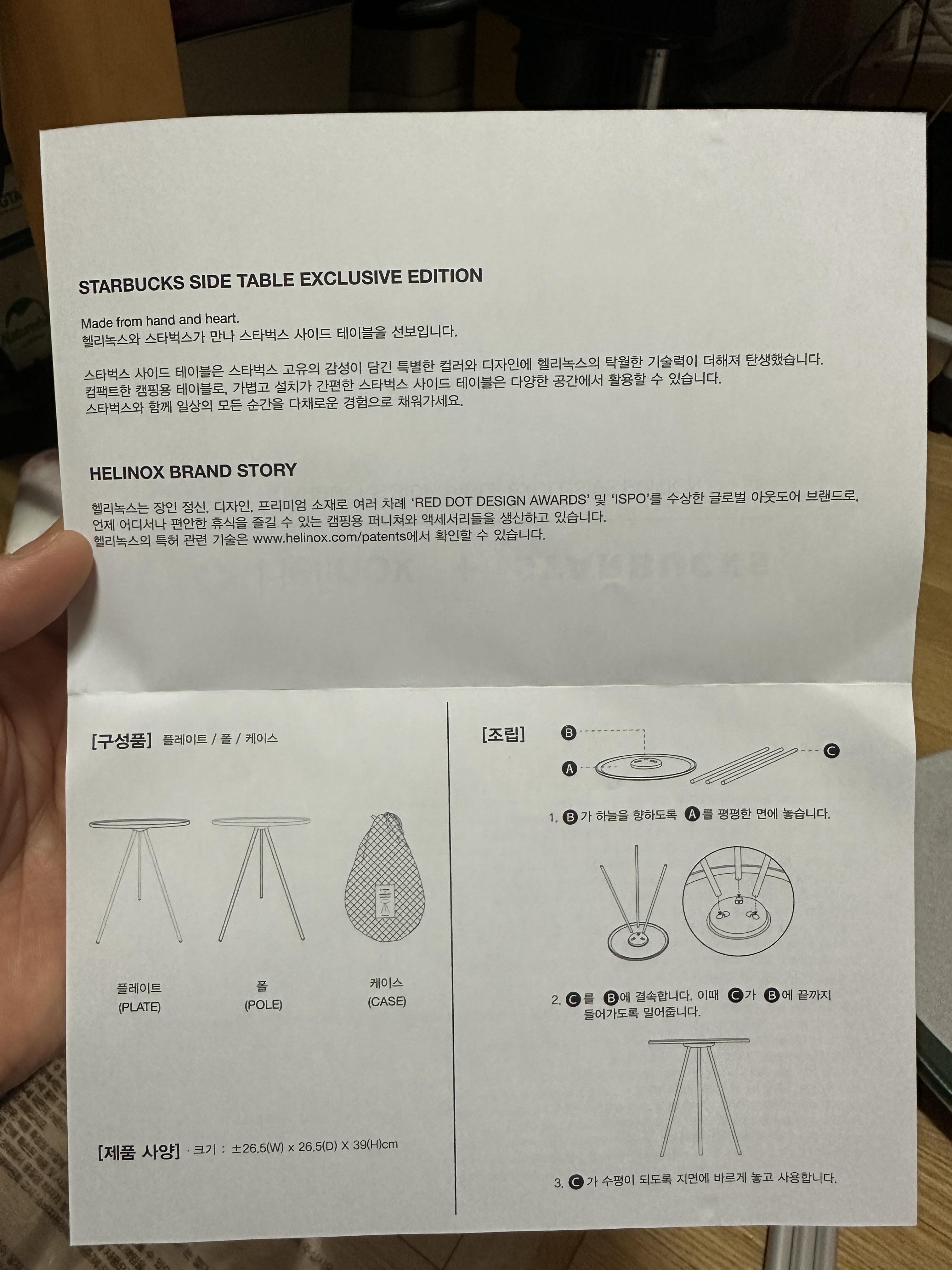 간단한 구성품 내역 및 안내사항, 테이블 조립법 등이 있는 설명서가 들어 있습니다. 헬리녹스가 떡하니 박혀있는데, 스타벅스라니... 스벅 주주로써 기분이 좋습니다. (물론, 스타벅스 코리아는 해당 없는 미국주식이긴 하지만요....ㅋㅋㅋ)