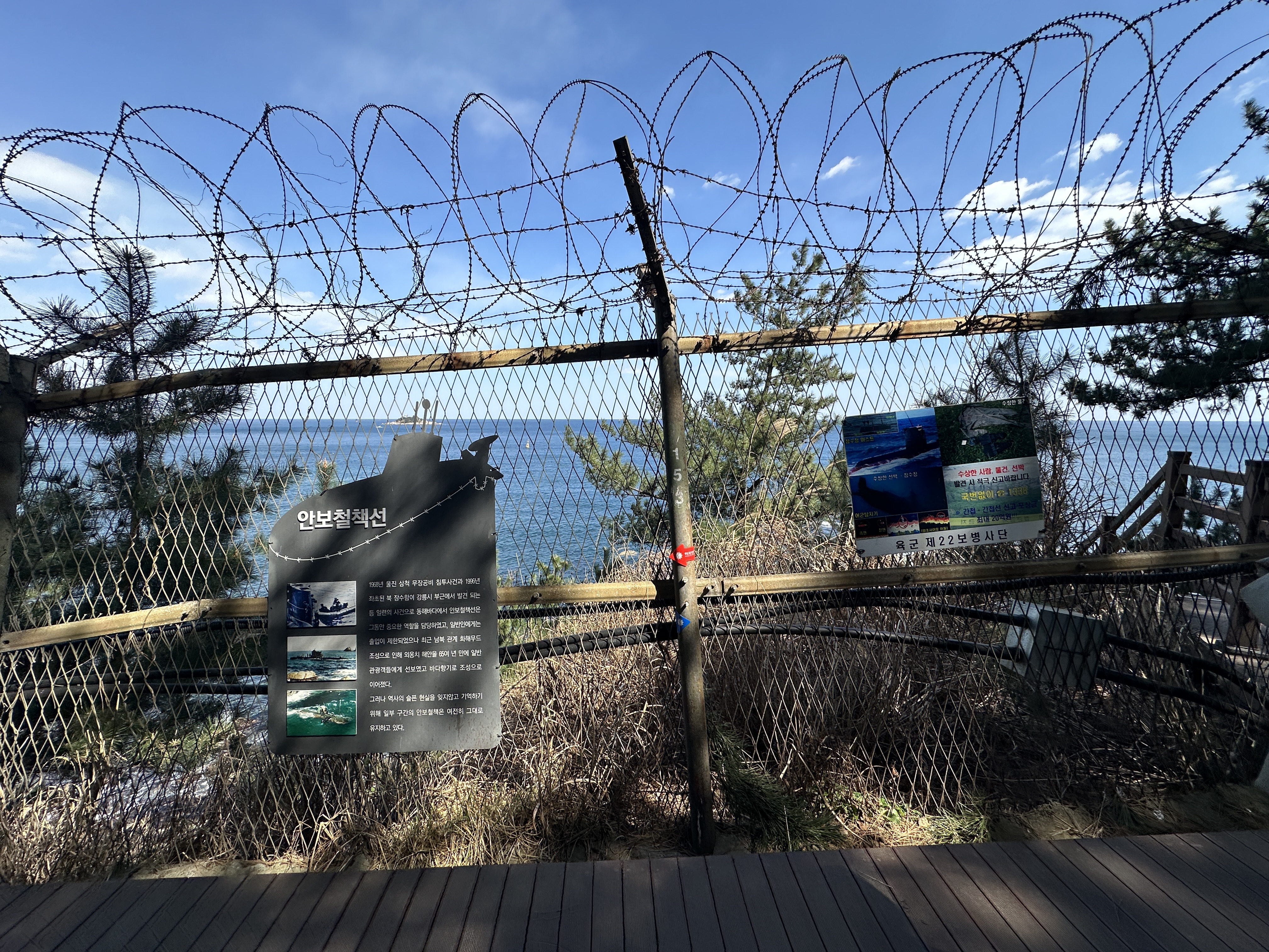 어느덧 철책이 보이는 길까지 왔습니다. 외옹치바다향기로의 한 부분인데요, 이 곳에서 과거 간첩들과의 이슈가 있었다고 합니다. ㅎㄷㄷ 저 바다를 넘어서 왔다는 게 대단하기도 하고 무섭기도 하네요...