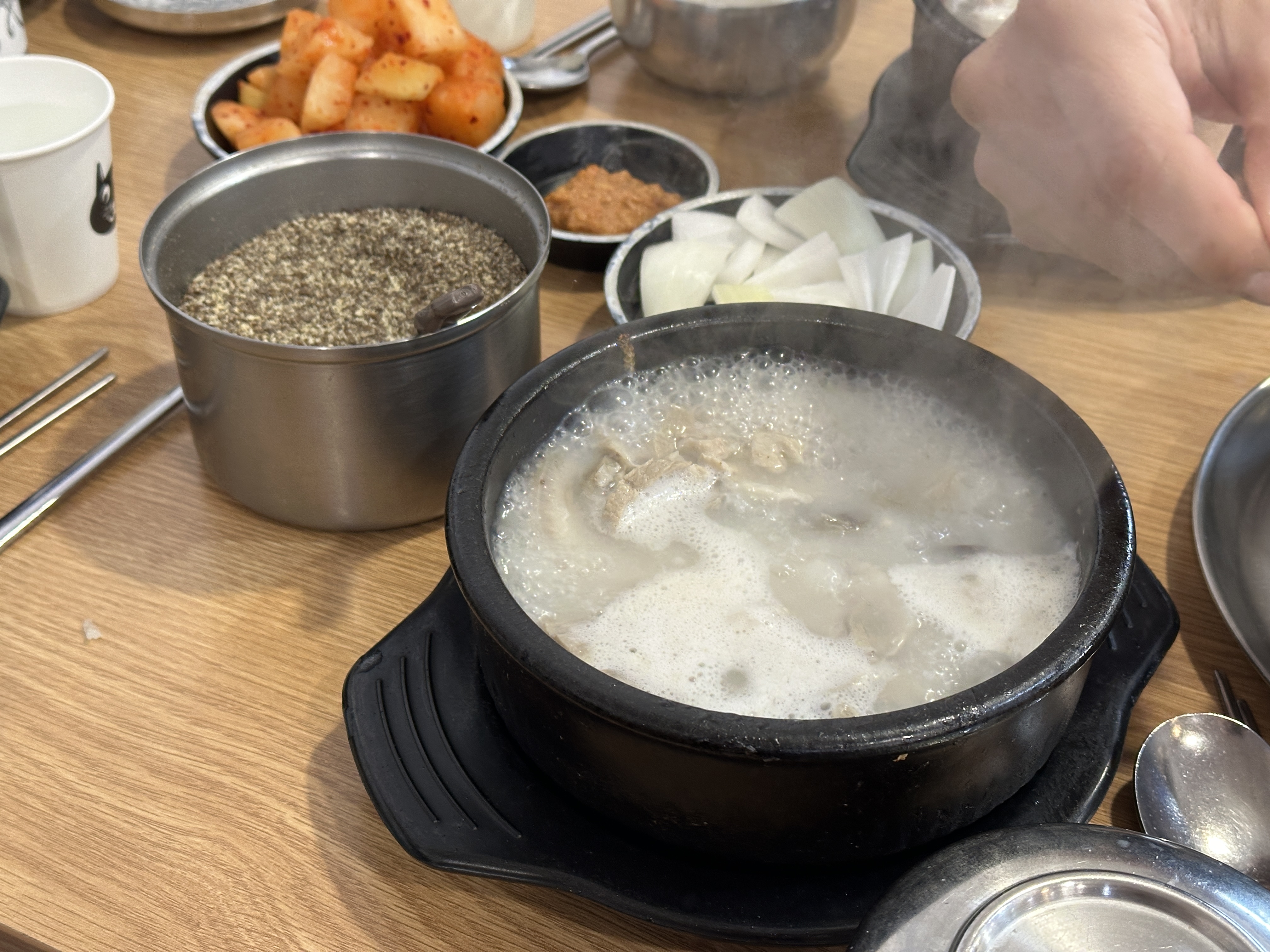 종각역 청진동장터순대국 테이블에는 이렇게 조미료가 있습니다. 파, 고추, 마늘, 양념장, 새우젓, 들깨가루, 깍두기까지 그야말로 DIY에 완벽한 구성입니다. ㅋㅋㅋ 두근두근
