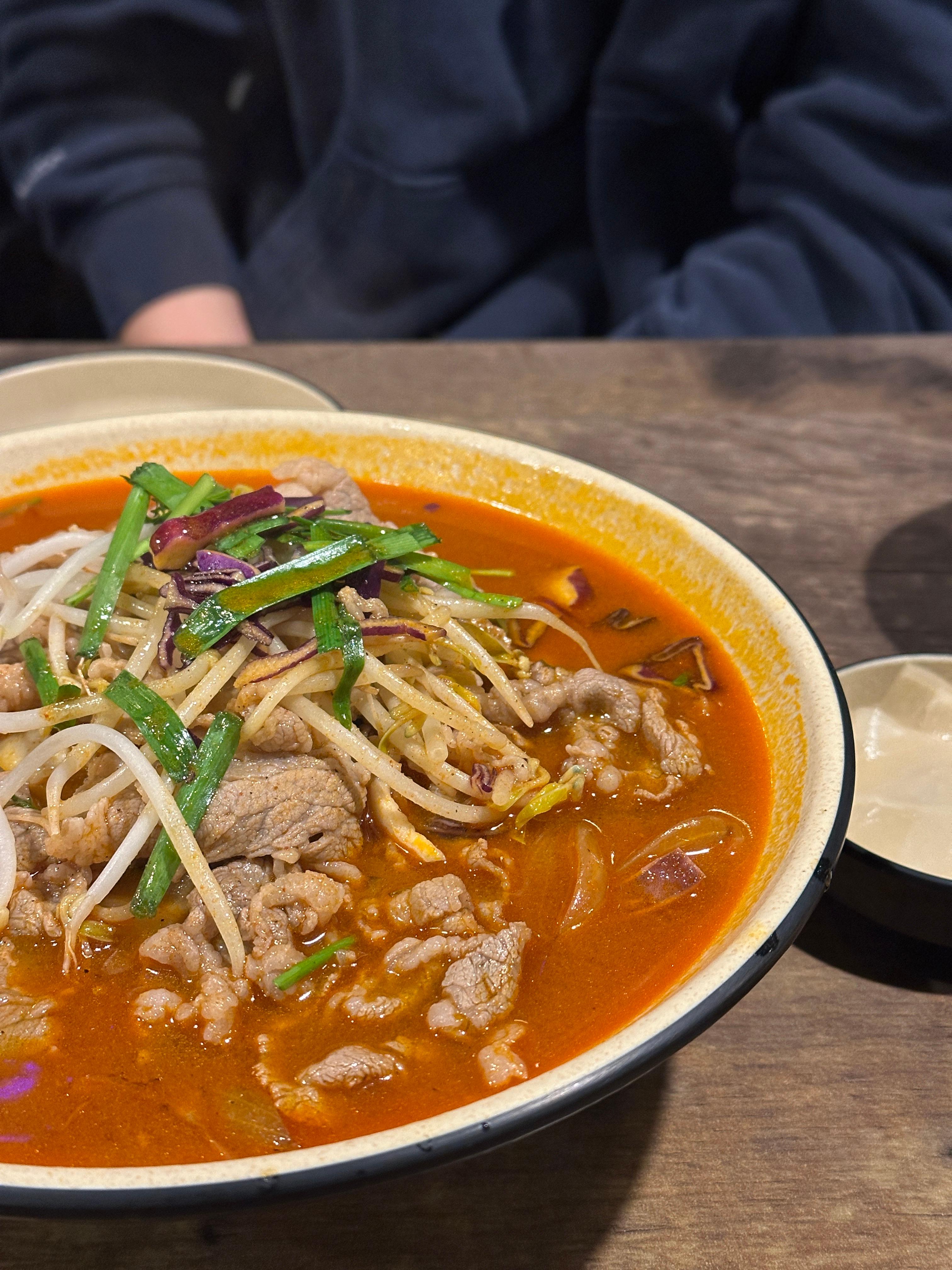 한강진역 중식 전문점 한남동 자리의 차돌짬뽕입니다. 그릇이 조금 얕은 감이 있어서 양이 많다 적다 판단하긴 약간 애매한 부분이 있지만, 둘이 먹었는데 탕수육과 같이 시키니 부족하진 않았습니다.