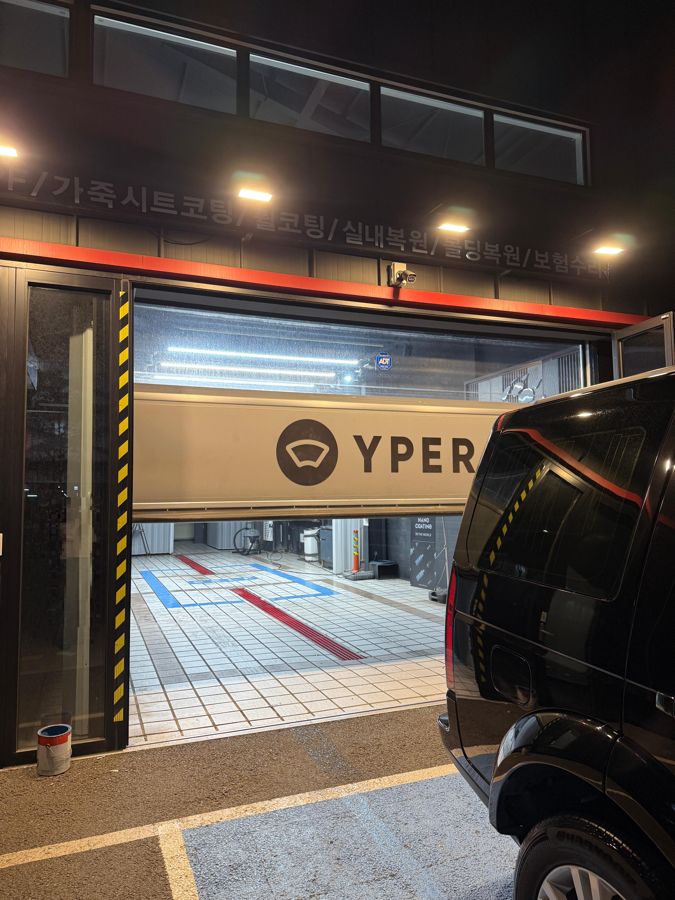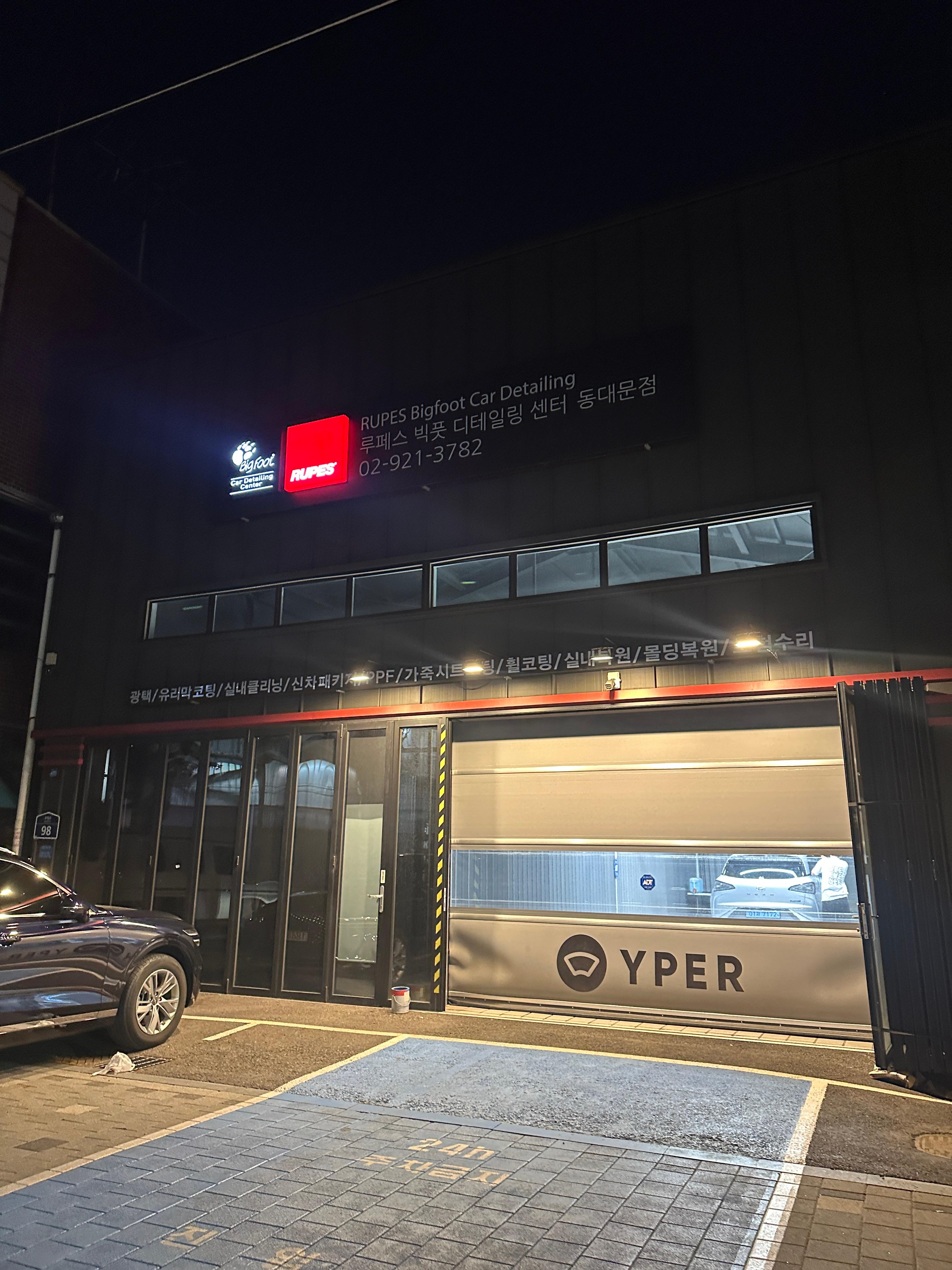 단독으로 이용하는 루페스빅풋 디테일링센터 동대문점은 사진과 같이 외부에 YPER라는 마크가 떡하니 새겨져 있습니다. 파란색 칸에 차를 대면 문이 열리고 진입이 가능합니다. 제가 도착했을 때는 손님이 이용중이셔서 옆쪽에 대기해야 했습니다. (근데 다른 차들도 주차를 하는 모양이에요ㅠ)