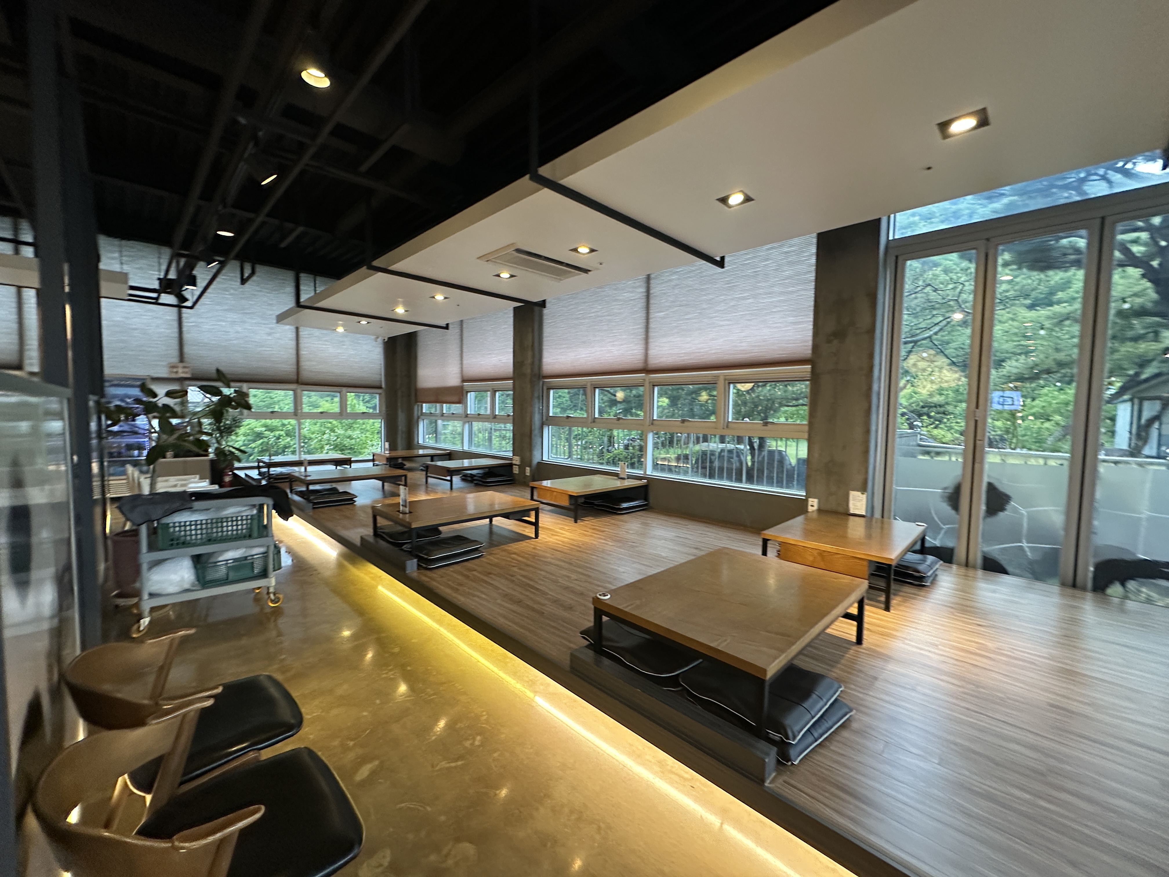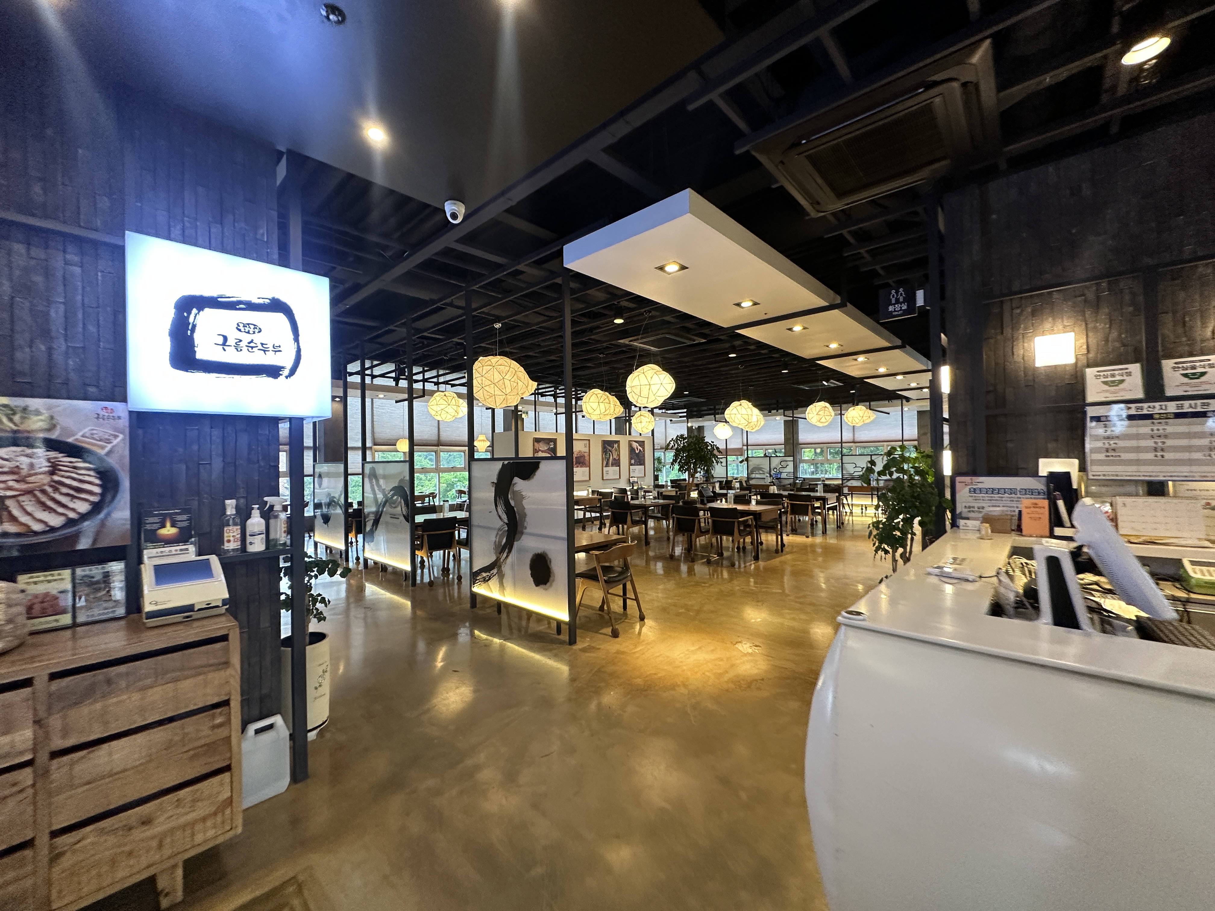 팔공산자락 초대형 식당, 몽글몽글구름순두부의 실내입니다. 테이블 간격 오케이! 매장의 인테리어 역시 합격입니다. 신발을 벗고 올라가는 좌석도 있어서 아이들을 데리고 오시는 분들 역시 이용이 편해 보입니다. (오픈시간에 가까운 시간이라 손님이 없네요)