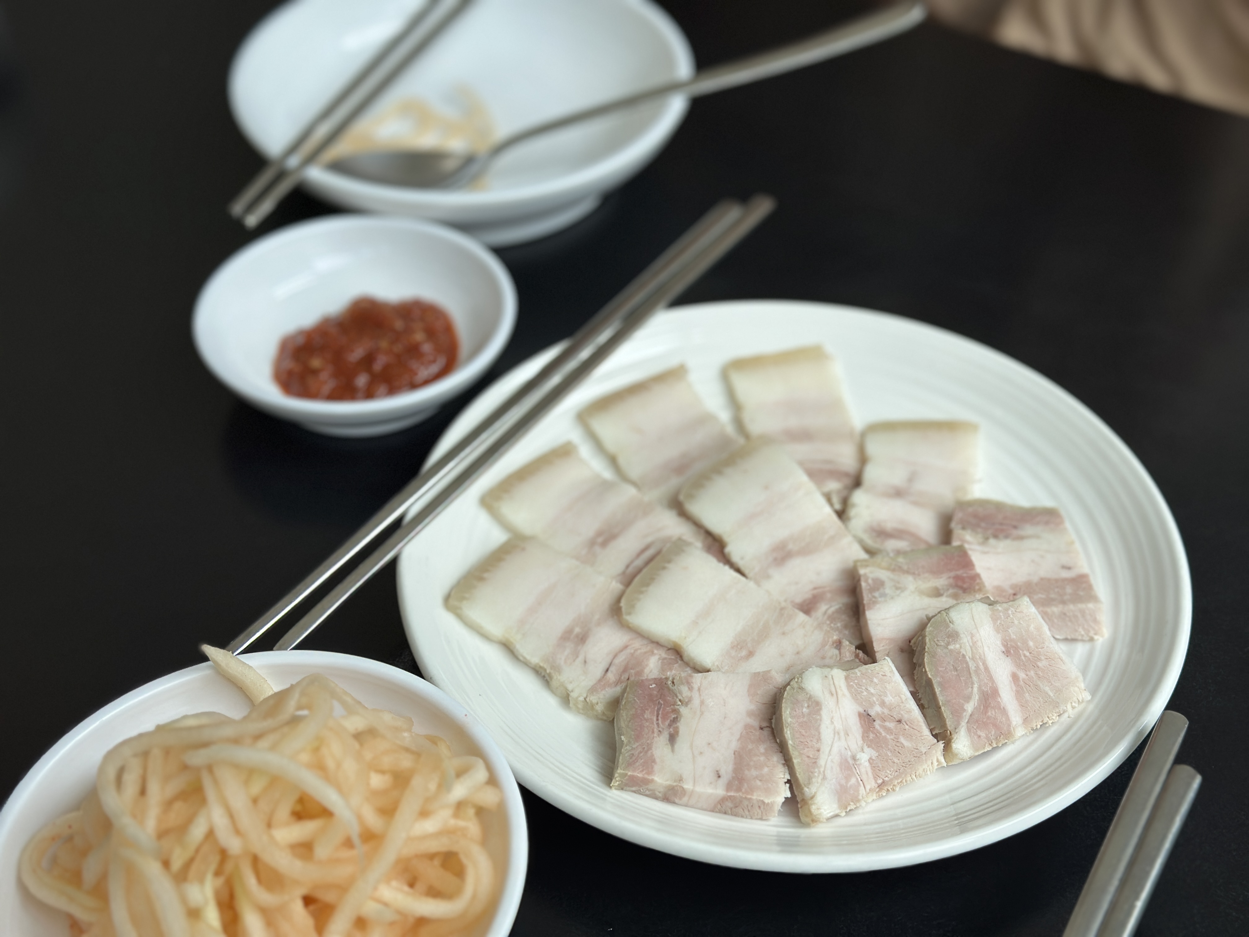 제육은 1접시가 이렇게 등장합니다. 냉제육이기에 색깔이 뽀얀게 마음에 쏙 듭니다. 고기 육질도 좋고, 비계 비율도 좋아 퍽퍽한 감도 없어서 순식간에 먹어치울 수 있어요.